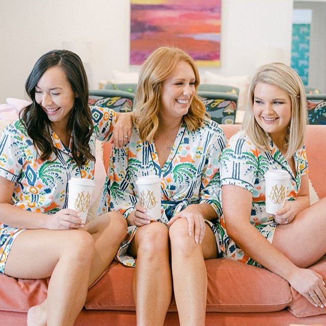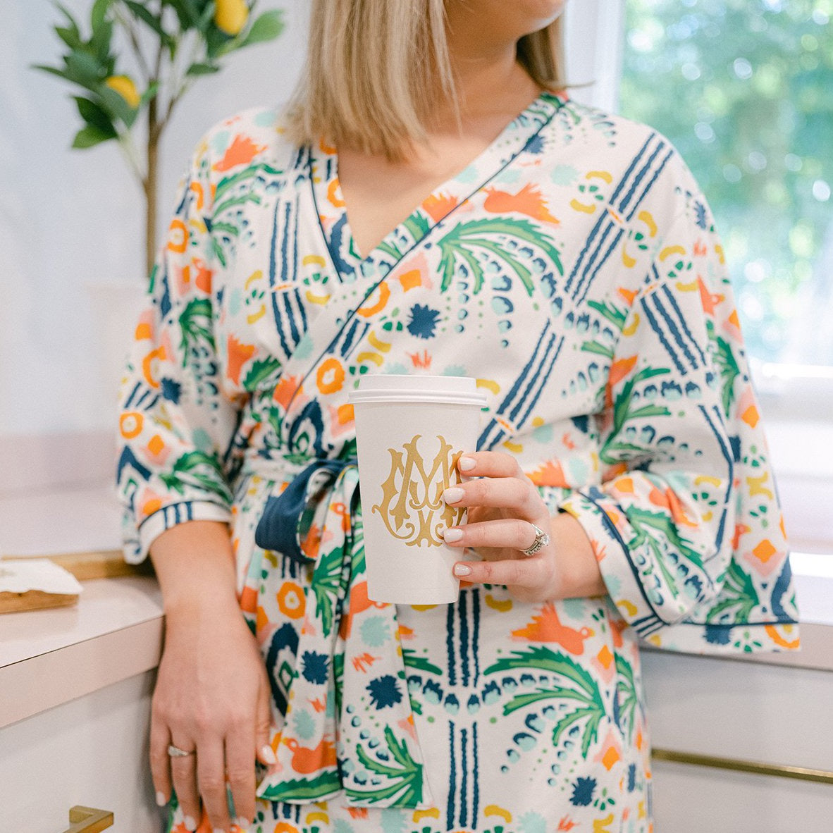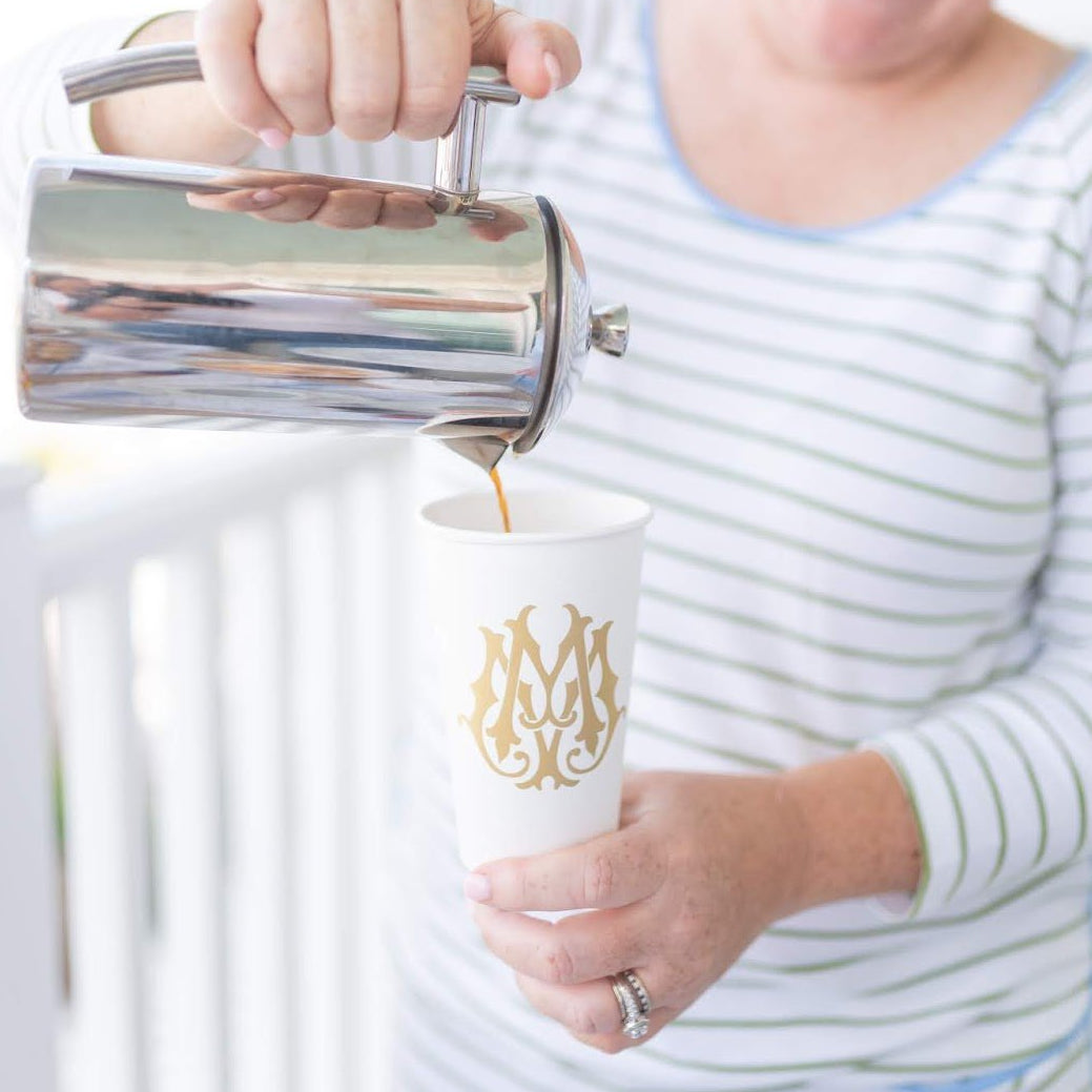 A set of 10 paper to-go coffee cups and lids printed with our 1-letter interlock style in gold. Perfect as a gift or for your own home. Choose your featured initial for your cup set.