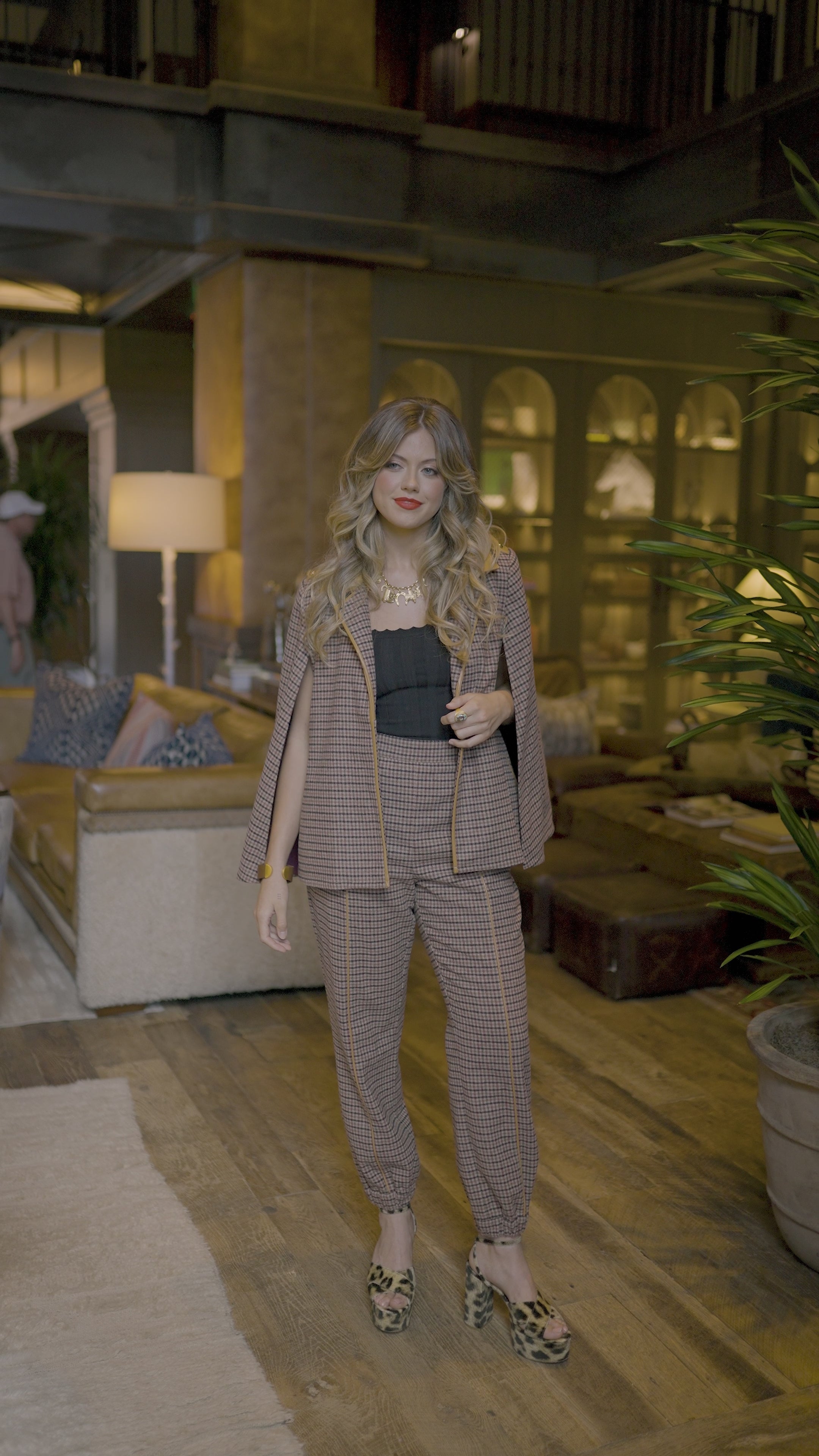 The Addison Jogger gives a modern update to a casual classic. Designed with an elastic waistband finished with tab details and gold snap buttons, this style blends comfort with polish. Elastic ankle cuffs create a tapered shape, while pressed front seams elongate the leg for a more tailored effect. Crafted in a wool-blend fabric with a classic check pattern, the jogger is elevated with vegan leather trim along the front seams and back welt pockets. Both slimming and chic, the Addison Jogger is an effortless blend of heritage fabric and contemporary design.