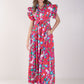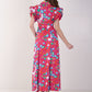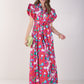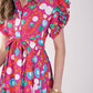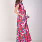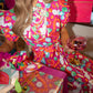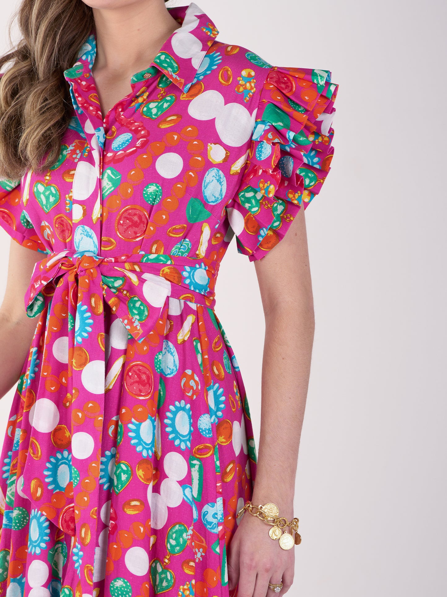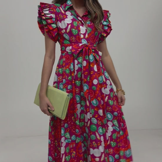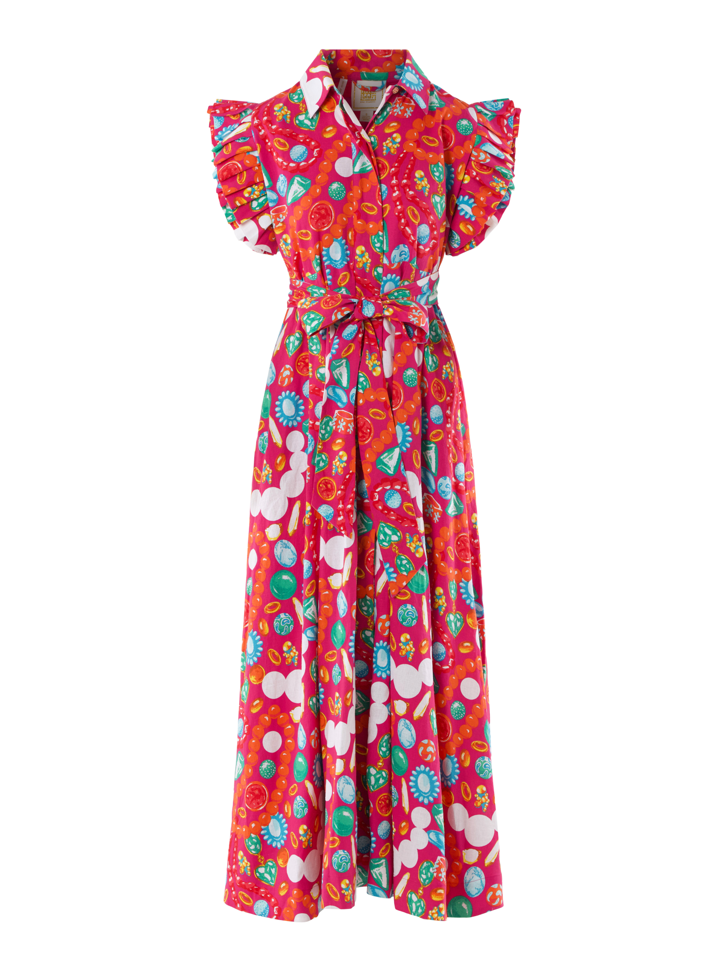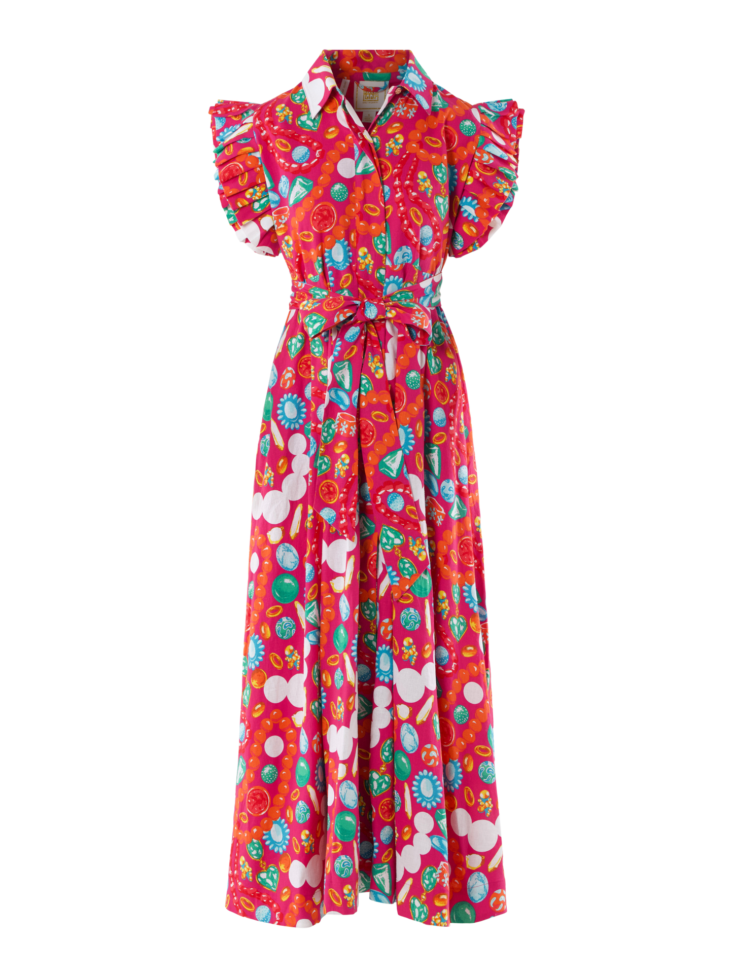 The Anderson Maxi in Jewelry Box is a vibrant showstopper designed to celebrate bold femininity. Featuring a classic fold collar, pleated ruffle sleeves, and signature gold button closure, this dress blends timeless tailoring with expressive detail. A self-tying detachable belt cinches the waist for a flattering silhouette. The Jewelry Box print is a playful homage to Iris Apfel, capturing her iconic love for colorful, oversized jewels and unapologetic accessorizing.
