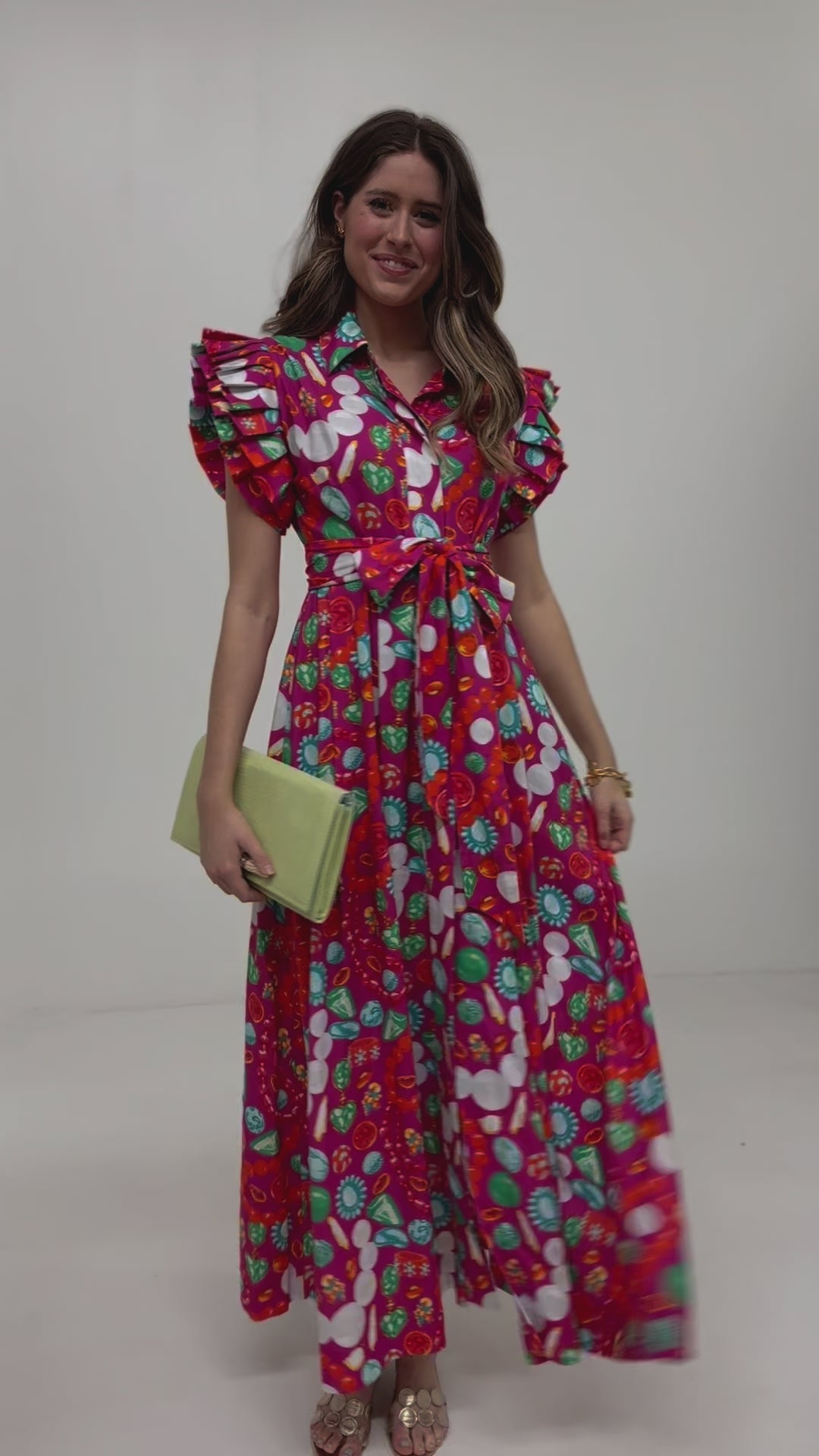 The Anderson Maxi in Jewelry Box is a vibrant showstopper designed to celebrate bold femininity. Featuring a classic fold collar, pleated ruffle sleeves, and signature gold button closure, this dress blends timeless tailoring with expressive detail. A self-tying detachable belt cinches the waist for a flattering silhouette. The Jewelry Box print is a playful homage to Iris Apfel, capturing her iconic love for colorful, oversized jewels and unapologetic accessorizing.