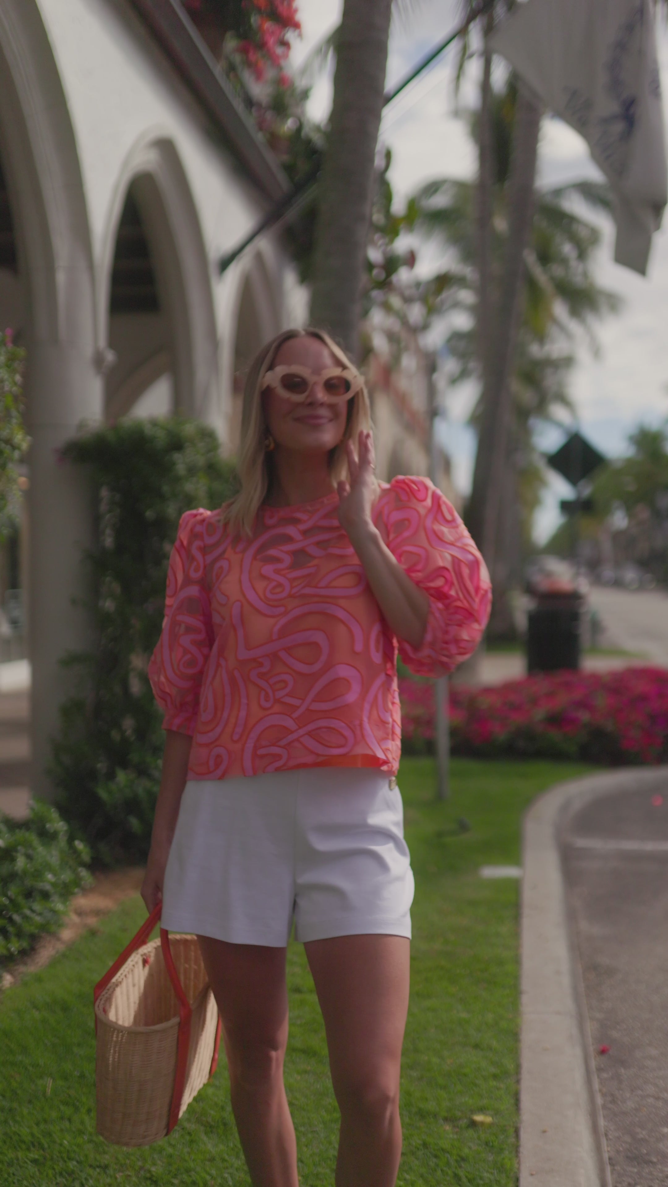 Spreading joy in a literal sense, the Bella Top in Joy/Coral has a way with words. This captivating piece is crafted in sheer, lightweight organza, creating a delicate and ethereal look. The word "joy" is stitched in a whimsical cursive script, appearing as a playful, curly design. A classic round neckline is completed in the back with a self-tying bow, adding a touch of feminine charm. Romantic puff sleeves add volume and drama, creating a flattering silhouette. Add this whimsical and airy top to your spring wardrobe for fun and elevated style!