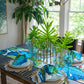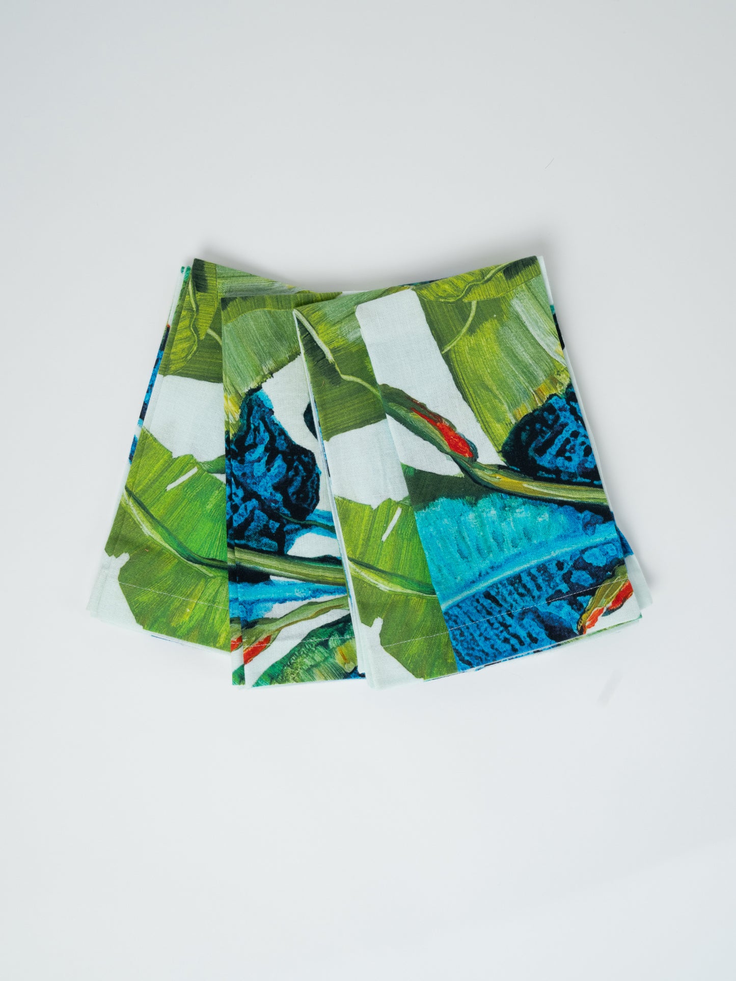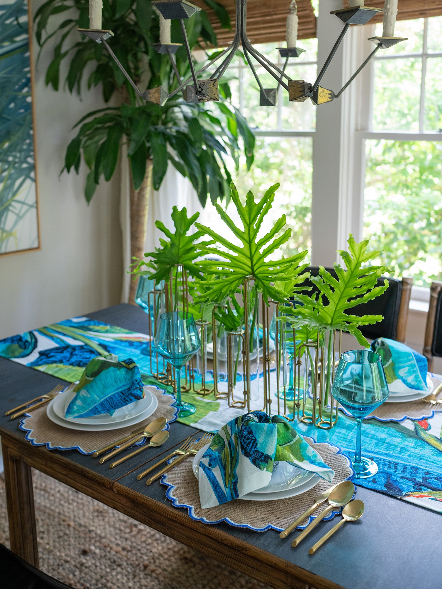 Bring painterly elegance to your place settings with the Bellamy Leaves Dinner Napkins, featuring a bold and expressive banana leaf motif translated from the original artwork of Lowcountry artist, Bellamy. With vibrant blues and deep greens, each napkin feels like a mini masterpiece—perfect for creating a statement at any meal. Pair them with the full Bellamy Leaves tabletop collection, including the coordinating tablecloth, table runner, and cocktail napkins, for a layered and cohesive look. And for the hostess who loves to match, coordinate your look with our collaborative summer collection—so your outfit can be just as artful as your table.