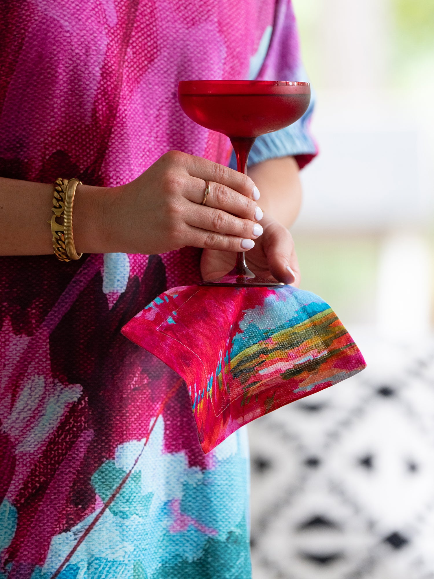 Add a burst of color to your gathering with the Bellamy Sunset Cocktail Napkins, showcasing vibrant, painterly strokes from Bellamy’s original sunset-inspired canvas. Bold and joyful, they’re the perfect pop for your bar cart, cocktail hour, or festive dinner party. Style with the coordinating Bellamy Sunset tablecloth, runner, and dinner napkins, and complete the look with matching pieces from our exclusive summer clothing collaboration with Bellamy.