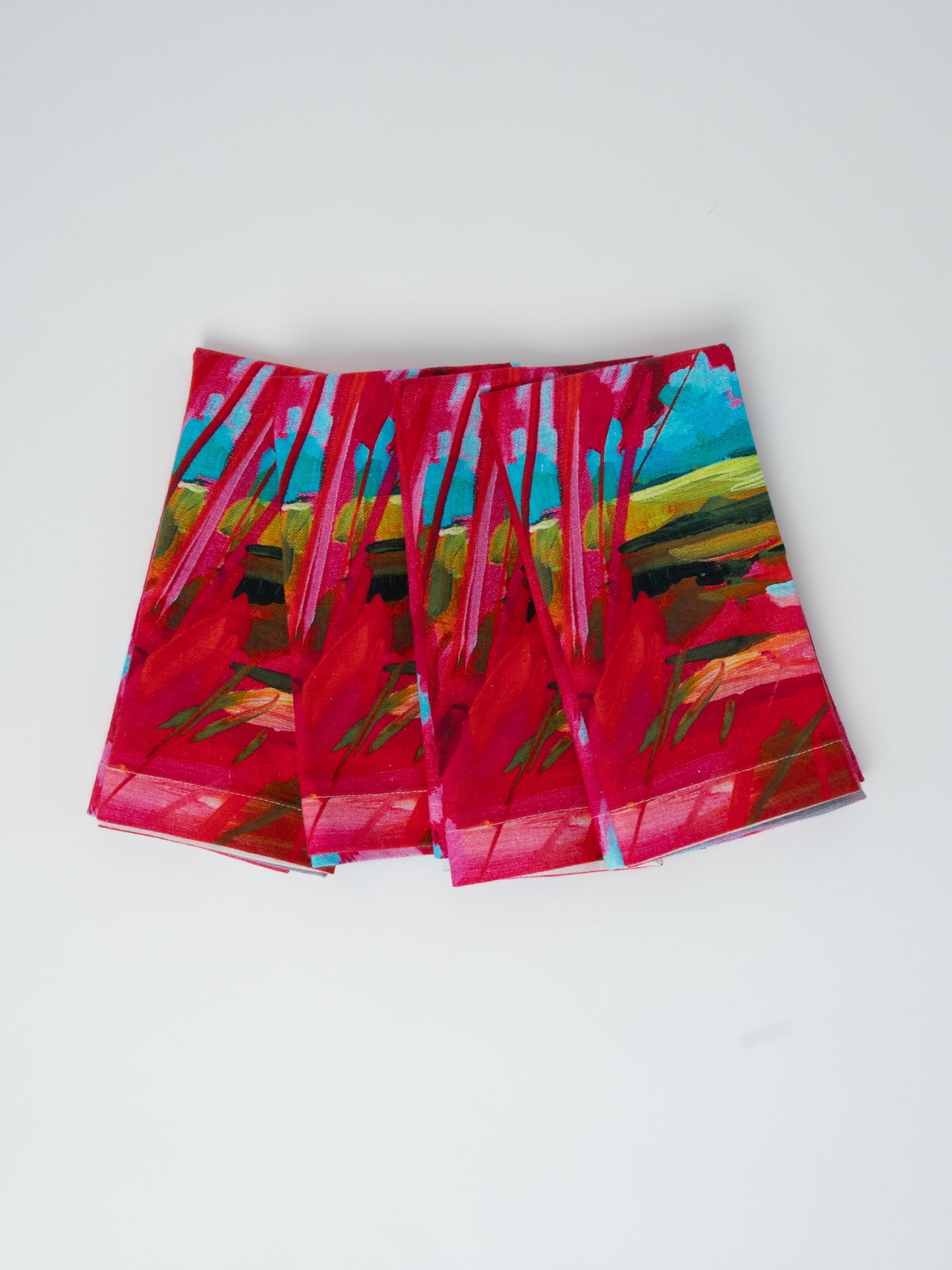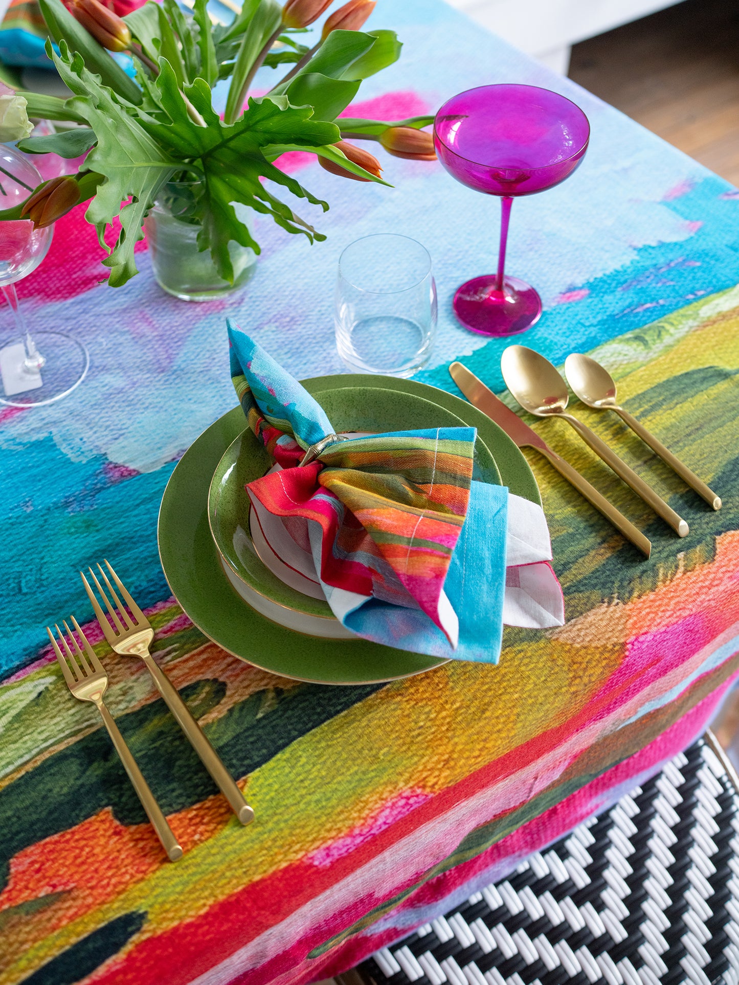 Infuse your table with vibrant color and artistic flair using the Bellamy Sunset Dinner Napkins, a lively design inspired by the painted skies of a Lowcountry evening. Originally created as a hand painted canvas by beloved artist Bellamy, this energetic print bursts with bold vibrant strokes, making each napkin a joyful nod to the magic of a Lowcountry sunset. Style them alongside the coordinating tablecloth, runner, and cocktail napkins for a layered, gallery-worthy table setting. And for a truly unforgettable hosting moment, pair with a matching outfit from our collaborative collection designed in the same radiant print.