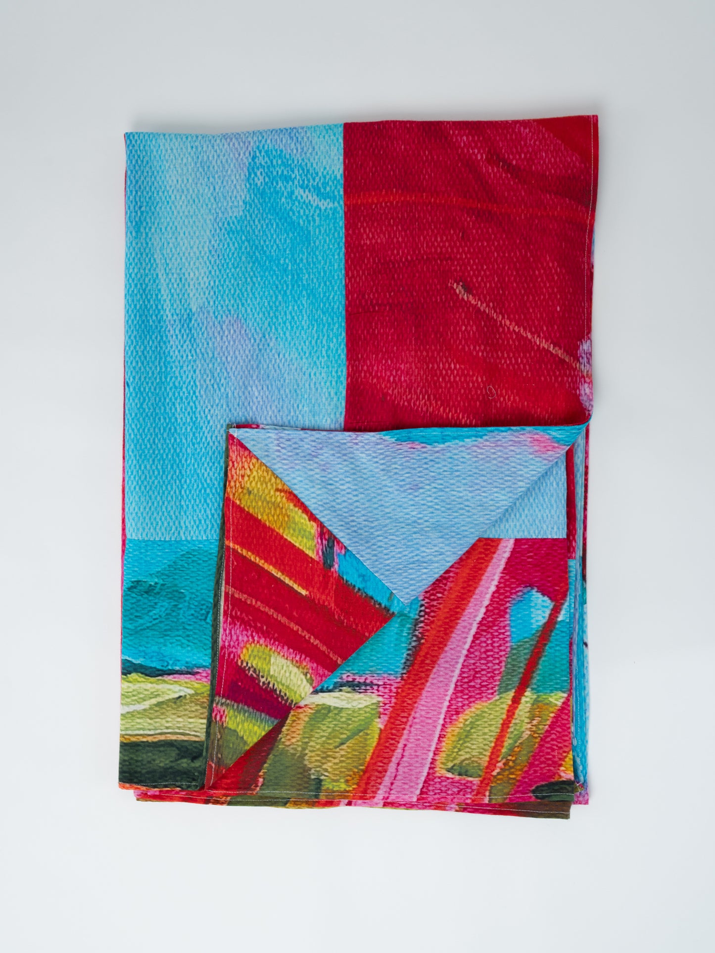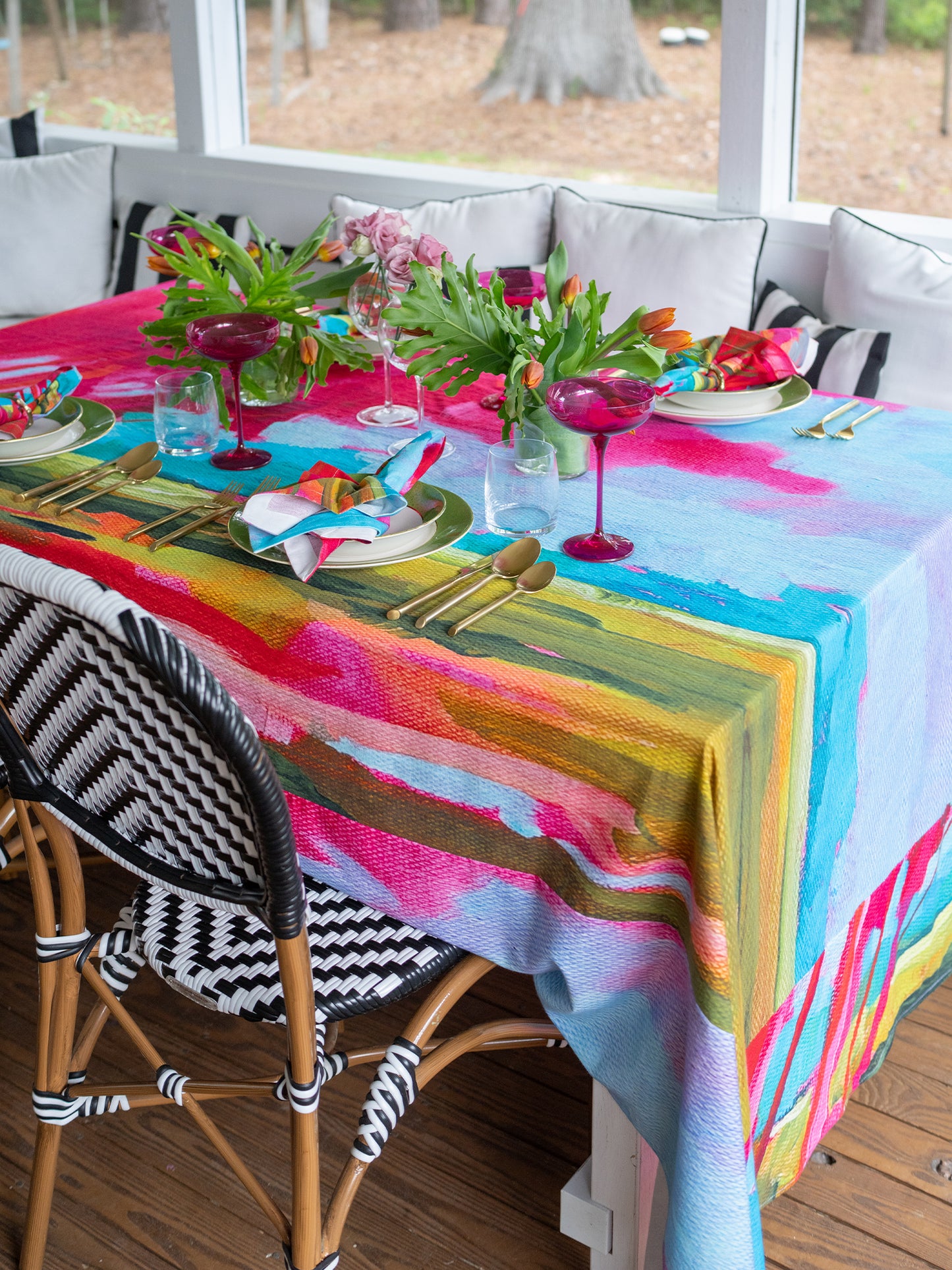 Bring bold color and artistic energy to the table with the Bellamy Sunset Tablecloth, a dazzling translation of Bellamy Murphy’s original handpainted canvas. Radiating in rich fuchsia, electric turquoise, and golden chartreuse, this expressive design channels the vibrancy of a Lowcountry sunset—where every brushstroke captures the magic hour in motion. Whether you're hosting cocktails at golden hour or a festive dinner under the stars, this tablecloth is the ultimate conversation starter. Pair it with the matching Bellamy Sunset cocktail or dinner napkins for an effortlessly layered look, or match your outfit to the art—yes, we went there! Coordinated style has never looked so chic.