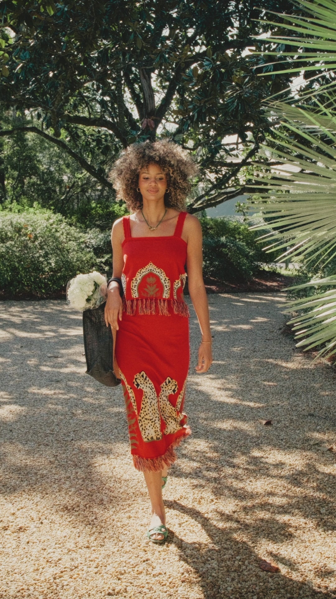 The Capri Knit Tank in Cheetah Rouge is an easy statement with a comfortable silhouette and playful fringe detailing along the hem. The Cheetah Rouge motif showcases majestic cheetahs framing lush green florals in a striking, symmetrical composition. Softly casual yet expressive, it’s designed to pair perfectly with the coordinating Capri Knit Skirt for breezy beach days, coastal getaways, or relaxed weekend brunching.