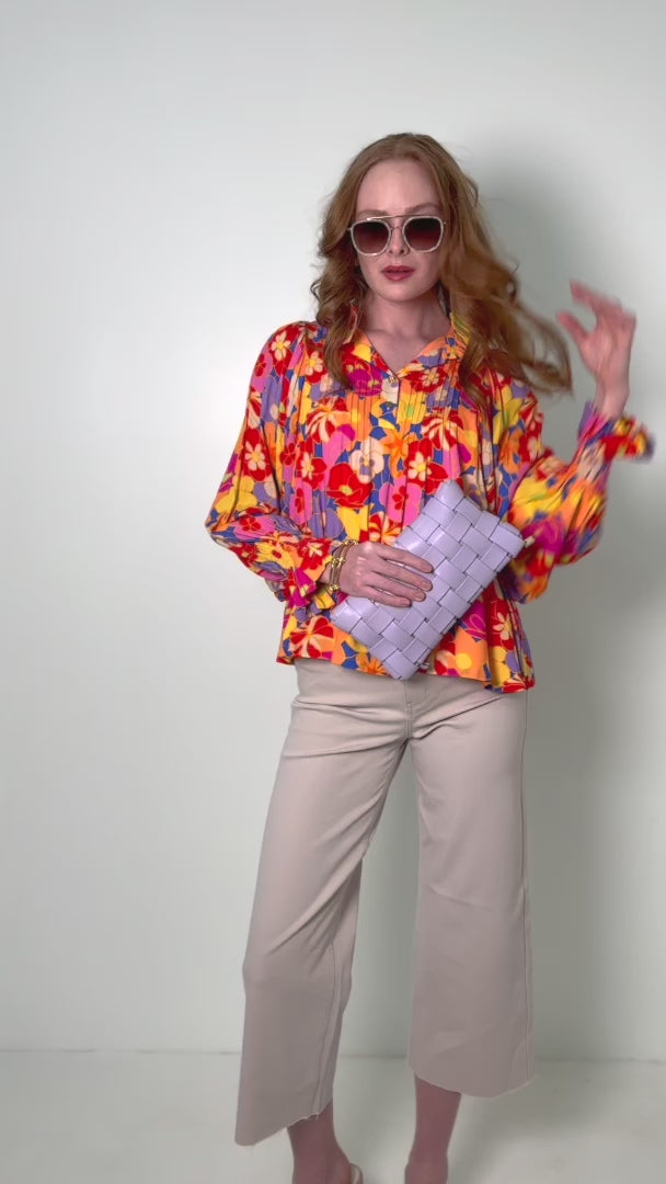 The Charlotte Top is a feminine confection with timeless charm. Featuring a ruffle stand collar, pintuck pleats, and smocked wrist cuffs serving unique detail and effortless style. Designed in a retro inspired floral print that boasts playful color and feminine flair. Pair with the Pleated Pant in Sandshell for a touch of texture and on-trend style!