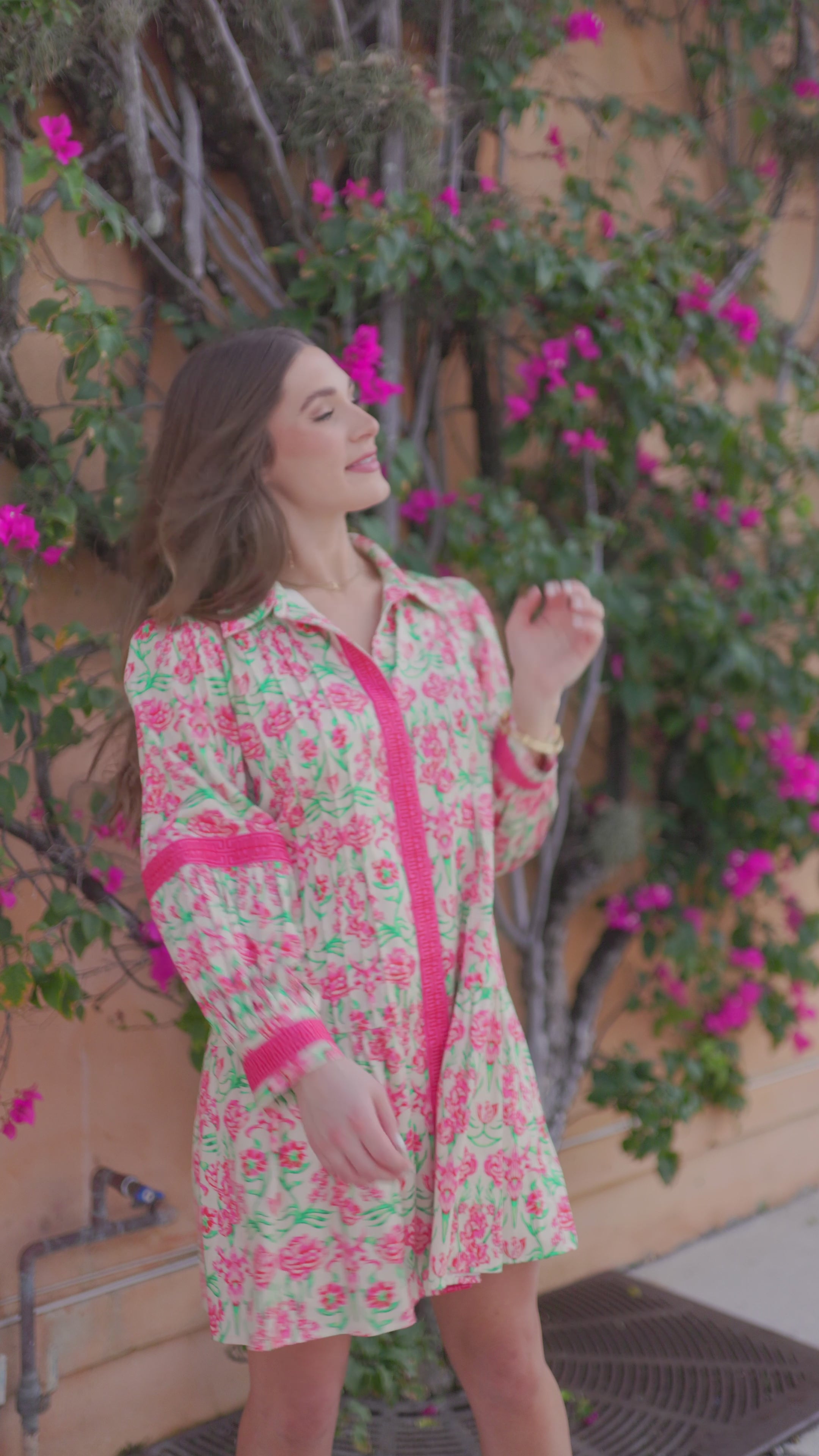 Unleash your wild side in the Delany Dress Garden Cheetah, a captivating blend of playful whimsy and refined detail. The Garden Cheetah print appears as a delicate floral pattern at first glance, but converges to form the face of a cheetah, creating a fun visual puzzle. Featuring a classic fold collar and a drop waist hem, creating a silhouette that is both flattering and timeless. Pin tuck details add a touch of texture and depth, elevating the design. Our signature monogram trimming, strategically placed along the sleeves and over the front buttons, sets this dress apart as a statement piece!