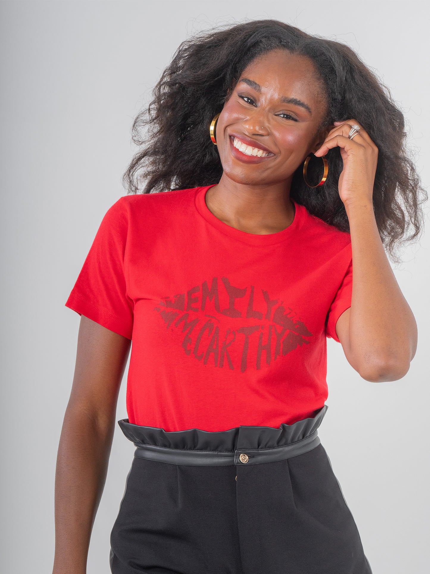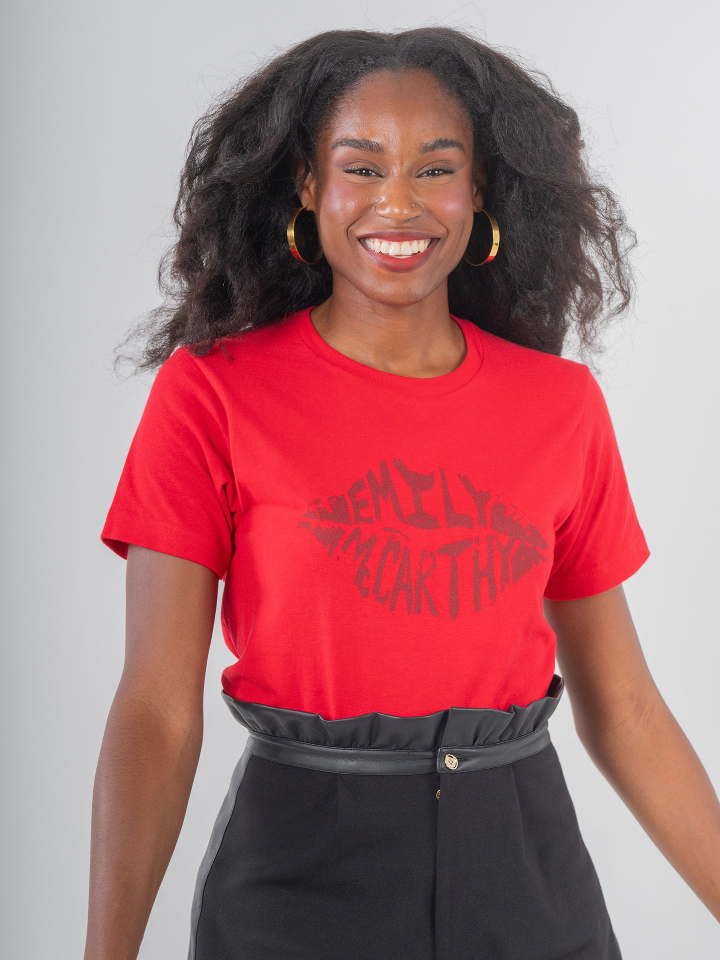 Crafted from soft, breathable cotton, this comfortable and groovy tee features "Emily McCarthy" creatively formed into the shape of lips. In a bold and vibrant red, this tee is the perfect statement piece to add a little bit of edge to any outfit!