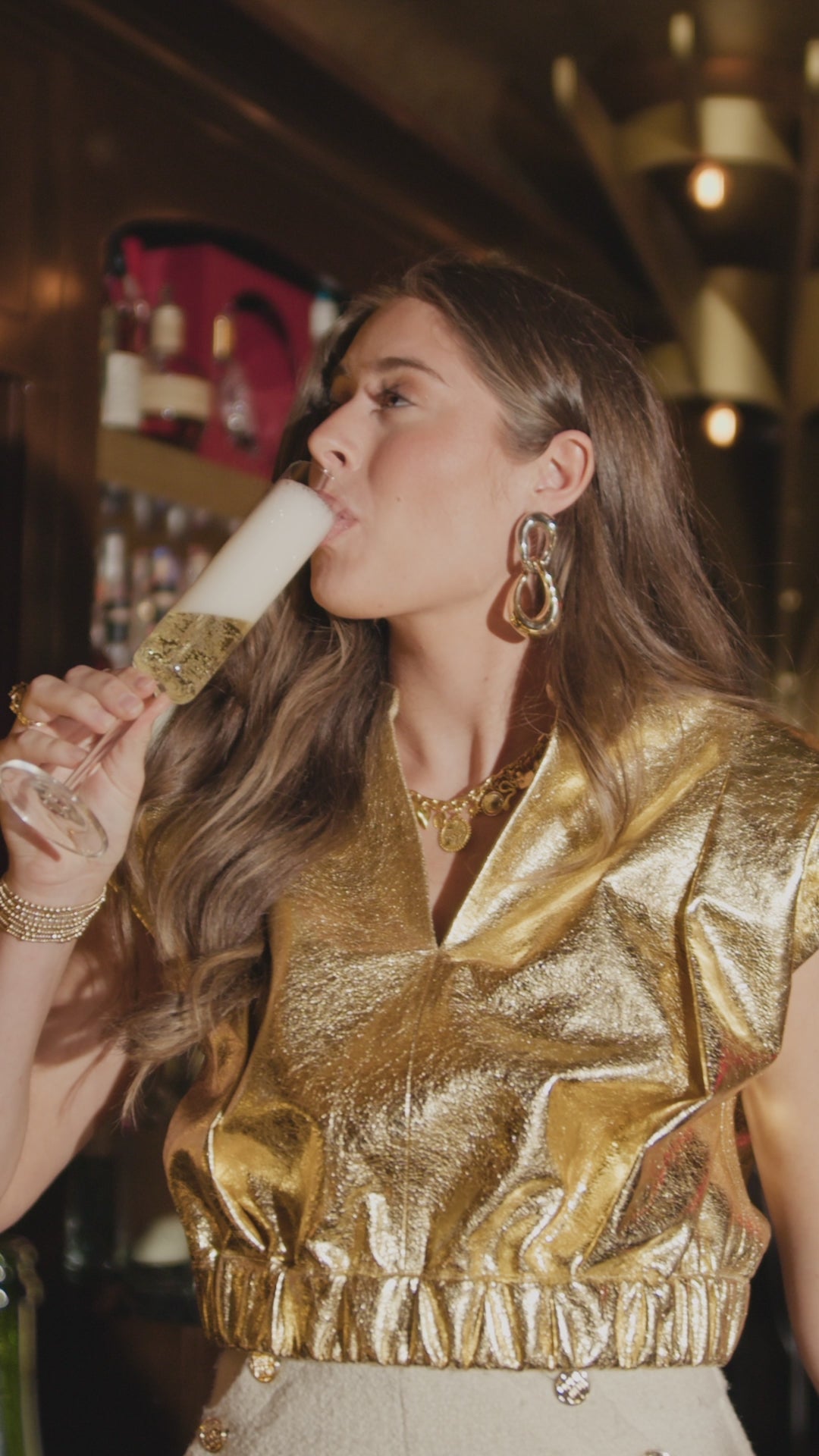 The Evie Top is designed to make a statement, crafted in shimmering gold vegan leather that catches the light with every move. Structured with padded shoulder cap sleeves, a refined mandarin collar, and front pleats that create subtle drape, this top balances boldness with sophistication. An elastic hem offers shape and ease, making it a playful yet polished choice for holiday parties and festive occasions.