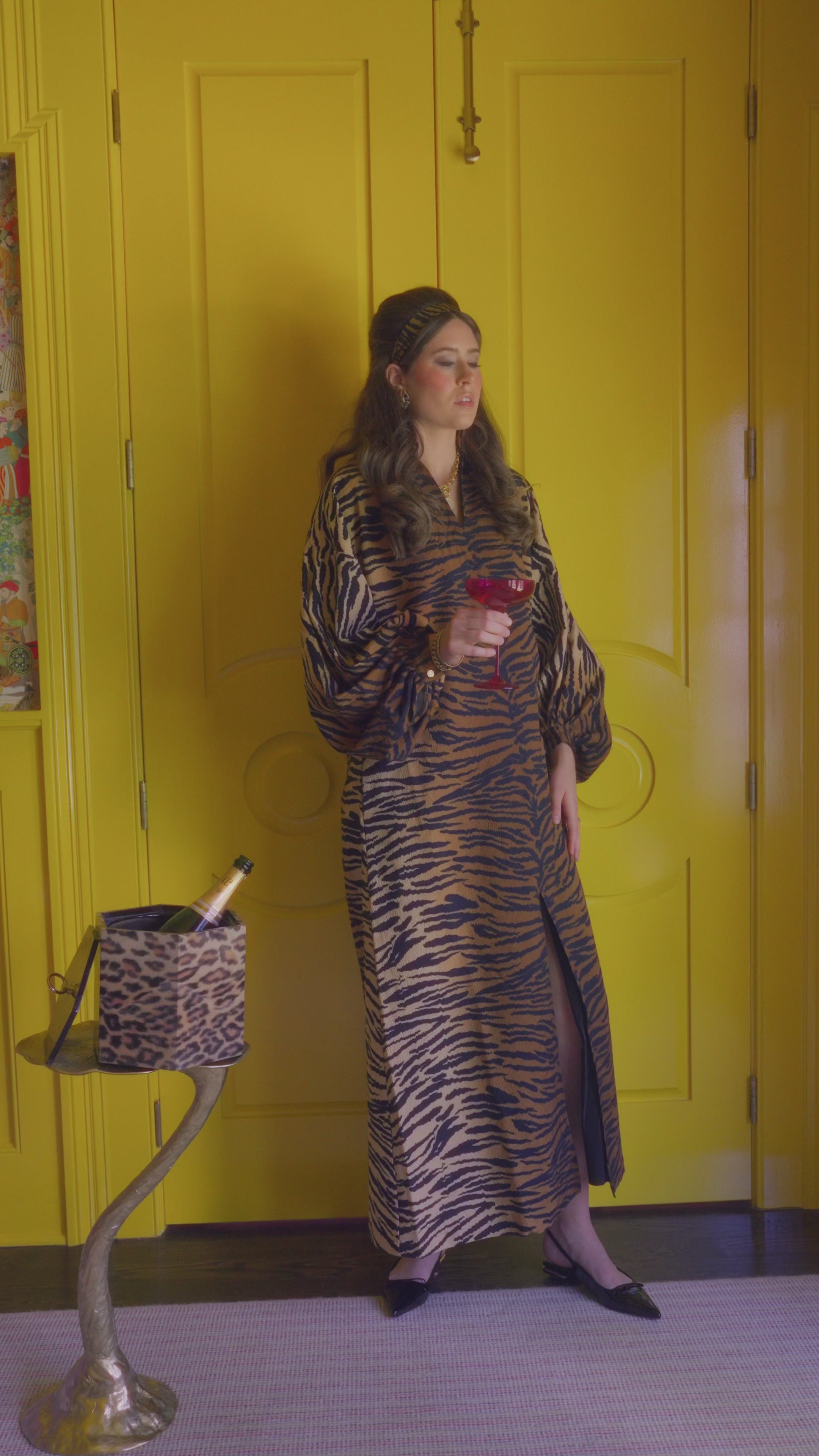 The Fiona Dress in Tiger Jacquard showcases a classic stand collar, dramatic blouson sleeves, and a relaxed, flowing silhouette finished with a front slit. Crafted in a richly textured jacquard, this vintage Italia–inspired print delivers a bold, fierce statement—making it the ultimate showstopper for any event this season.