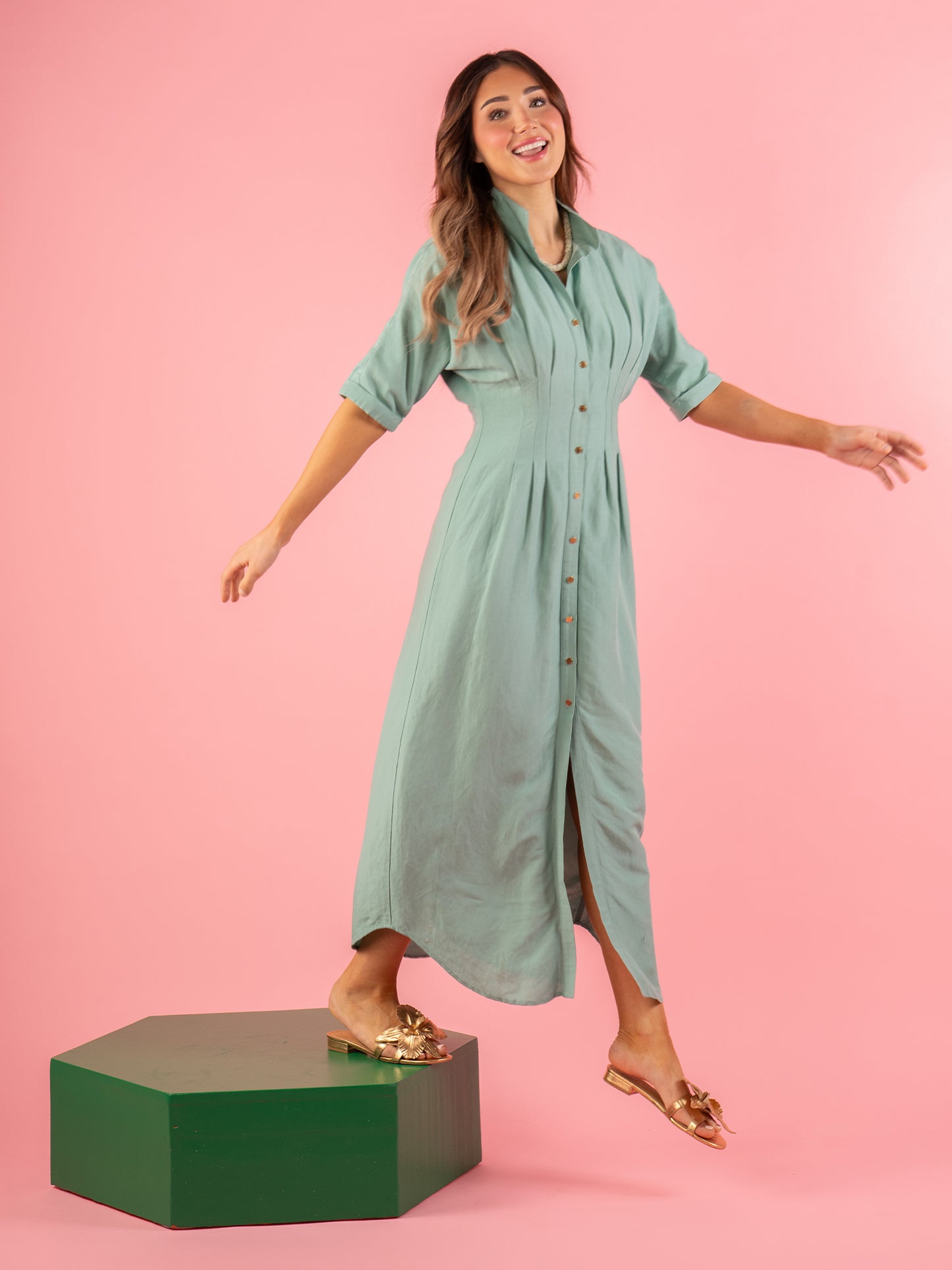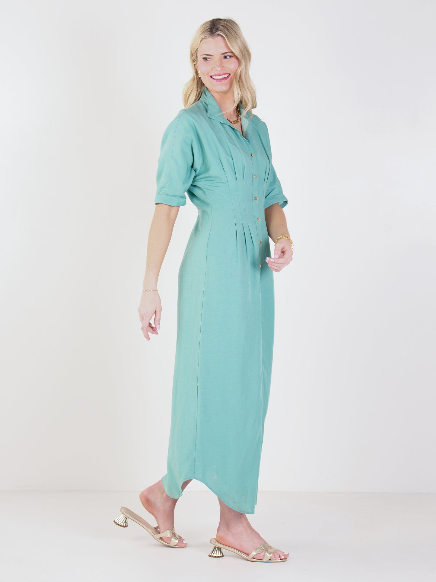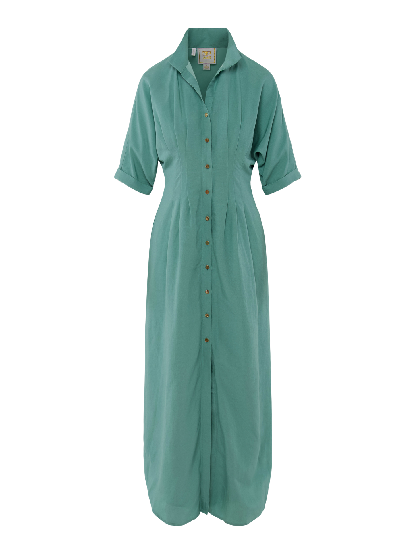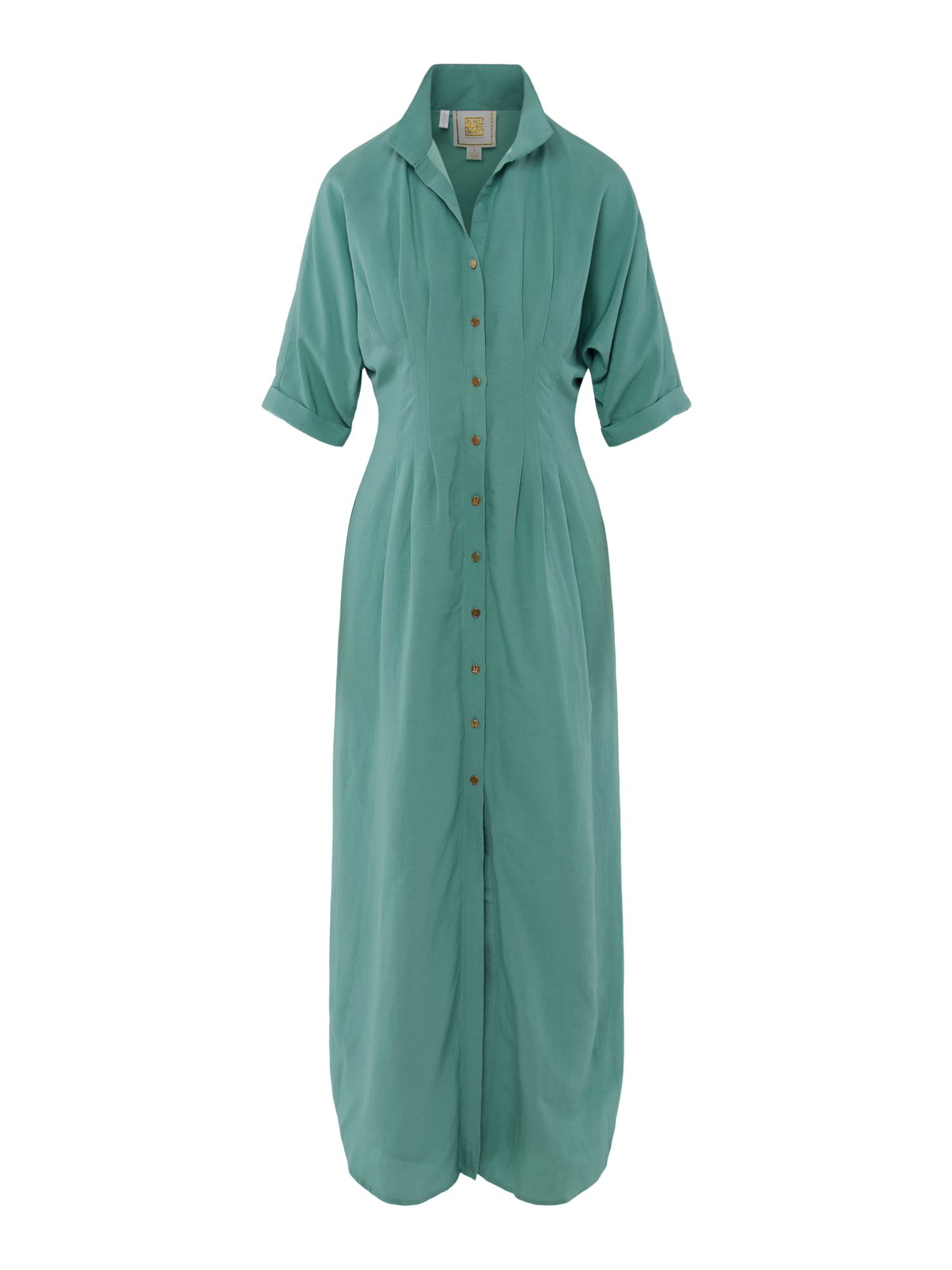 Timeless structure meets every day ease in the Georgia Dress Wasabi. Featuring a classic stand collar and short dolman sleeves, the design is finished with signature gold button closures down the front. Subtle pleating and an elastic back waist panel create a cinched, flattering shape with comfortable flexibility. Crafted in luxurious linen, this dress offers breathable wear with an elevated touch.