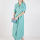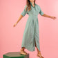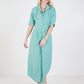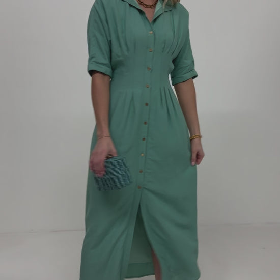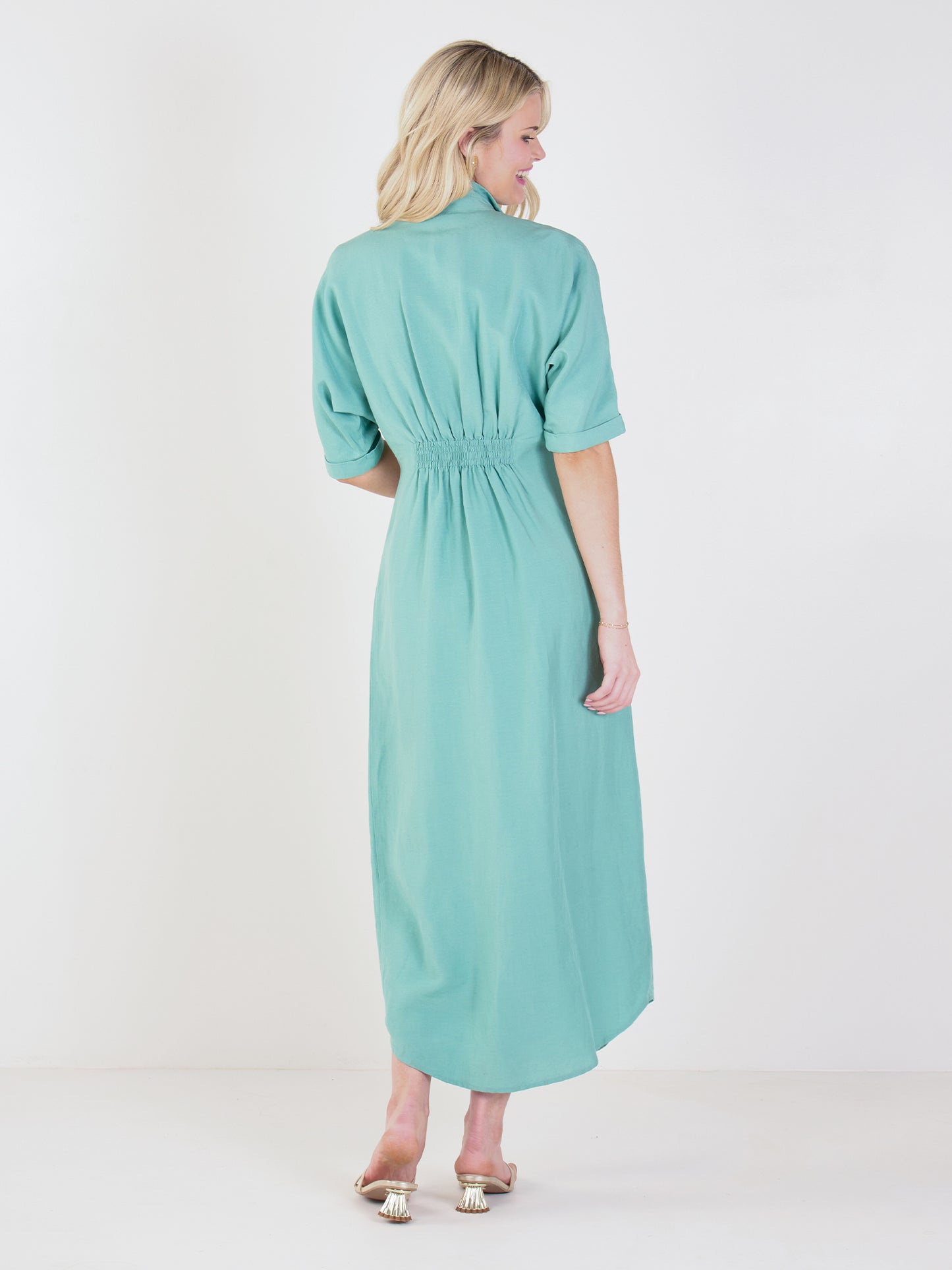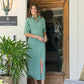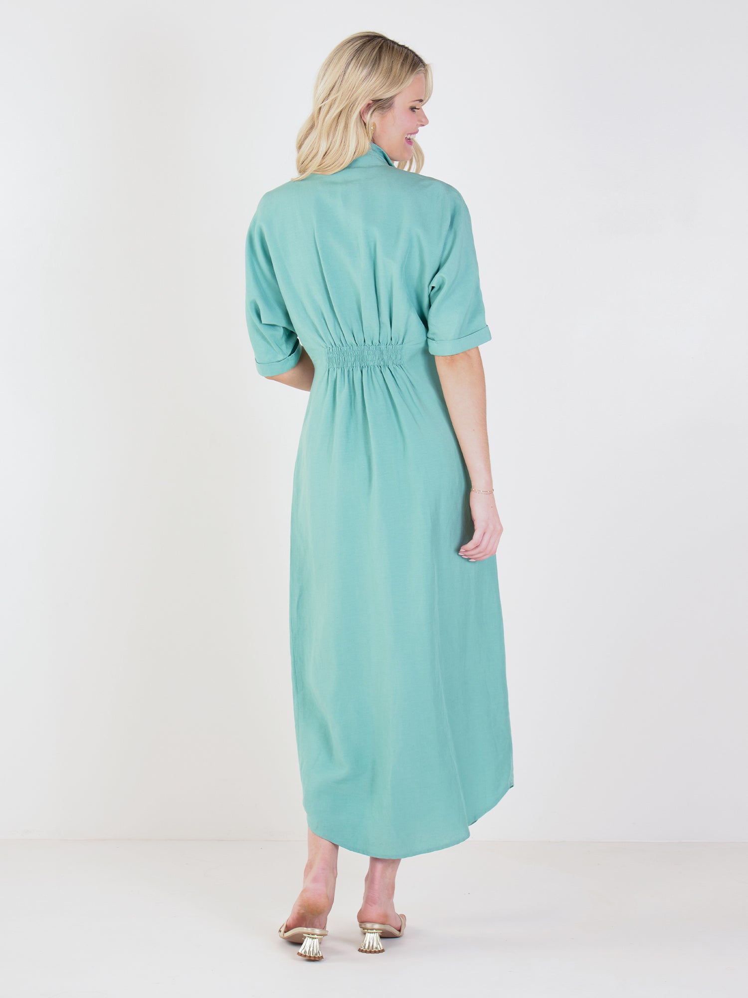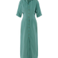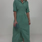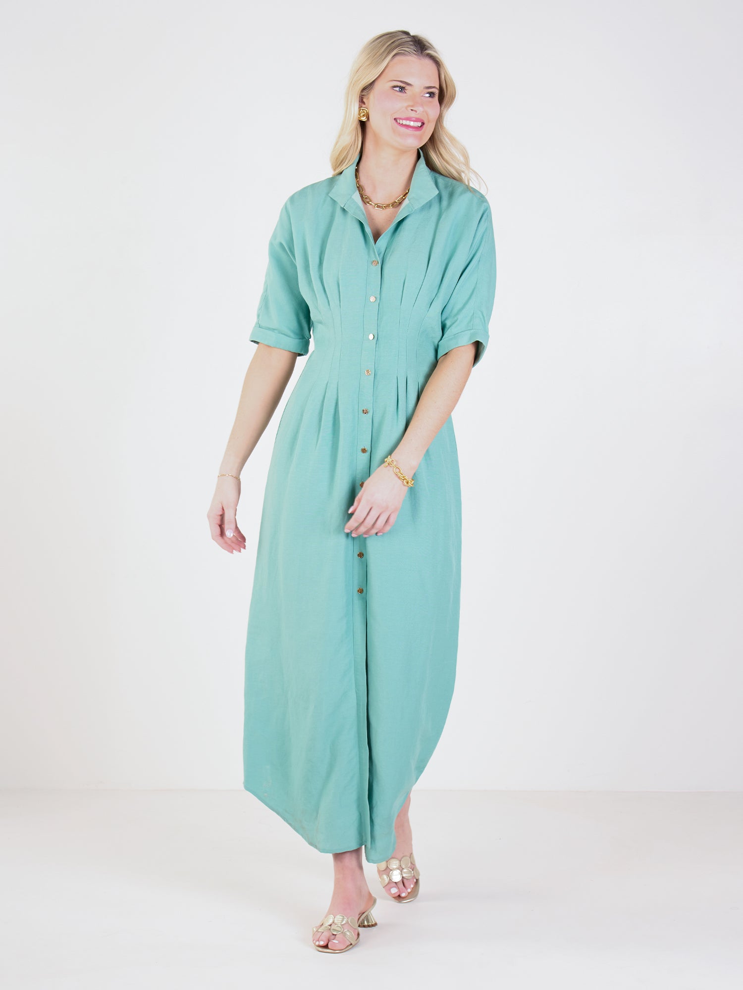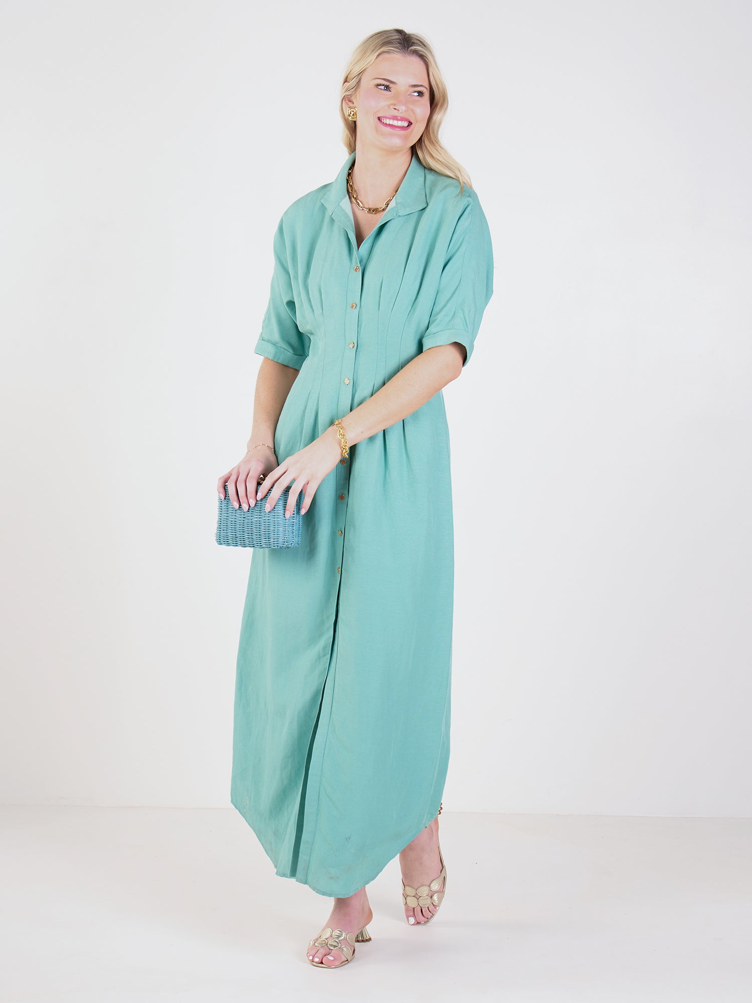 Timeless structure meets every day ease in the Georgia Dress Wasabi. Featuring a classic stand collar and short dolman sleeves, the design is finished with signature gold button closures down the front. Subtle pleating and an elastic back waist panel create a cinched, flattering shape with comfortable flexibility. Crafted in luxurious linen, this dress offers breathable wear with an elevated touch.