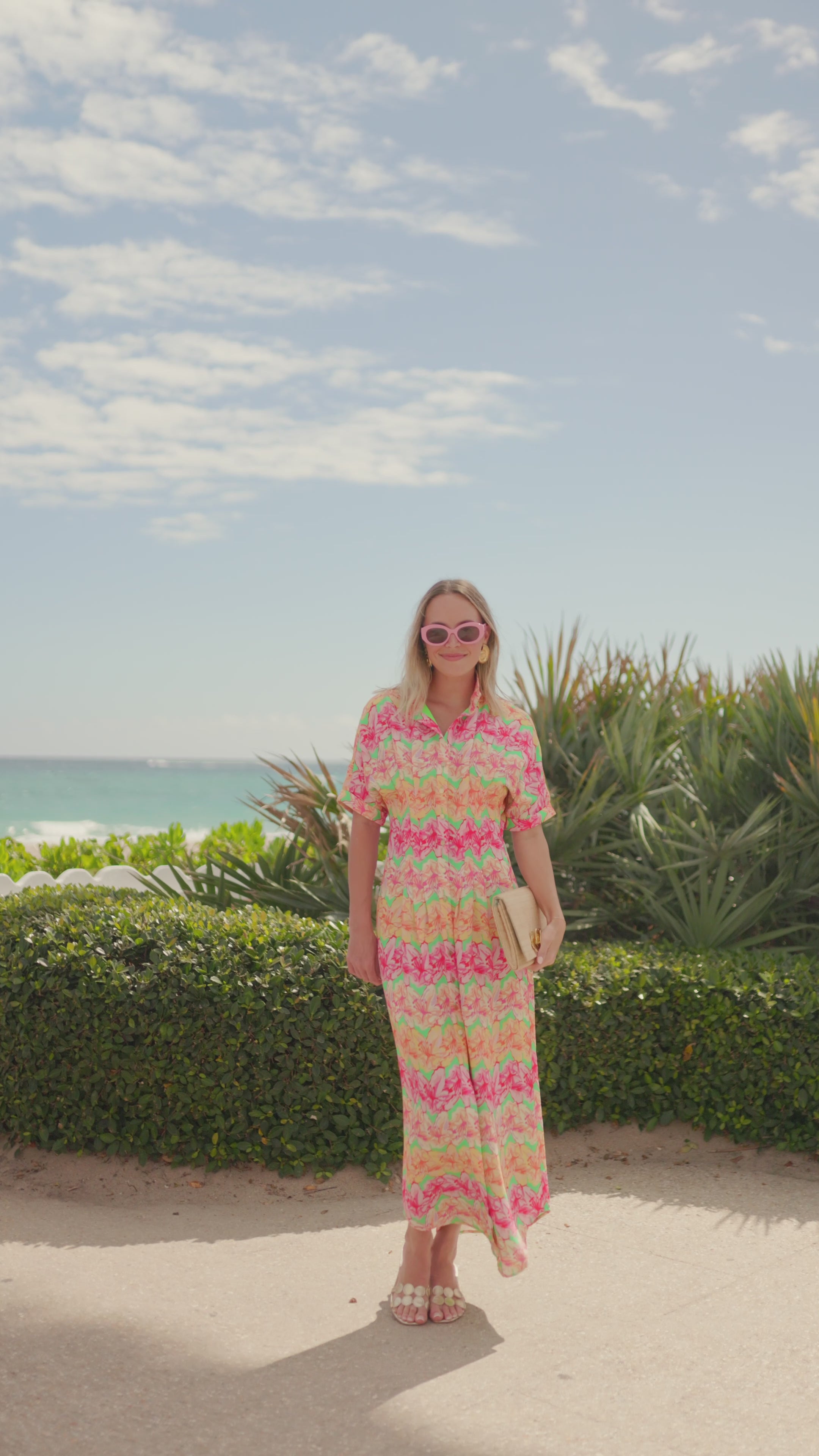 The Georgia Dress Azalea is a celebration of the season, radiating the joy and vibrance of spring. The cheerful hues and delicate brushstrokes create a stunning pattern of azaleas, adding an artistic touch to your spring wardrobe. The Georgia Dress features a classic stand collar and signature gold button closures, adding an elevated and refined touch. The fitted bodice is enhanced by delicate pin tucks that create a flattering silhouette, while an elastic cinched back waist provides a comfortably tailored fit. The short dolman sleeves offer a relaxed yet sophisticated look, and the midi length drape creates a graceful and feminine silhouette. Perfect for garden parties, brunches, or any occasion where you want to make a vibrant and joyful statement!