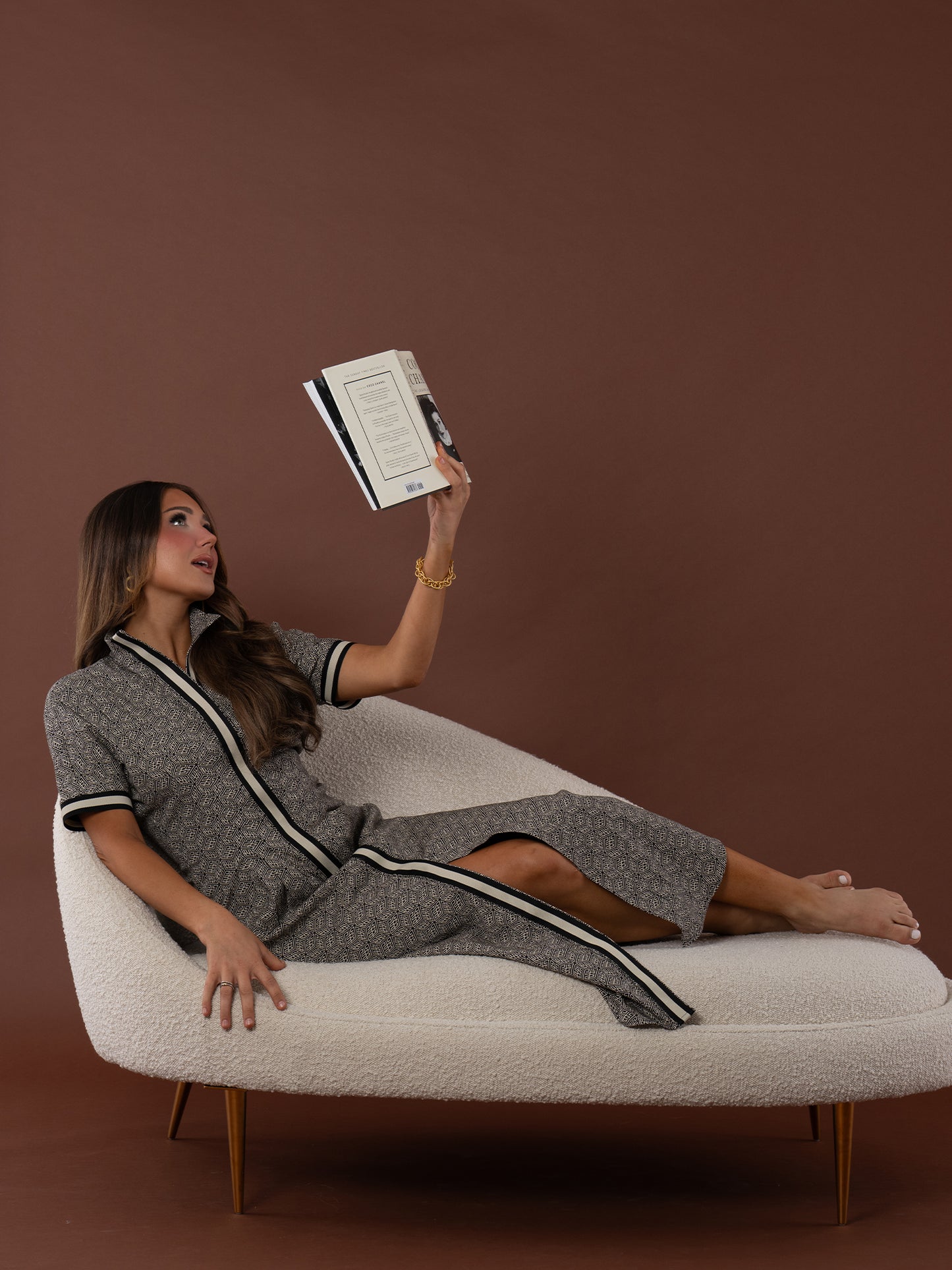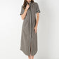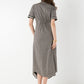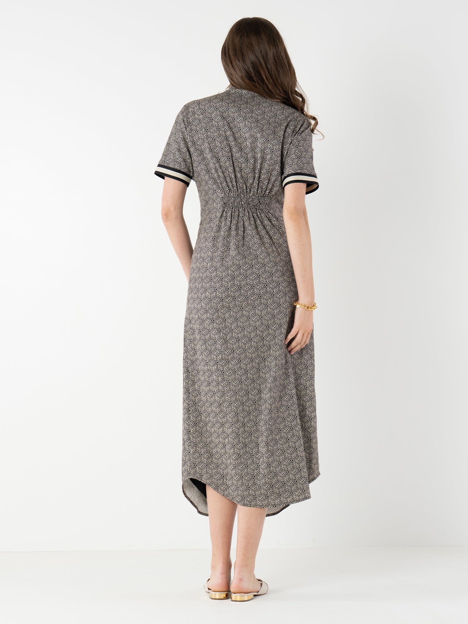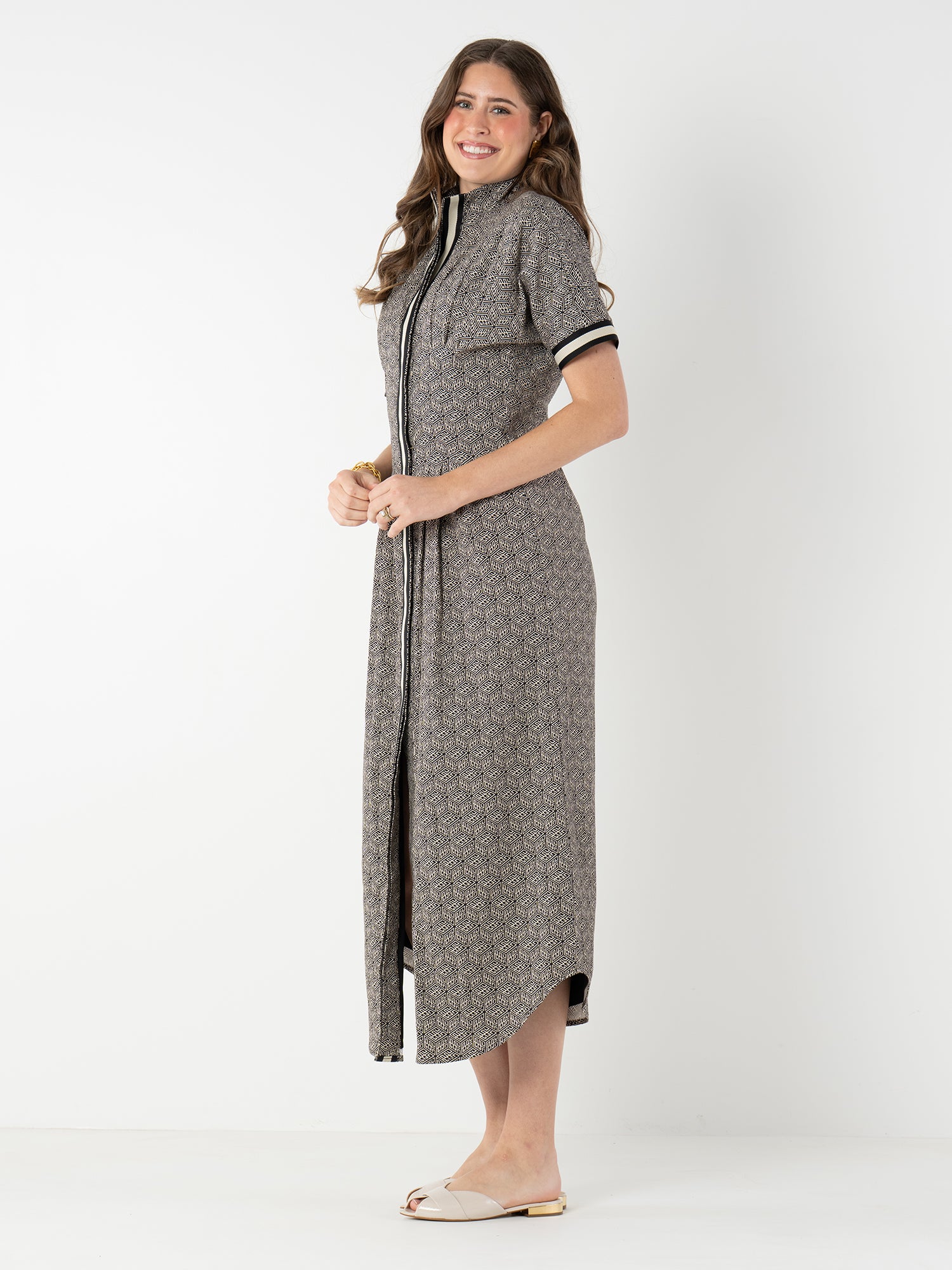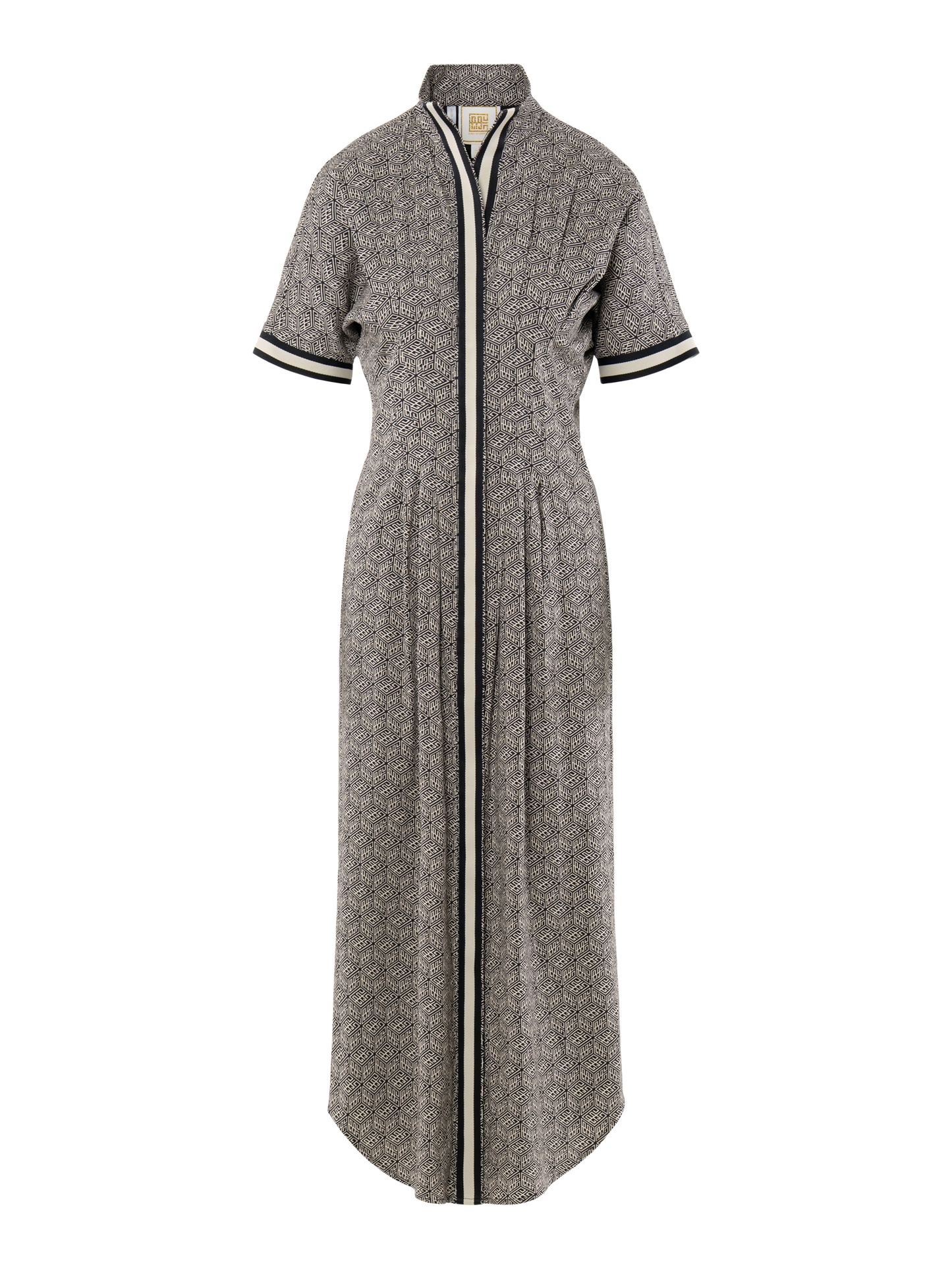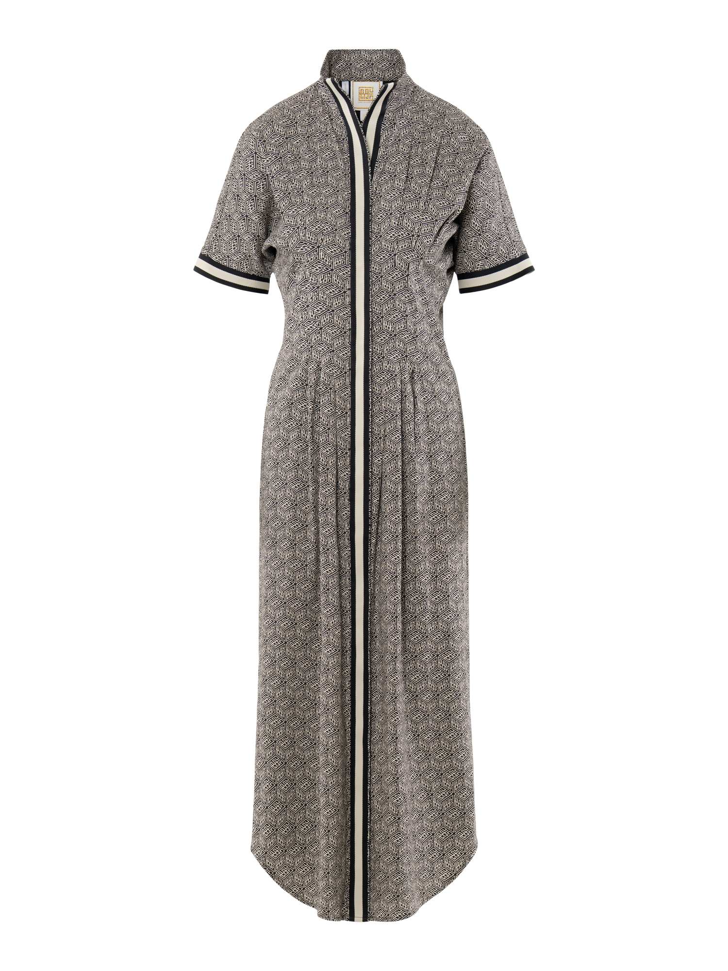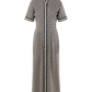 The Georgia Dress in Black Tonal Monogram blends timeless tailoring with subtle brand detail. Featuring a polished, repeating monogram print and a button front closure concealed beneath a bold striped placket. This style is finished with short dolman sleeves, delicate pin tucks, and a curved shirttail hem for an effortlessly refined silhouette. An elastic back ensures a comfortable, flattering fit that contours the waist. Versatile and seasonless, it’s a go-to piece you'll reach for again and again.