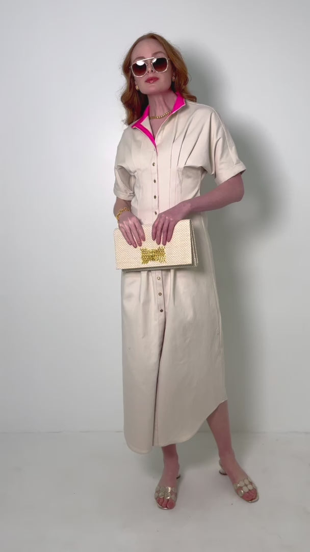 A masterclass in shape and style; The Georgia Dress will be your new go-to spring staple! This midi-length, figure sculpting beauty features signature gold button closures marching down the front, and short dolman sleeves adding a touch of breathable structure. Pop the optional stand collar to reveal a vivid dose of neon pink for an extra feminine touch and subtle statement. Dress it up with a heel or keep it casual with a sneaker - either way this dress is sure to make a lasting impression!