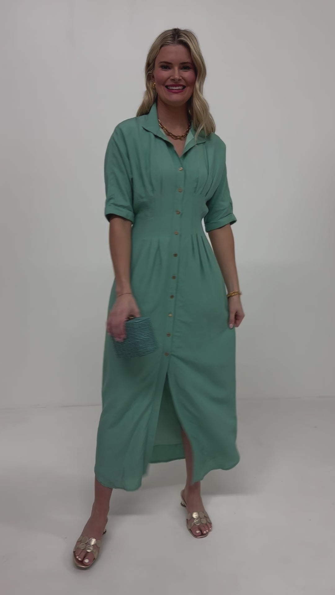 Timeless structure meets every day ease in the Georgia Dress Wasabi. Featuring a classic stand collar and short dolman sleeves, the design is finished with signature gold button closures down the front. Subtle pleating and an elastic back waist panel create a cinched, flattering shape with comfortable flexibility. Crafted in luxurious linen, this dress offers breathable wear with an elevated touch.
