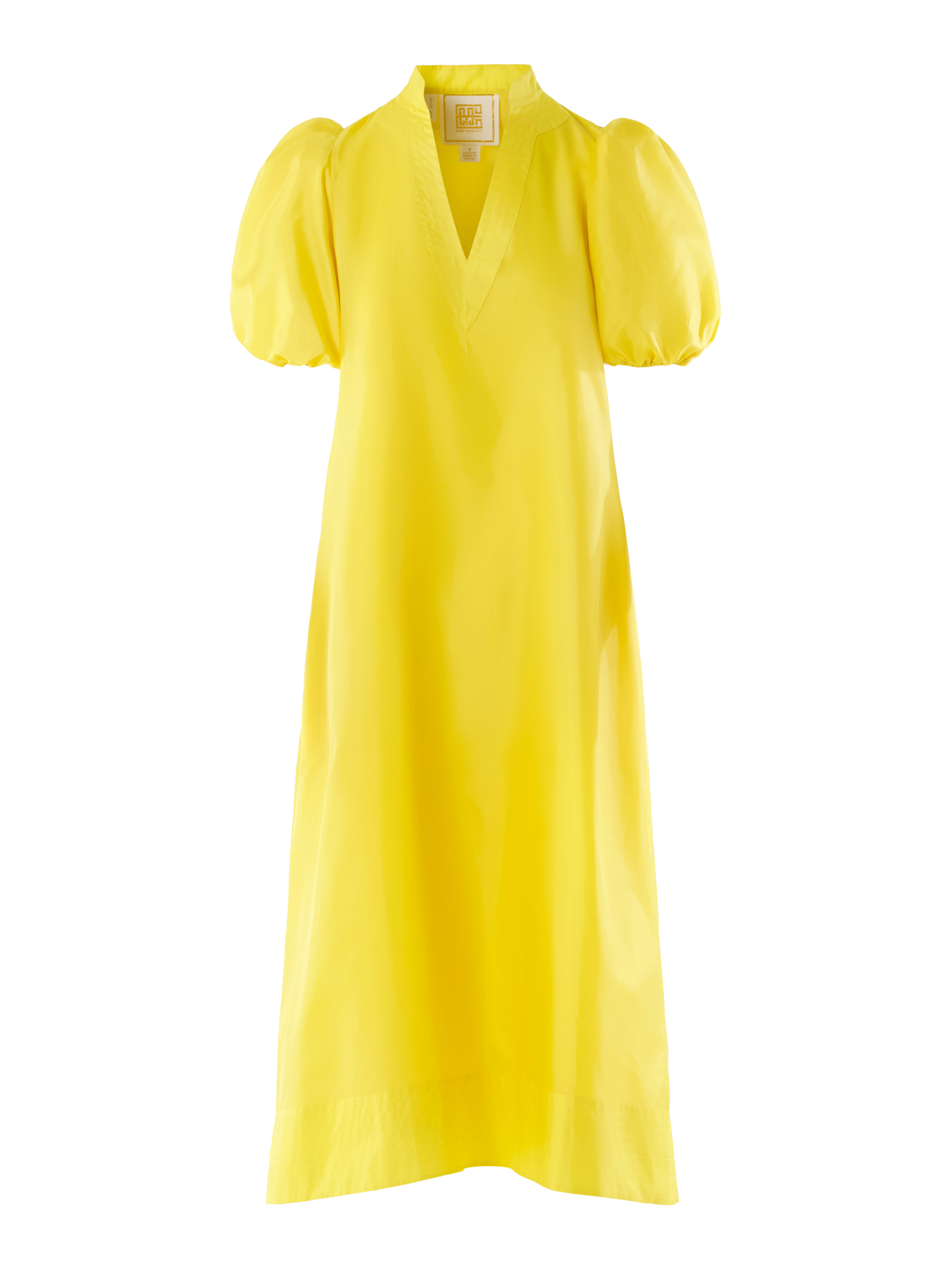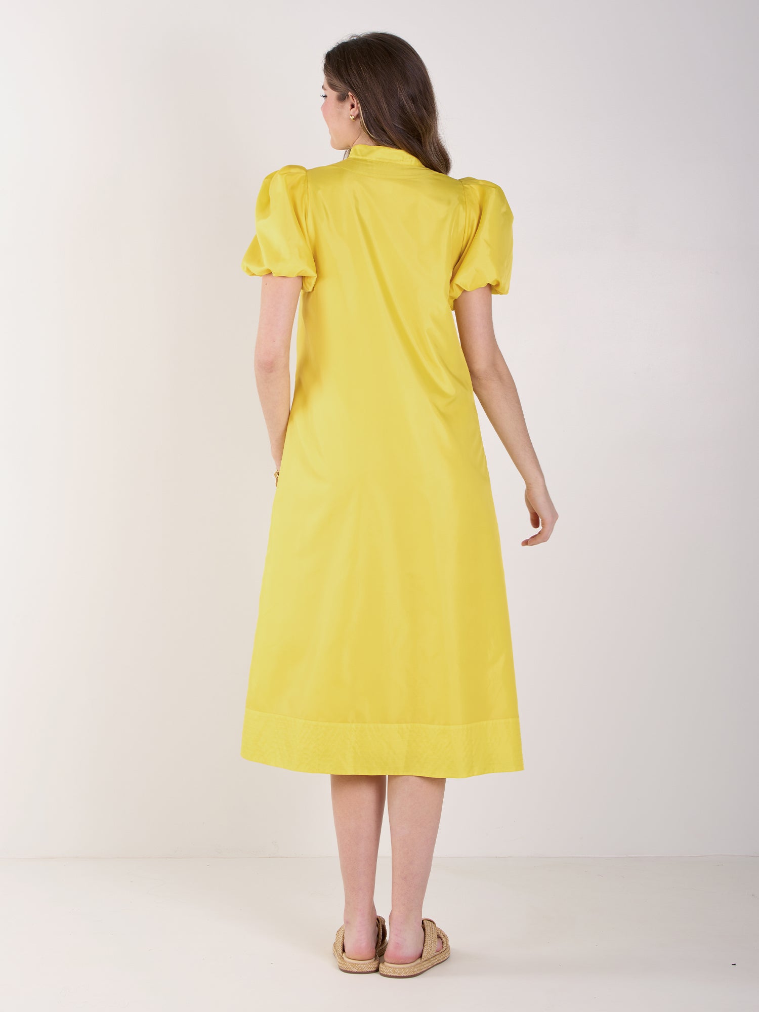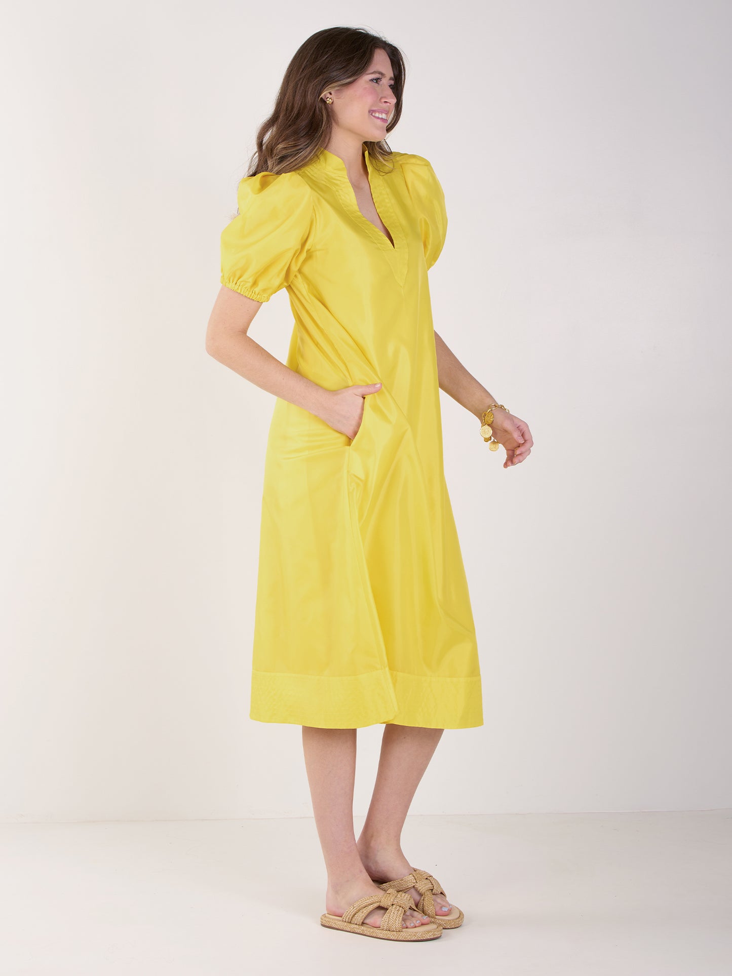 The Hampton Dress in Lemon is the perfect blend of playful charm and effortless refinement. Designed with a mandarin-style collar and voluminous puff sleeves, this silhouette offers an easy, breezy fit with timeless appeal. Crafted from a vibrant yellow taffeta, it adds a cheerful pop of color while remaining light and breathable. Side pockets add a practical touch, making this dress your go-to for sunny days and stylish moments.