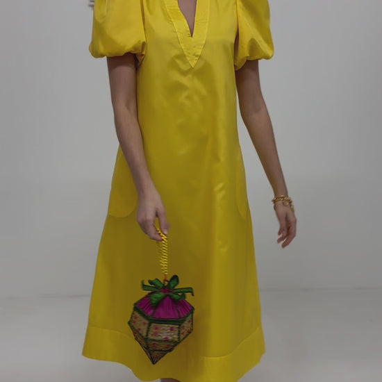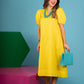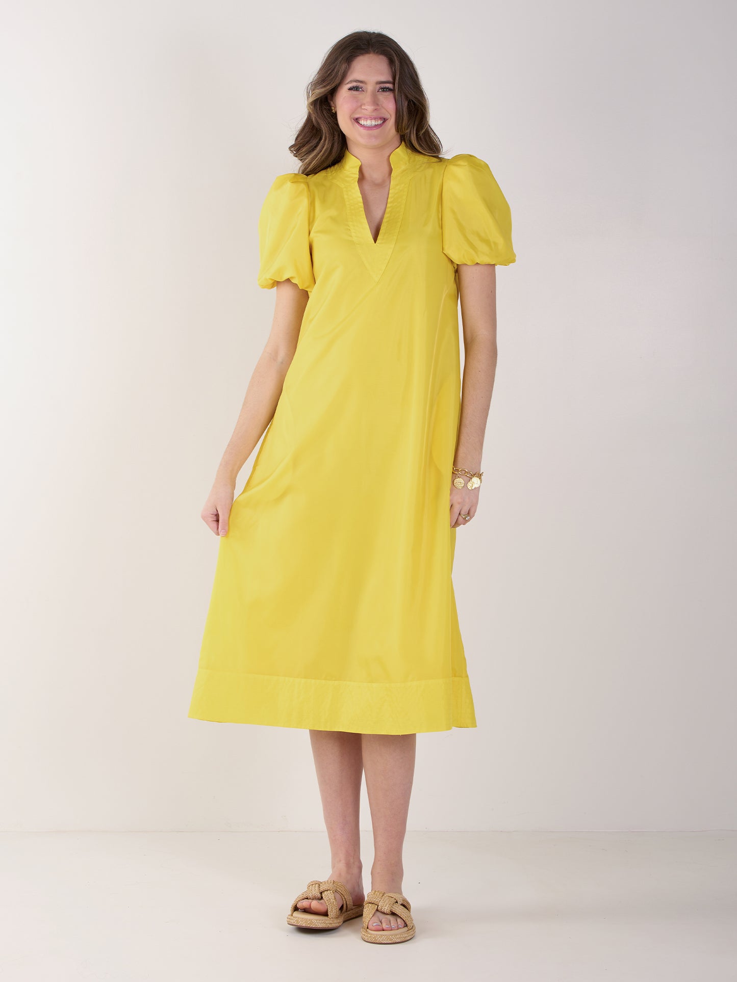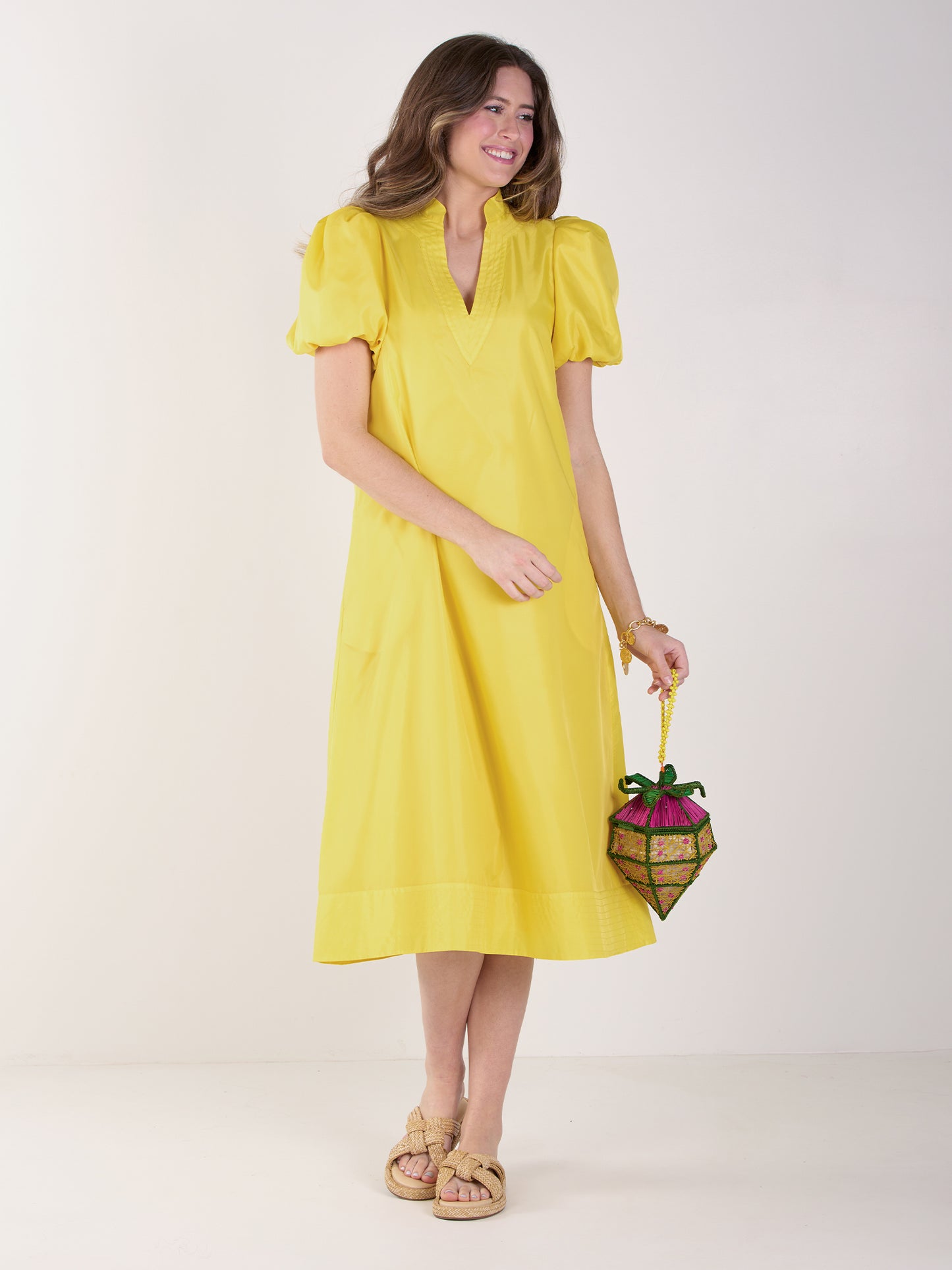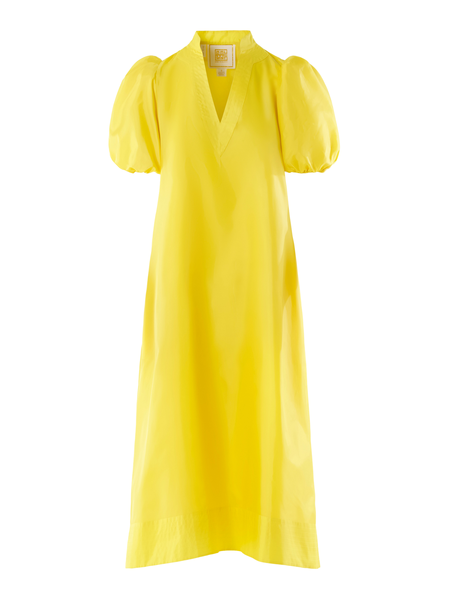 The Hampton Dress in Lemon is the perfect blend of playful charm and effortless refinement. Designed with a mandarin-style collar and voluminous puff sleeves, this silhouette offers an easy, breezy fit with timeless appeal. Crafted from a vibrant yellow taffeta, it adds a cheerful pop of color while remaining light and breathable. Side pockets add a practical touch, making this dress your go-to for sunny days and stylish moments.