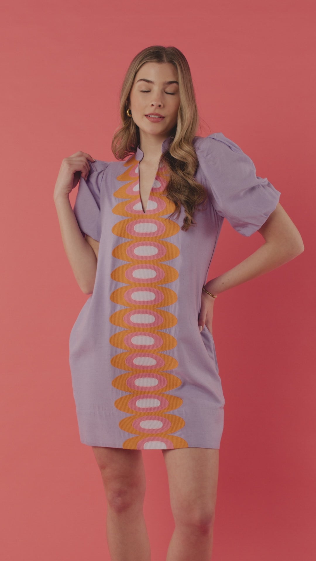 The Hampton Mini Lavender features a mandarin-style collar, elastic puff sleeves, and functional side pockets, finished with a softly tailored silhouette that offers shape without clinging. A retro-inspired design runs through the front, translated through rich embroidery that adds texture, depth, and a playful pop of color.