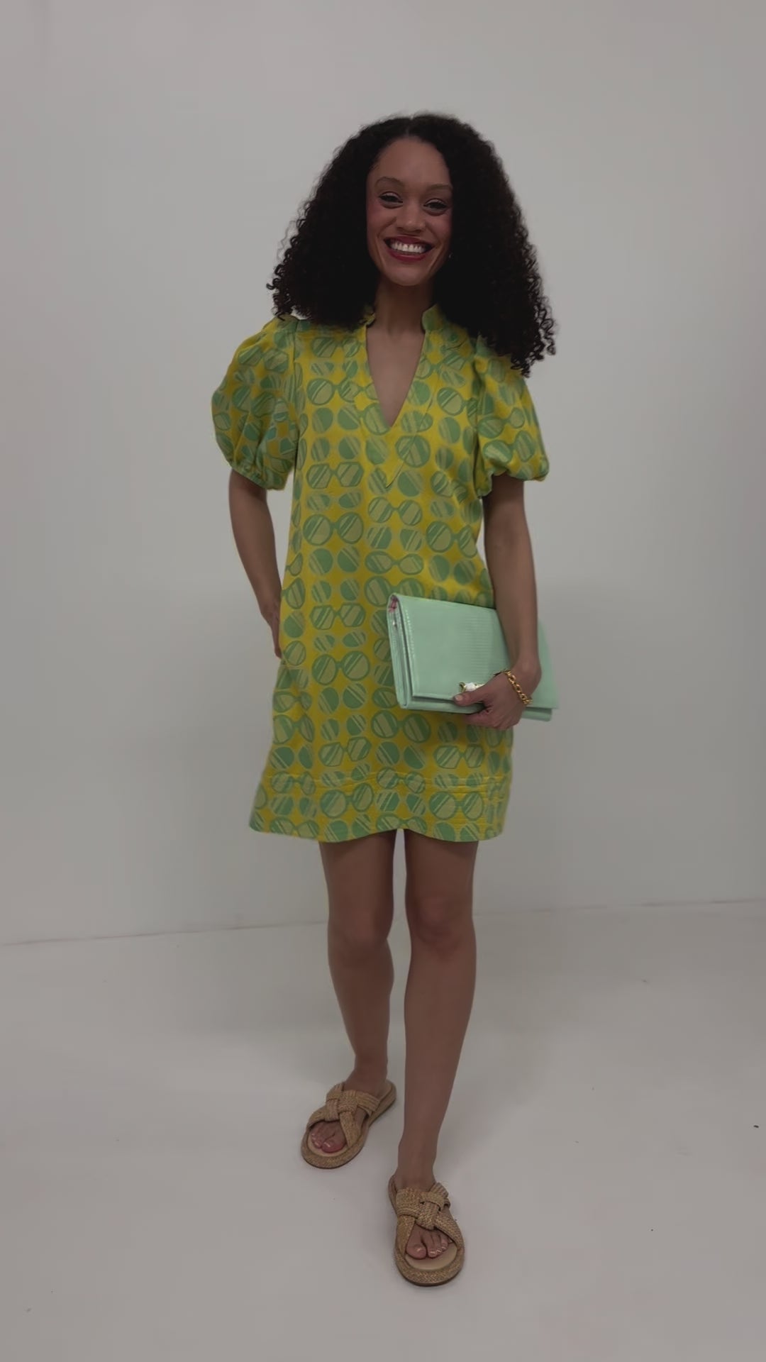 The Hampton Mini in Spectacle is a playful twist on a classic silhouette, designed with a nod to Iris Apfel’s legendary eyewear collection. Featuring a mandarin-style collar, puff sleeves, and detailed stitching along the V-neckline and hem, this mini dress balances structure with whimsy. Side pockets add functionality to the fashion-forward design, while the bold “Spectacle” print brings Apfel’s vibrant spirit to life in every wear.