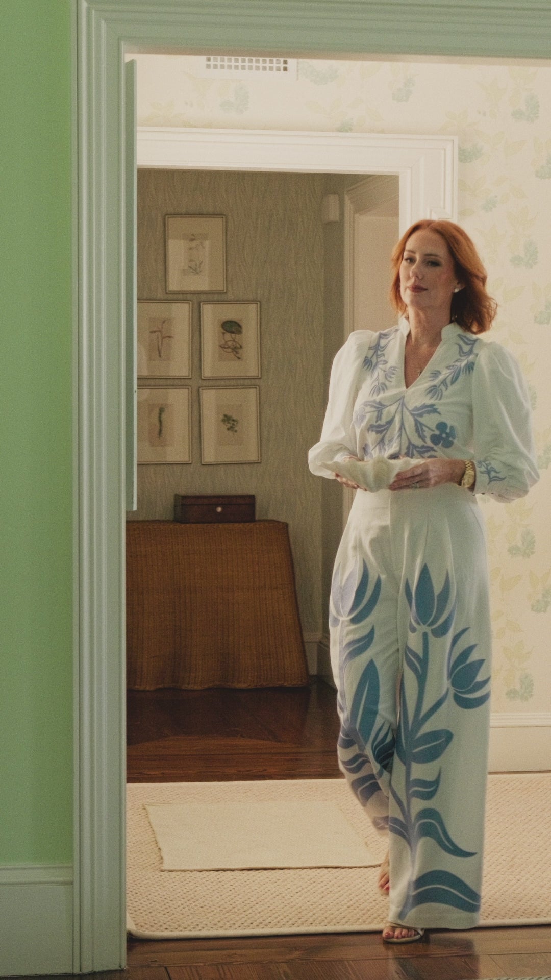 The Hampton Top in Dutch Tile is a natural blend of structure and artistry. Designed with a mandarin-style collar, softly blouson sleeves with cuffed wrists, and a subtly tailored silhouette, it feels polished yet approachable. The placed embroidery reimagines classic floral motifs through the lens of hand-painted ceramic tiles, with intricate stitching that adds depth and a globally inspired, dimensional finish.