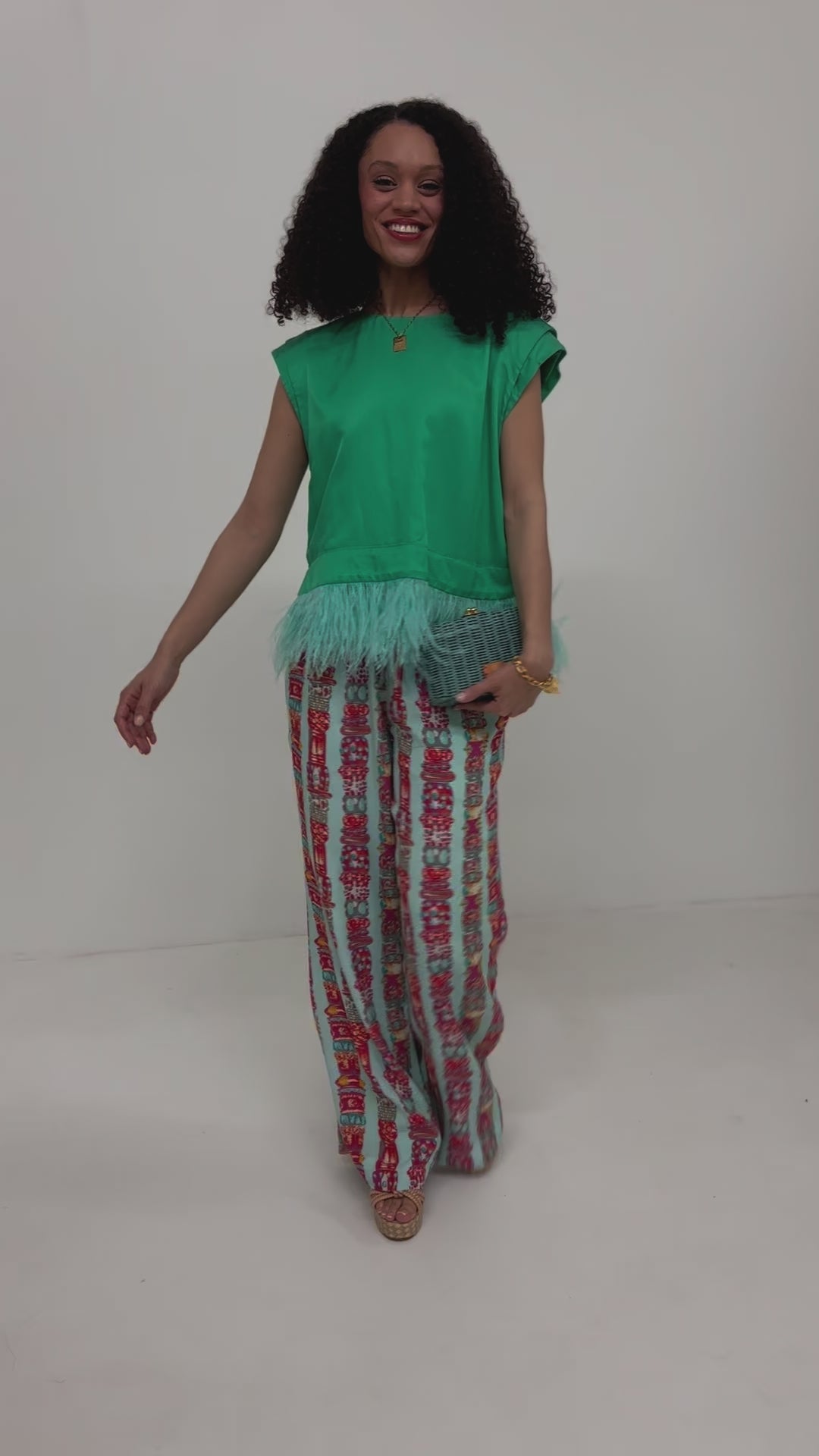 The Hatti Tank in Blarney Green is a bold blend of structure and whimsy. Featuring padded cap sleeves and a boxy, loose-fitting silhouette, this statement top is all about confident ease. The real showstopper? A feather-trimmed hem in a playful contrast hue, adding movement, texture, and a touch of drama. Perfect for dressing up or adding flair to your everyday look, it’s a go-to for the fashionably fearless.