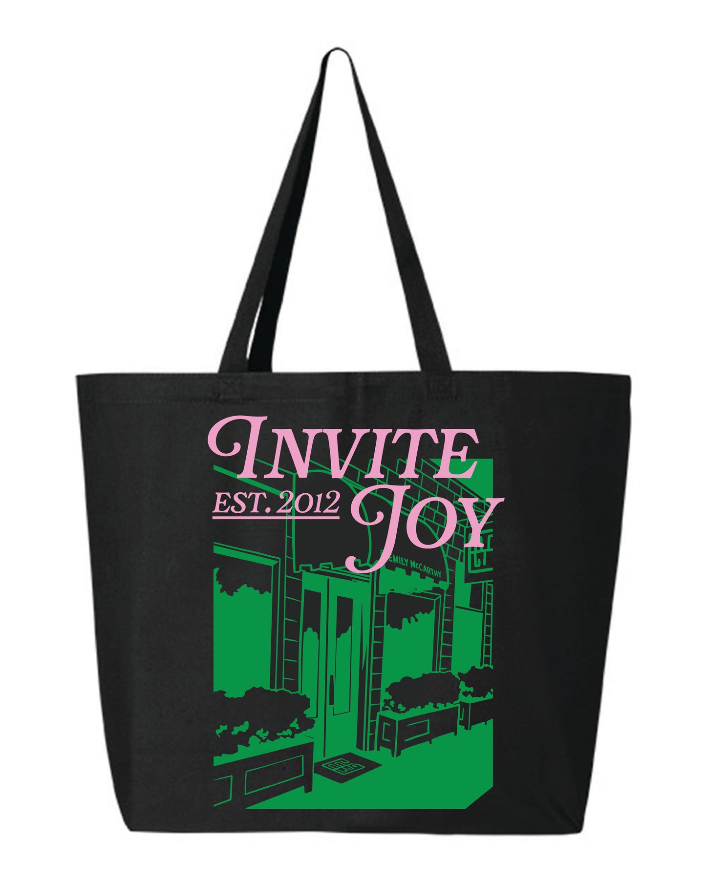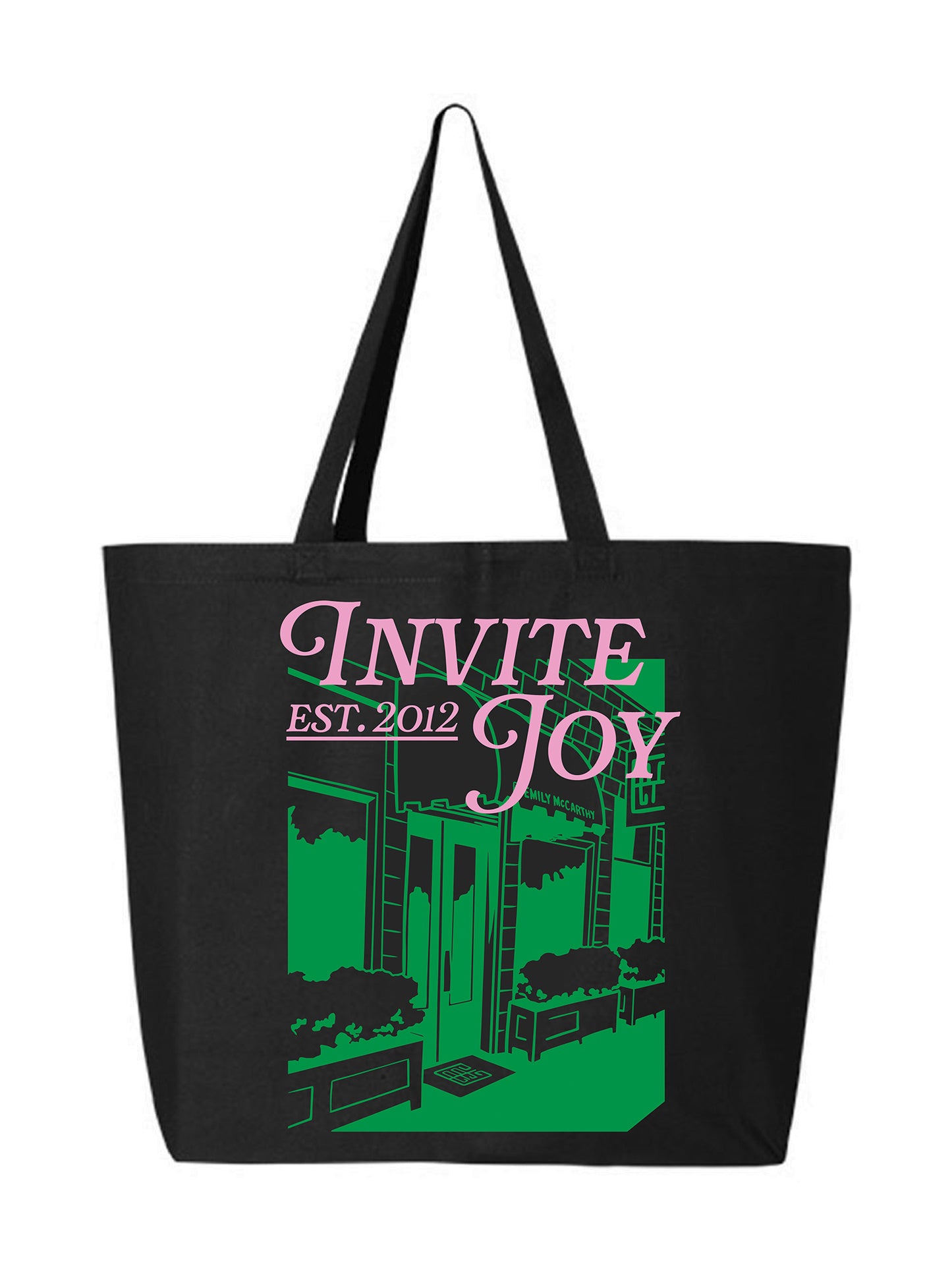This trendy and stylish tote bag features our signature phrase "Invite Joy" with a background sketch of our beloved original storefront. This tote bag is a wearable piece of our story honoring 12 amazing years at the shoppe that built us! Carry all of life's everyday essentials in joyful style!