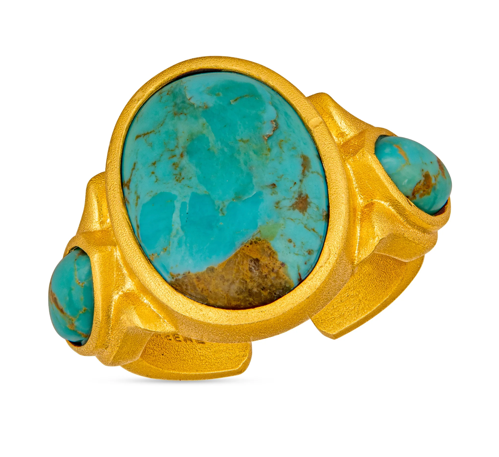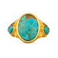 Instantly elevate your look when you add the Iris Ring in turquoise to your jewelry box. This bold cocktail ring features a large, oval center turquoise stone and two petal-shaped stones flanking each side. Regal and eye-catching, this ring is crafted from 18K gold-plated brass and has an open back to adjust the fit to your preferred finger.