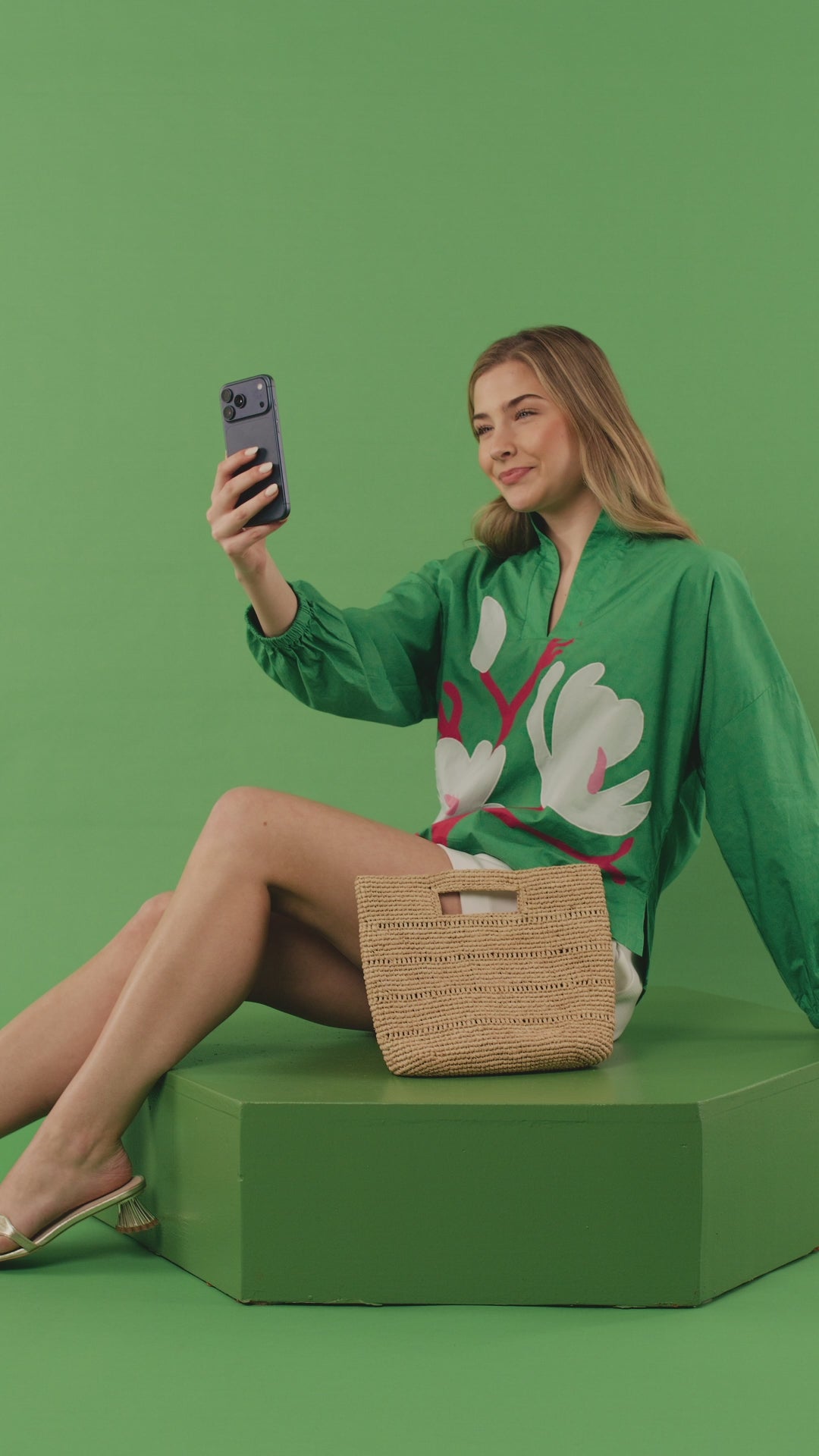 The Long Sleeve Poppy in Dutch Garden features a classic stand collar with a softly notched neckline and a relaxed, loose-fitting silhouette. Designed with long dolman sleeves finished with elastic at the cuff, it offers comfortable movement and an easy, fluid shape. Vibrant green serves as the backdrop for pink and white florals, while embroidered edges add depth, texture, and a distinctive, artful finish.
