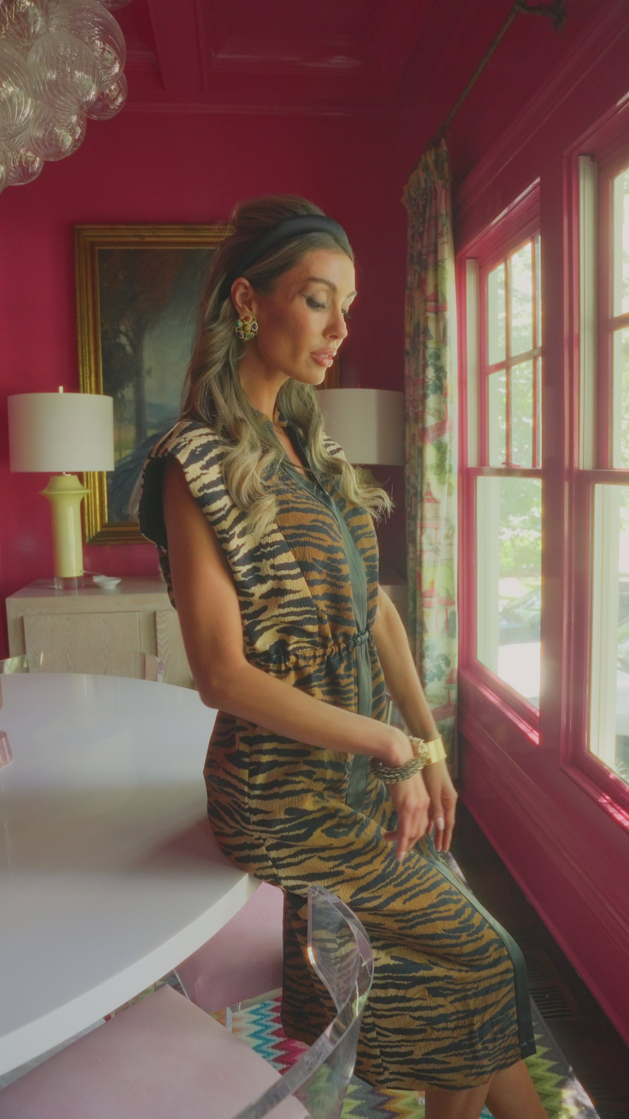 The Meme Dress in Tiger Jacquard is a striking blend of structure and sleek tailoring. Featuring a defined shoulder, V-neckline, and fretwork bodice, this design flows into a straight, midi-length skirt with an elastic waistband for comfort and a front slit for ease of movement. A bold vegan leather trim runs down the center front, adding a refined contrast to the rich, textural tiger jacquard.