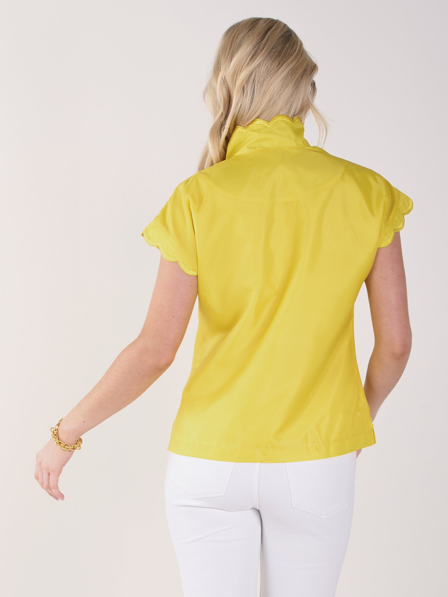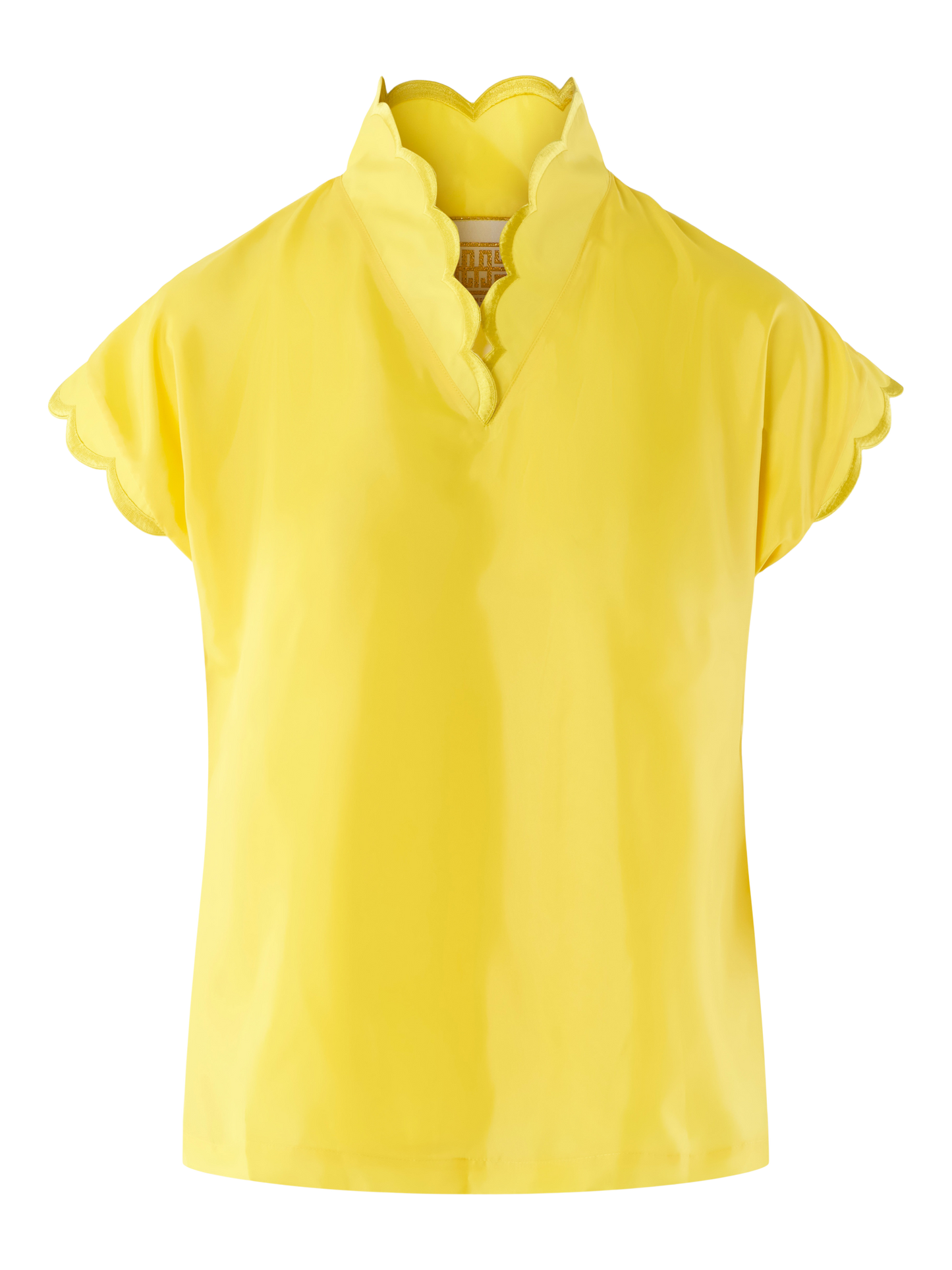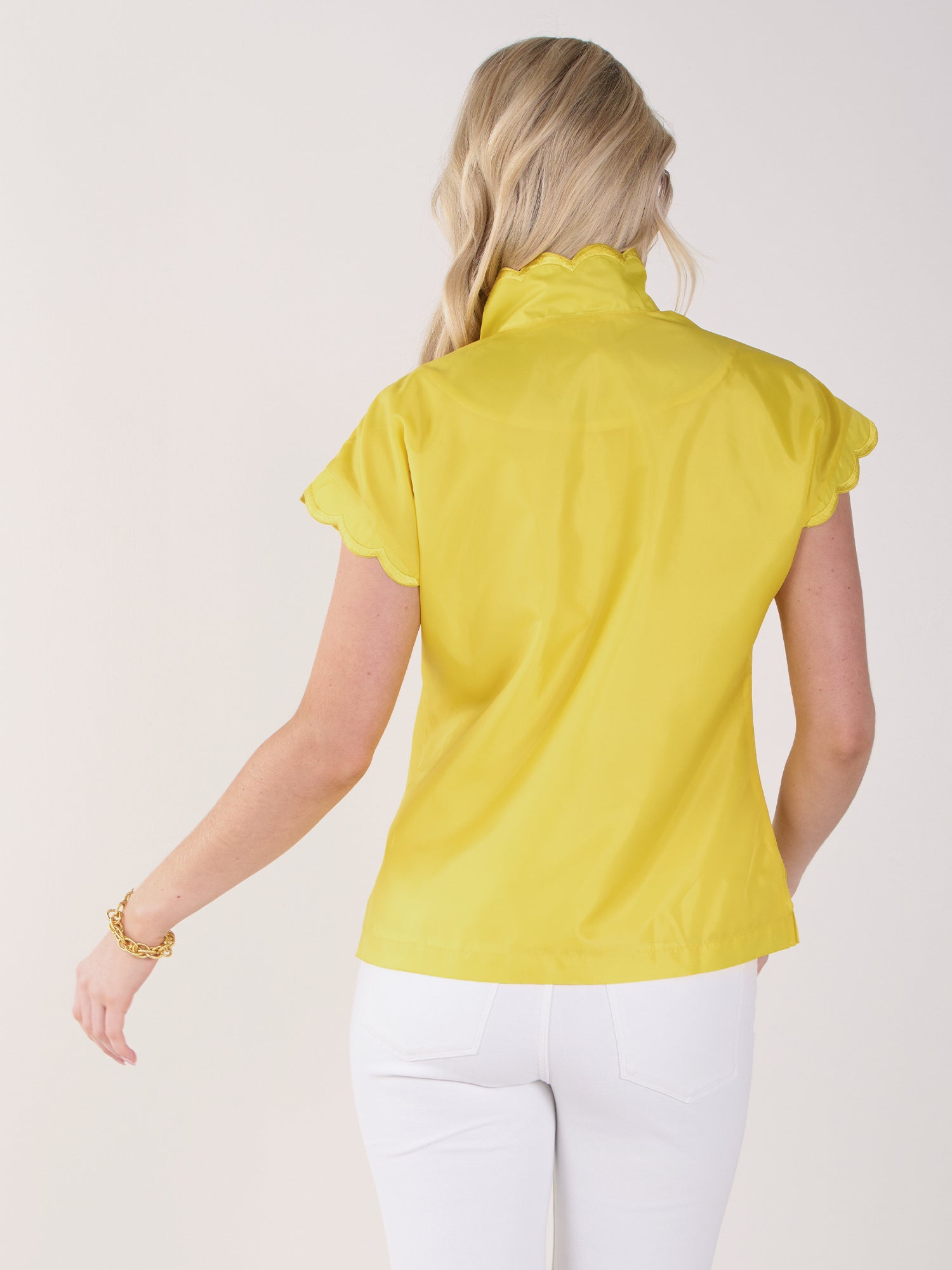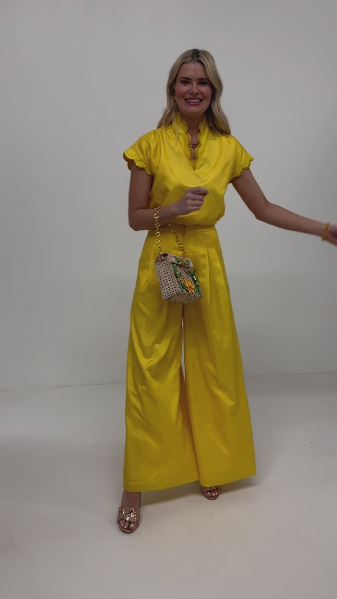 The Orchid Top in Lemon is a cheerful statement piece designed to brighten any wardrobe. Crafted from a lightweight and airy yellow taffeta, it features a scalloped V-neckline and matching scalloped cap sleeves for a touch of playful femininity. The slightly tailored silhouette flatters while remaining easy and breathable, making this top a perfect choice for sunny days, special occasions, or anytime you want to bring the joy. Create a playful, monochromatic pairing with the matching Paisley Pant!