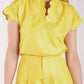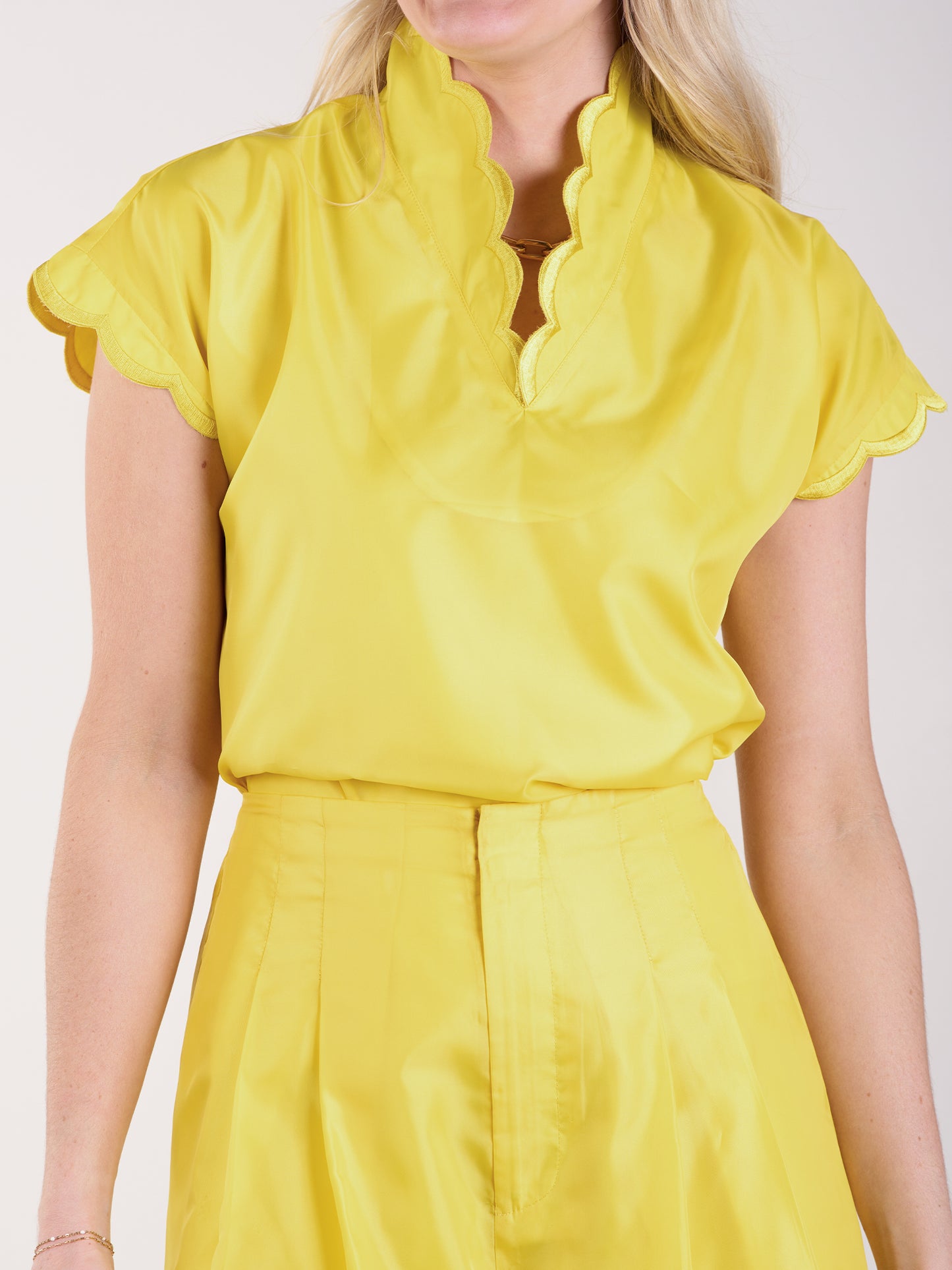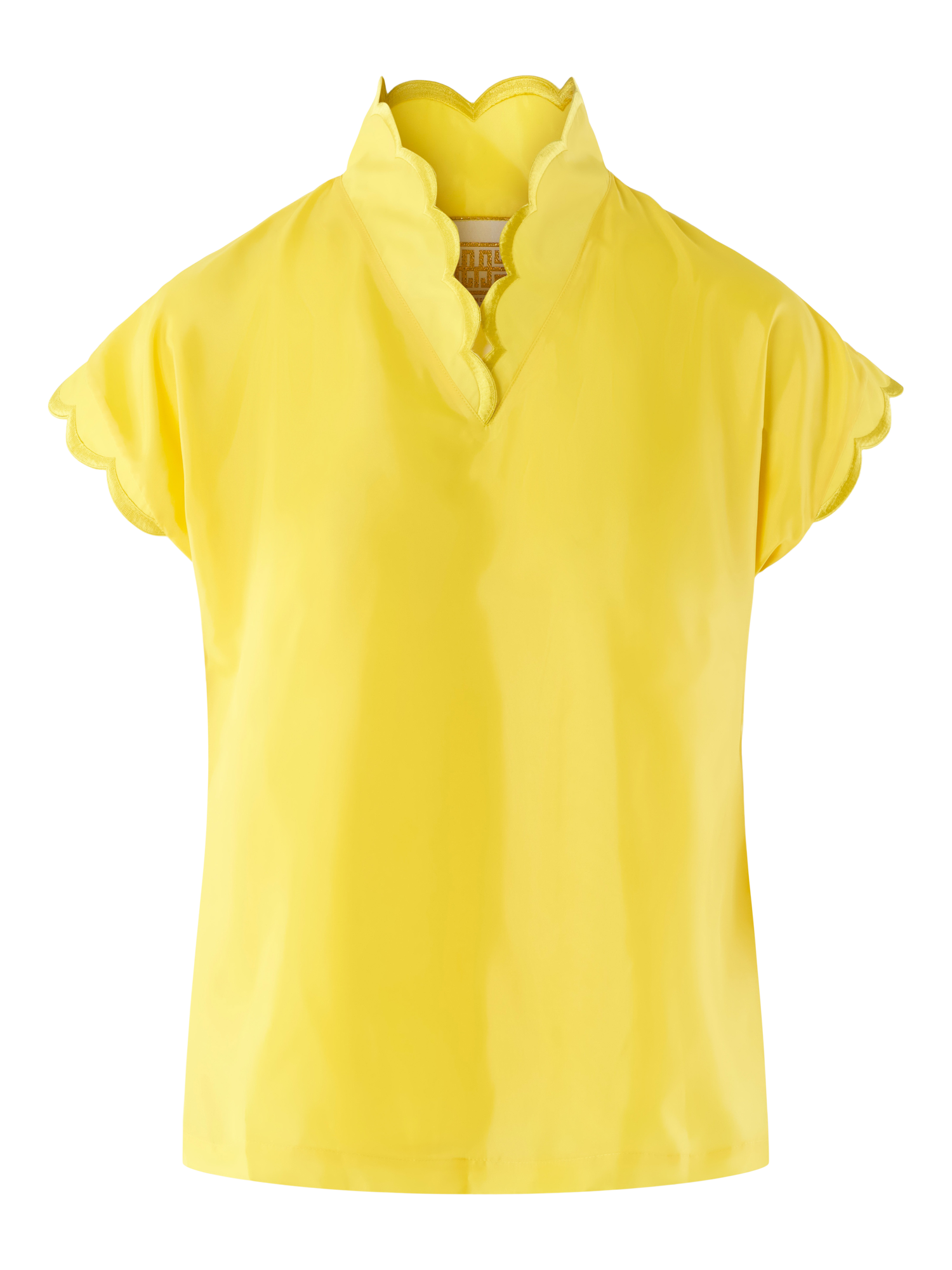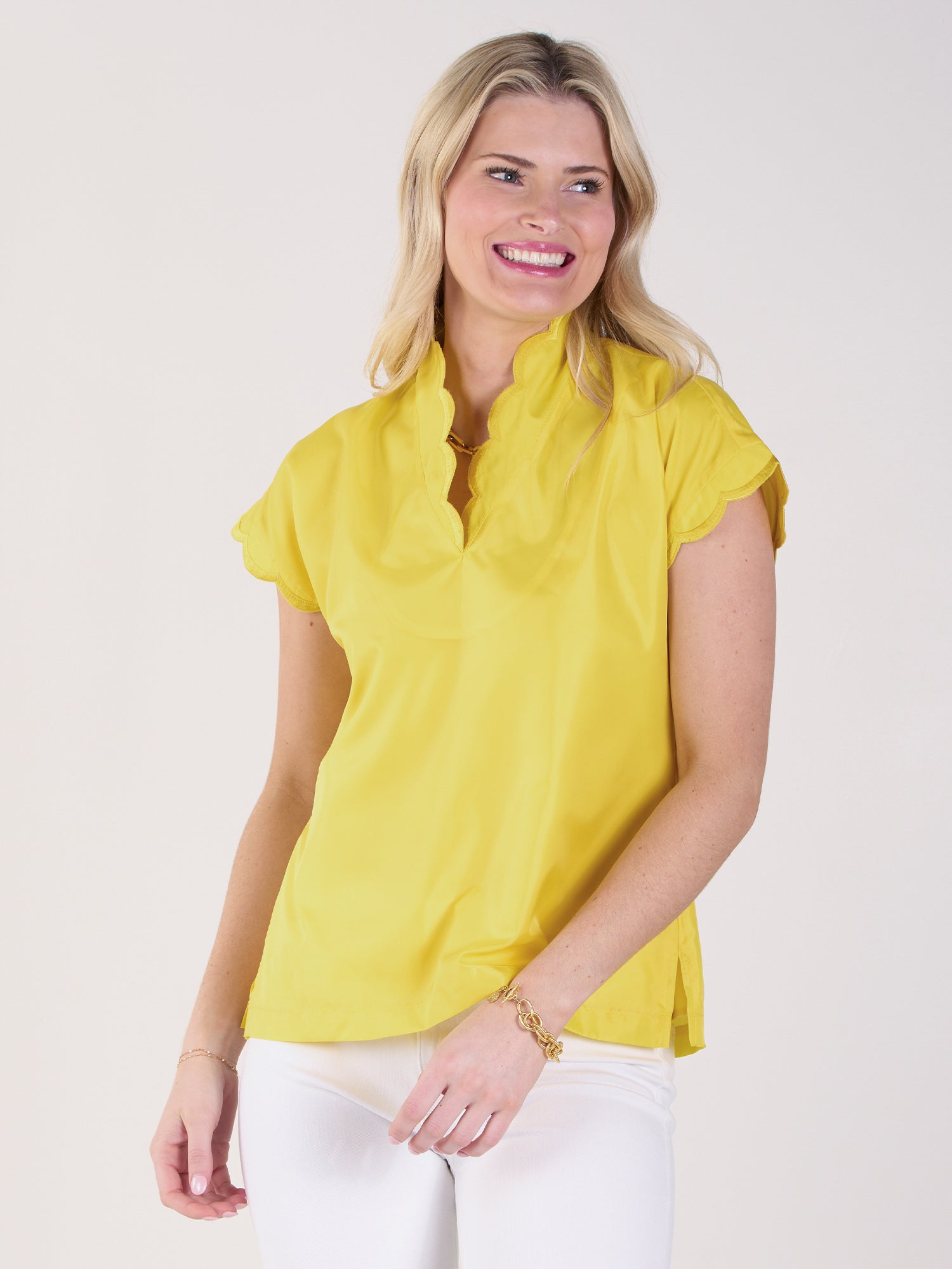 The Orchid Top in Lemon is a cheerful statement piece designed to brighten any wardrobe. Crafted from a lightweight and airy yellow taffeta, it features a scalloped V-neckline and matching scalloped cap sleeves for a touch of playful femininity. The slightly tailored silhouette flatters while remaining easy and breathable, making this top a perfect choice for sunny days, special occasions, or anytime you want to bring the joy. Create a playful, monochromatic pairing with the matching Paisley Pant!
