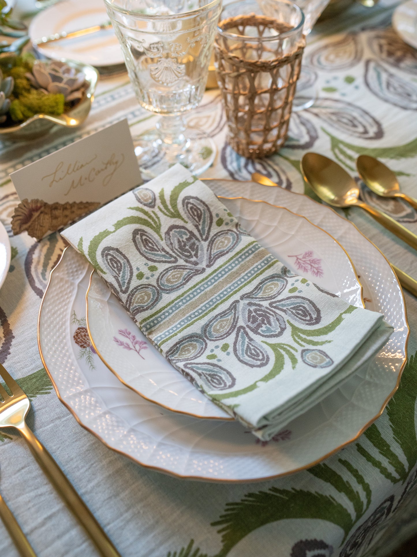 Elevate your place settings with the Oyster Ikat Dinner Napkins, a refined nod to the coast featuring a symmetrical array of oyster motifs in soft, natural tones. Inspired by the texture and rhythm of the shoreline, this pattern brings coastal sophistication to any meal—from casual lunches to elevated dinner parties. For a fully coordinated tablescape, pair with the matching Oyster Ikat tablecloth, table runner, and cocktail napkins. The soothing palette and detailed design layer beautifully with woven accents, fine china, or everyday dinnerware.