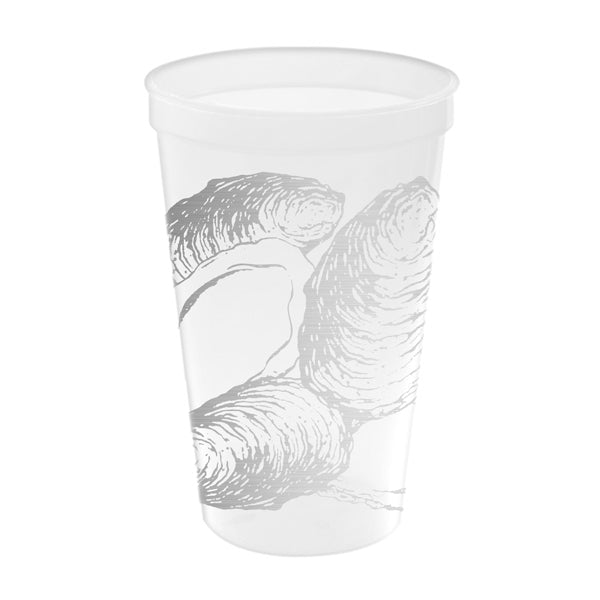 The Oyster Stadium Cups feature a gray oyster design that wraps around the clear plastic surface, with detailed oyster shells covering most of the cup, providing an attractive and reusable beverage solution.