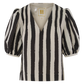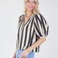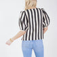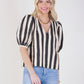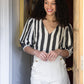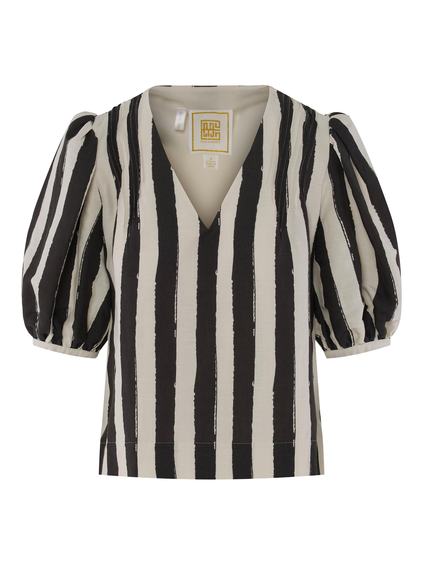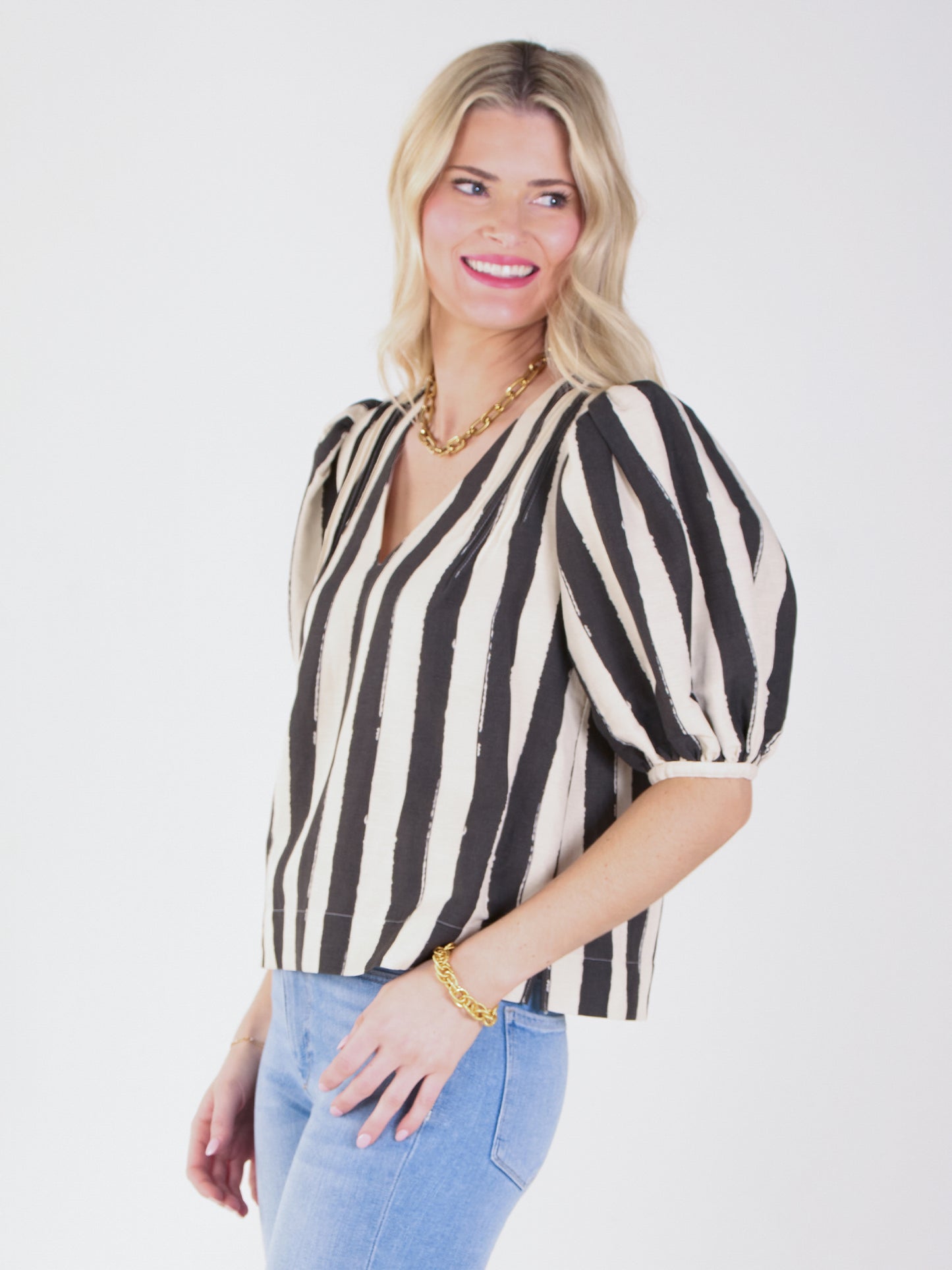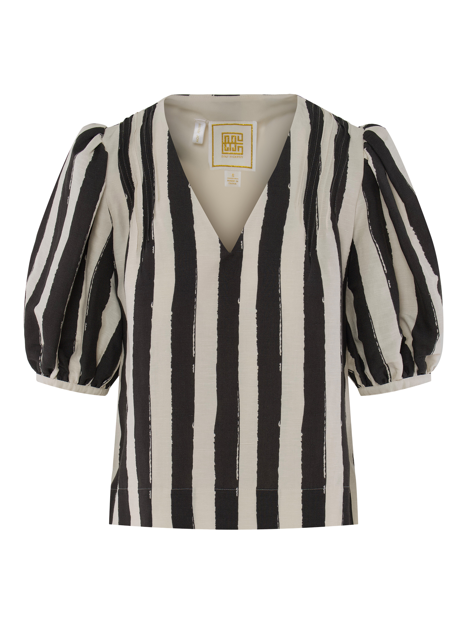 The Penny Top in Stripe Noir showcases voluminous puff sleeves and delicate pin tuck details that frame the V-neckline for a touch of structure and softness. The slightly tailored silhouette flatters while allowing easy movement, making it perfect for both everyday wear and dressier moments. The hand-painted stripe print adds striking contrast, blending simplicity with a contemporary edge that stands out without overpowering. Pair with the matching Saylor Short for a striking two piece set!