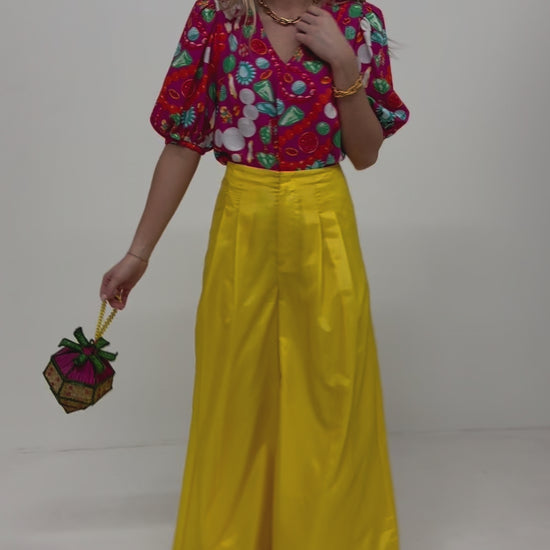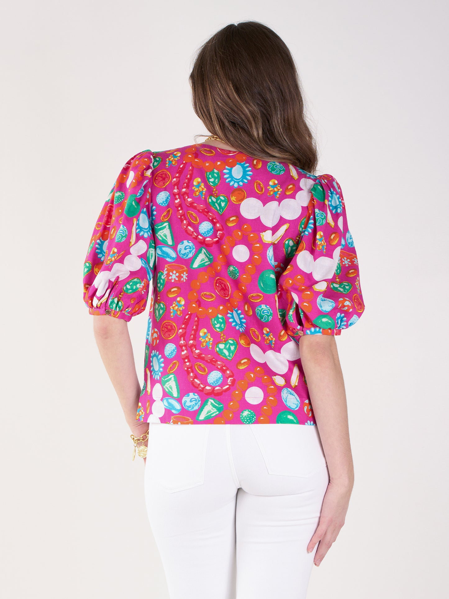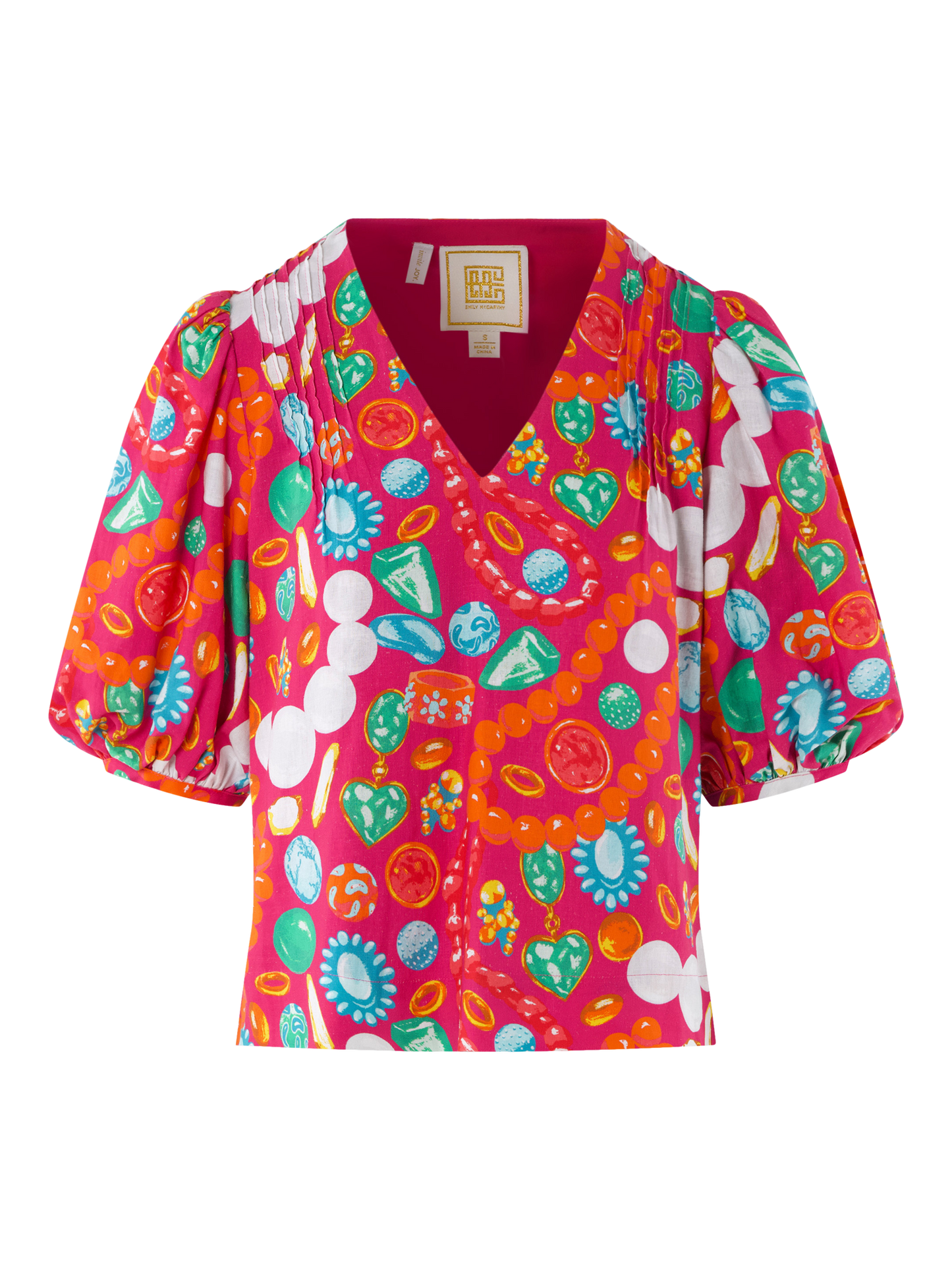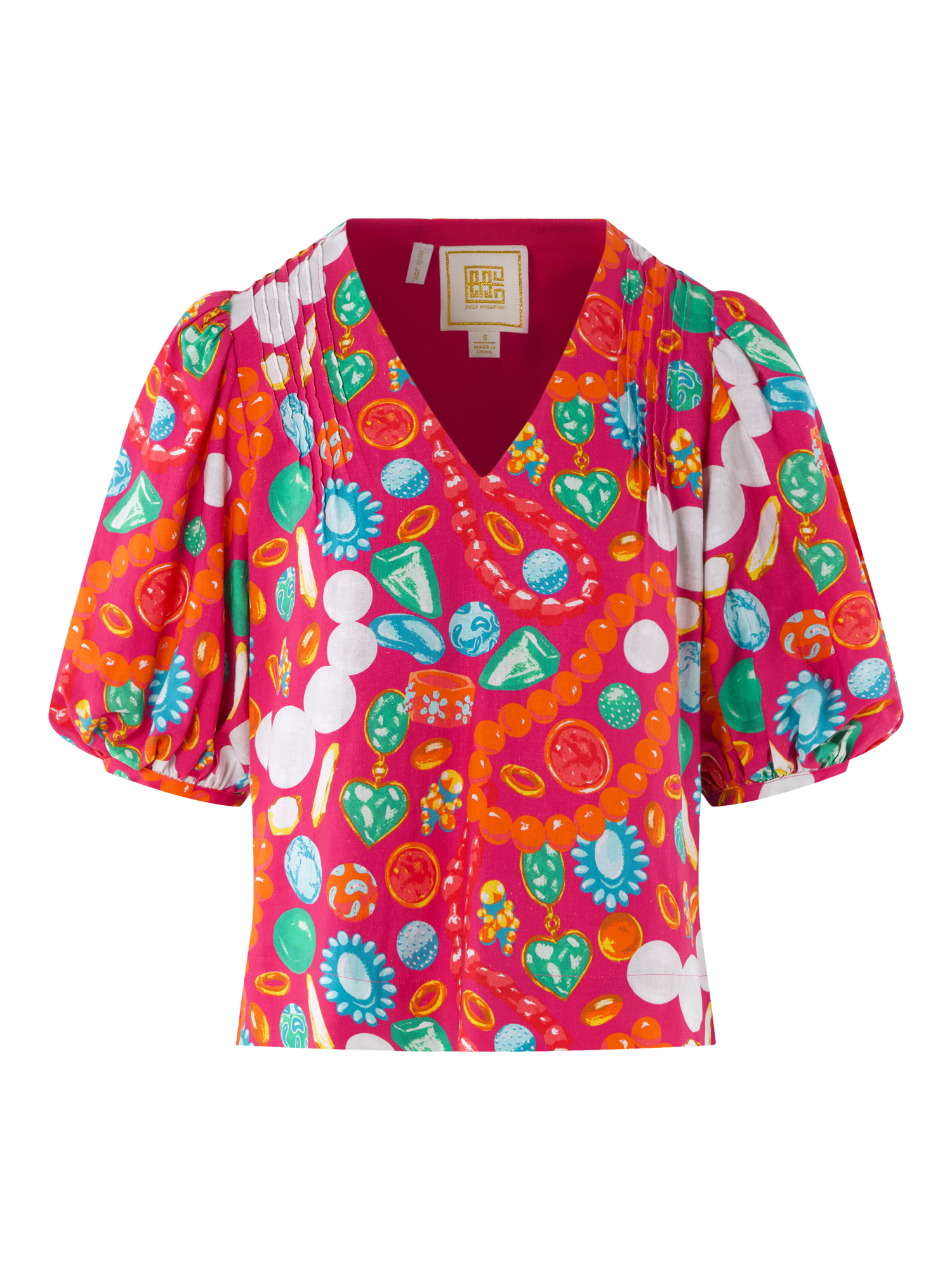 The Penny Top in Jewelry Box is a playful tribute to fashion icon Iris Apfel and her legendary love for accessorizing. Featuring puff sleeves, a flattering V-neckline with delicate pin tuck detailing, and a relaxed, loose-fitting silhouette, this top blends charm with everyday ease. The vibrant Jewelry Box print is a joyful celebration of bold baubles and unapologetic style—perfect for those who believe more is more.