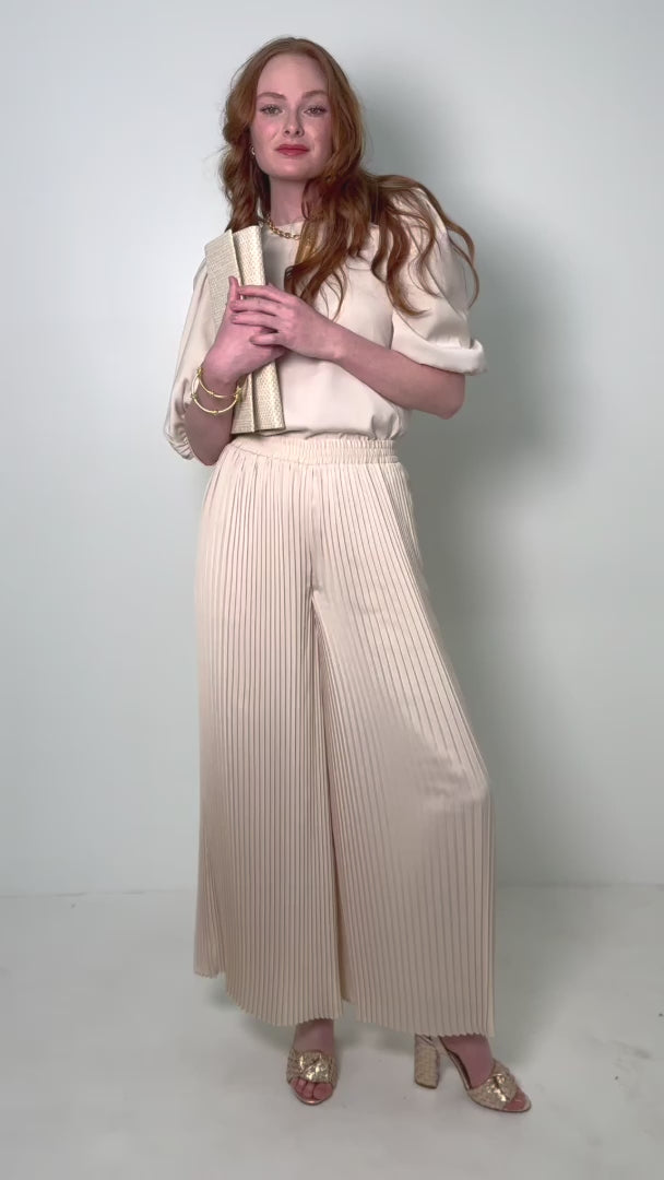 Designed to flatter, the Pleated Pant in Sandshell is covered from top to bottom in delicate pleating, creating a stunning visual texture and a captivating sense of movement. The elastic waistband ensures a comfortable and figure-hugging fit, accentuating your curves, while providing all-day ease. These statement pants effortlessly combine comfort and style, making them a perfect choice for elevating any outfit. Pair with the matching Bella Top for an easy go-to look for any elevated occasion!