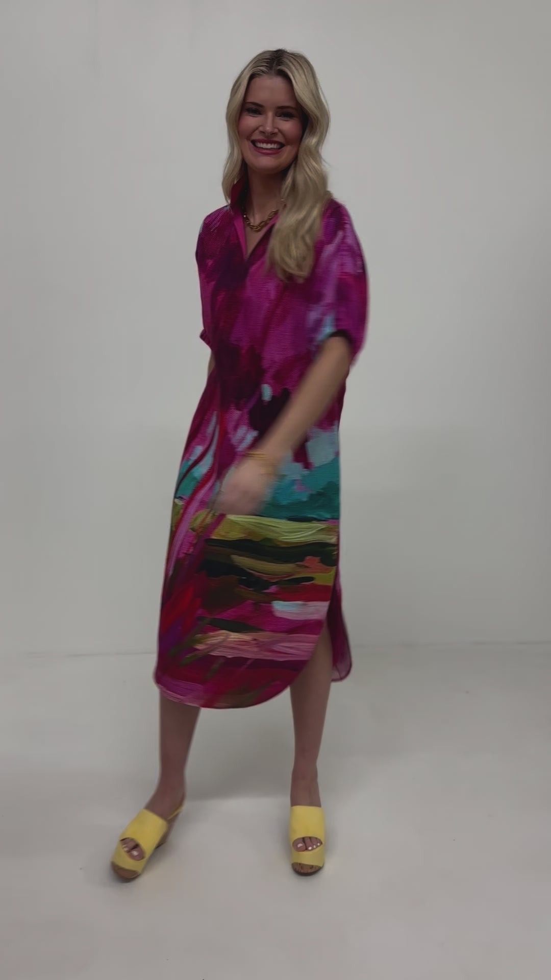 The Poppy Caftan in Bellamy Sunset features a laid-back silhouette with a classic stand collar, loose elastic dolman sleeves, and a curved tail hem for subtle shape and movement. The standout detail is the hand-painted print by Savannah-based artist Bellamy, capturing the rich, layered beauty of a Lowcountry sunset in bold, expressive strokes. The perfect throw-on-and-go dress that can be paired with a sneaker or a heel for effortless and versatile wear.