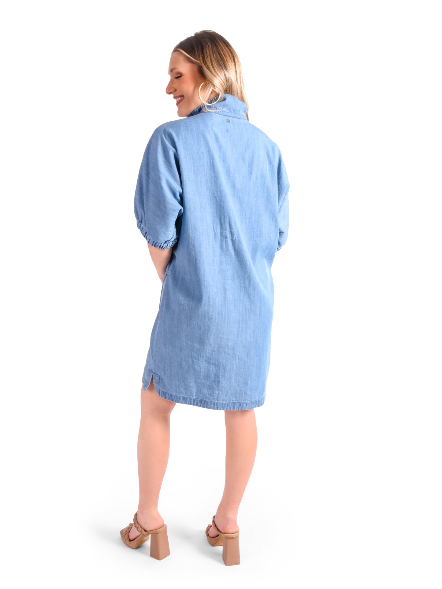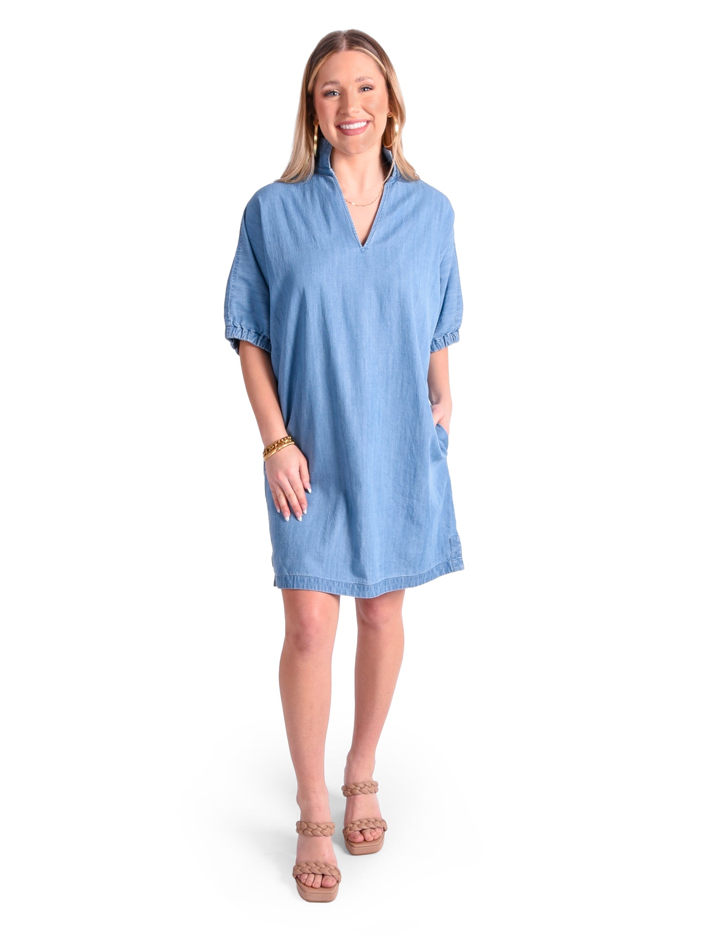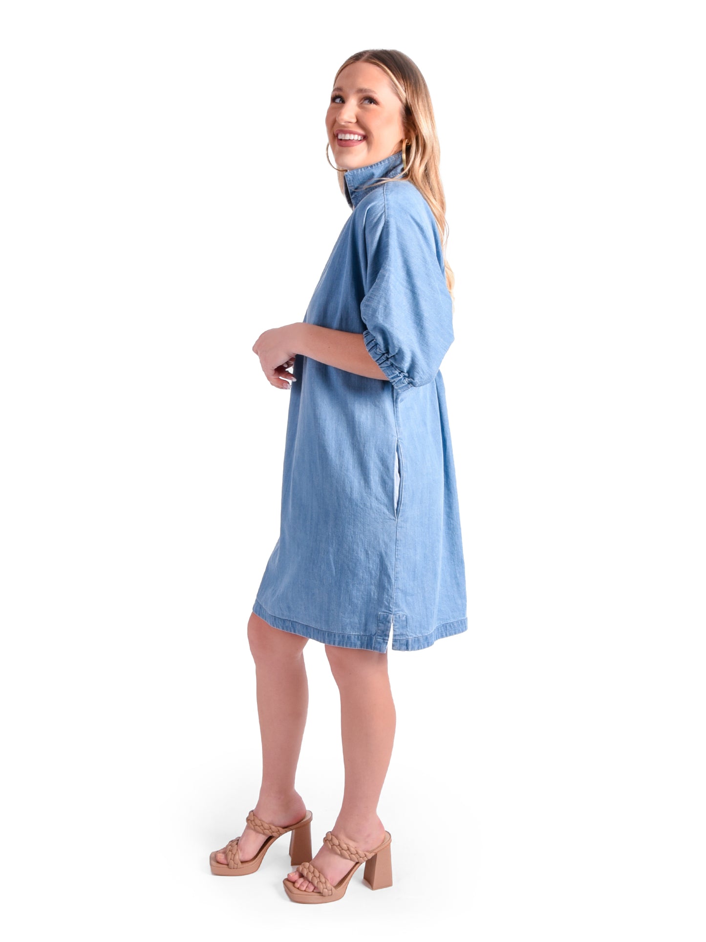 Our signature Poppy Dress in Denim Chambray is perfect for casual days and dressed up evenings. Loose fitting with an optional stand up collar and knee length hem. Dress up with a heel or go casual with a sneaker, the Poppy Dress is versatile for every style!