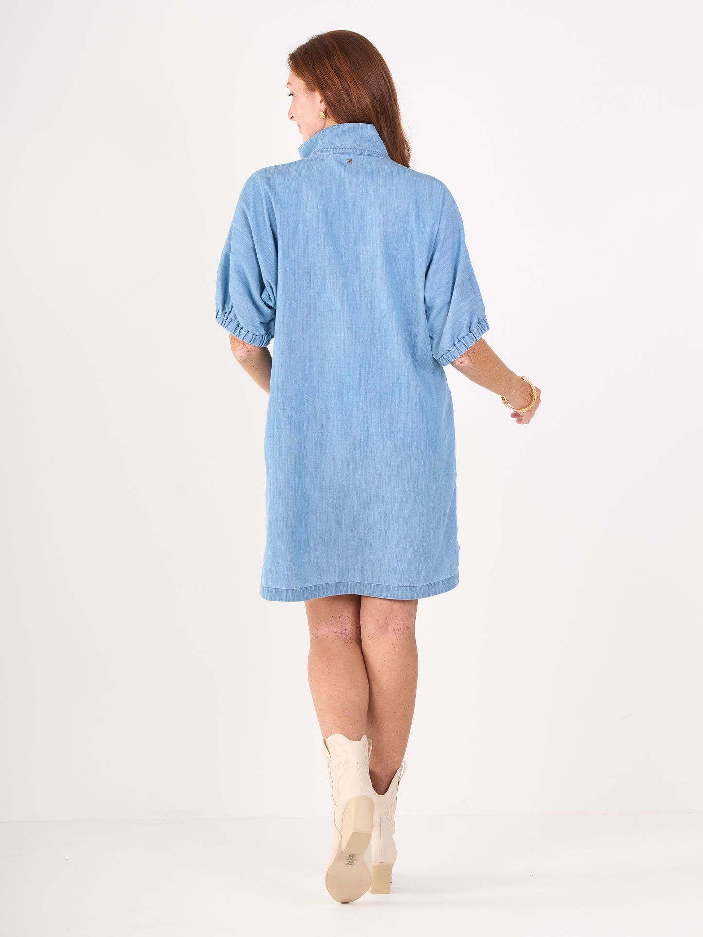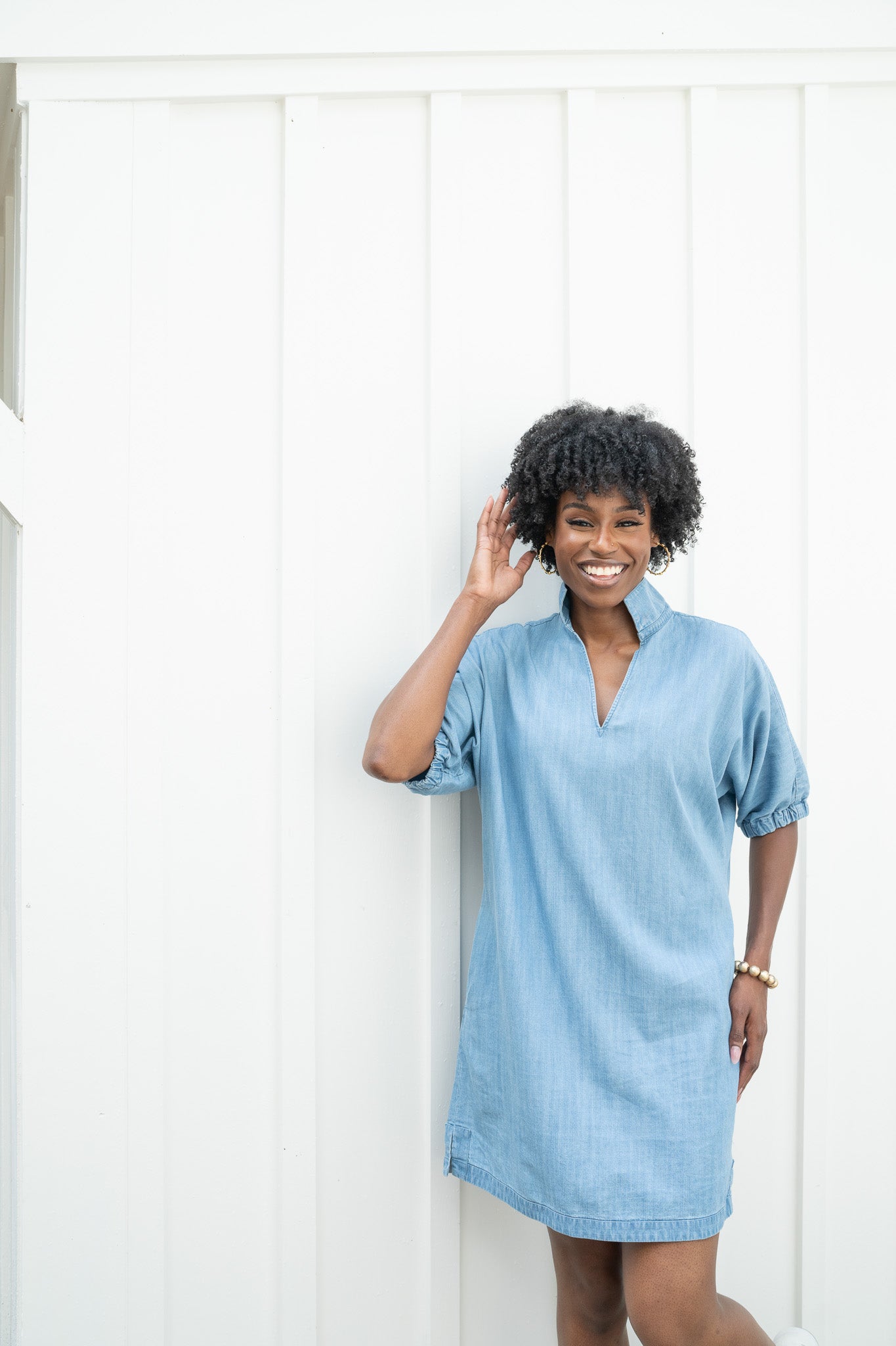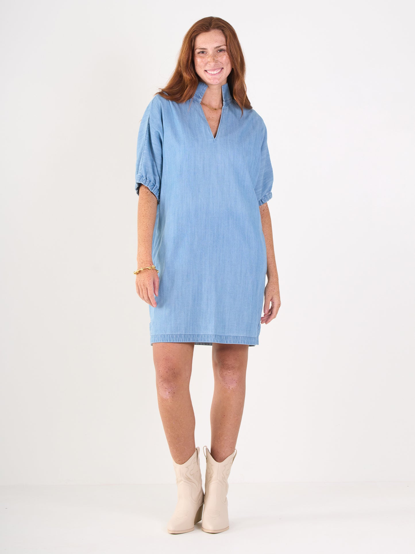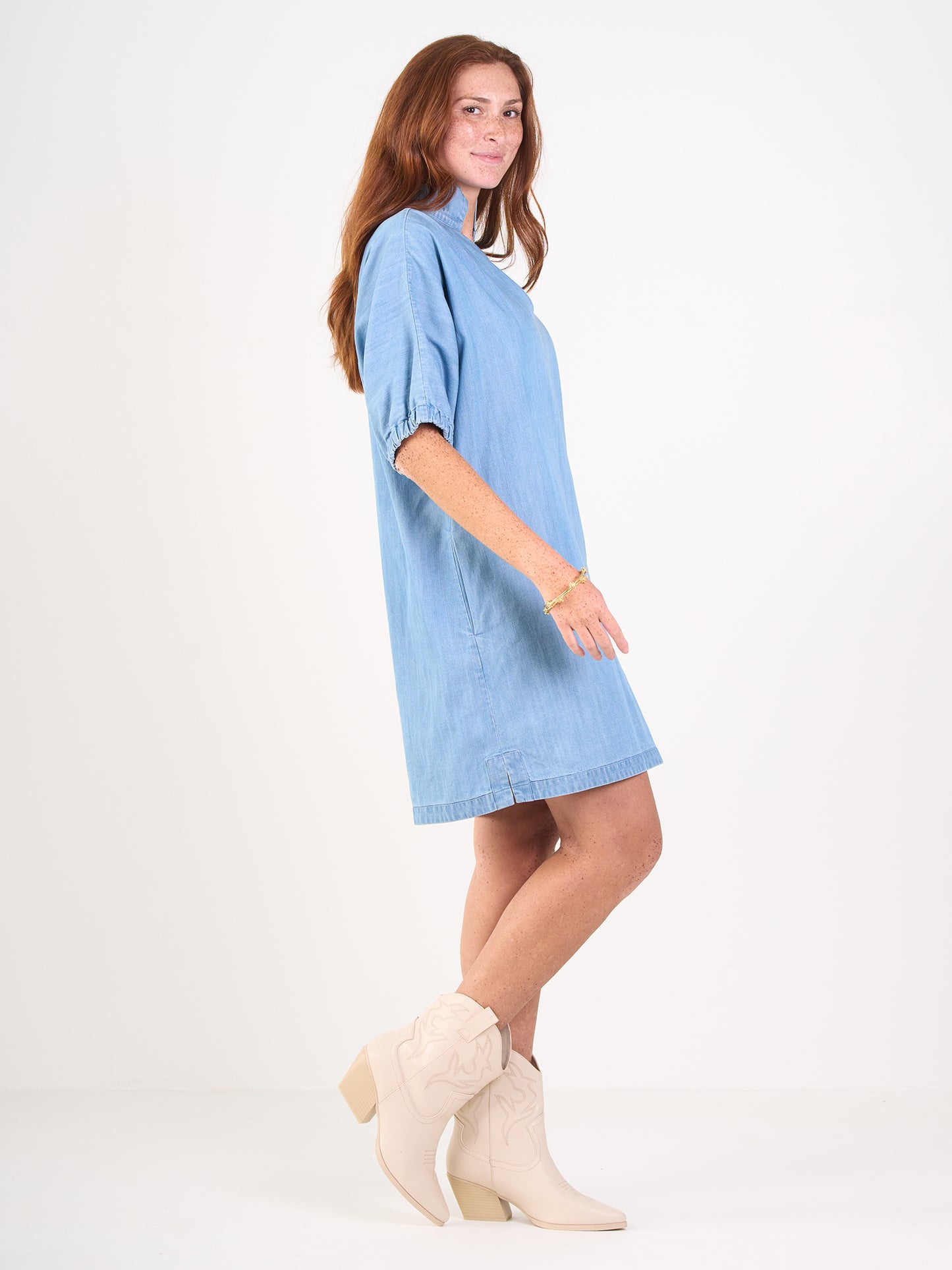 Our signature Poppy Dress in Denim Chambray is perfect for casual days and dressed up evenings. Loose fitting with an optional stand up collar and knee length hem. Dress up with a heel or go casual with a sneaker, the Poppy Dress is versatile for every style!