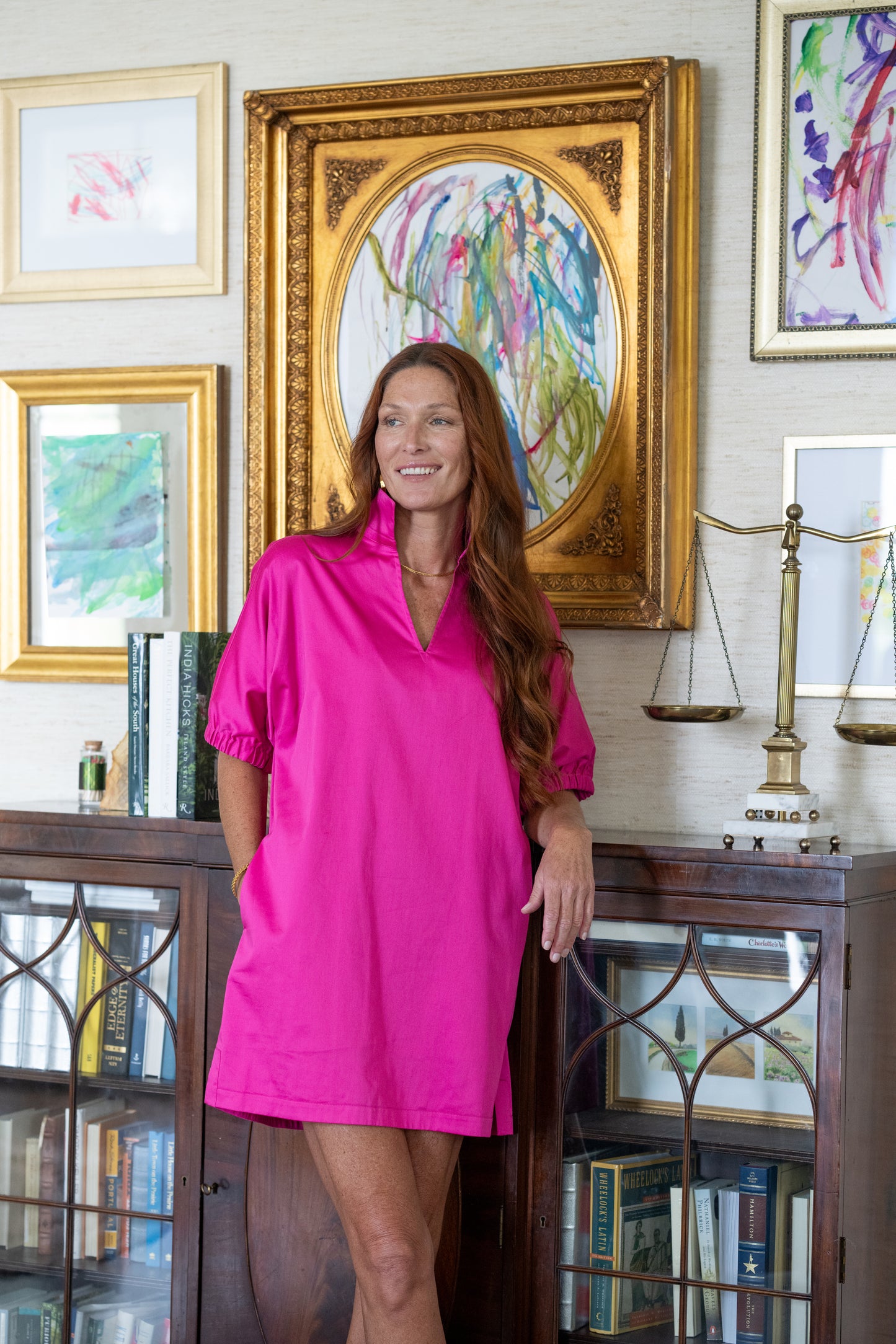 Our tried and true Poppy Dress with a touch of feminine flair! Everyone needs a pink staple piece in their wardrobe, and the Poppy Dress is a classic for just about any occasion. Featuring an optional stand collar, loose dolman sleeves, and side pockets, this piece exudes functional and joyful style. Pair it back with a sneaker for casual wear, or dress it up with a heel and added accessories!