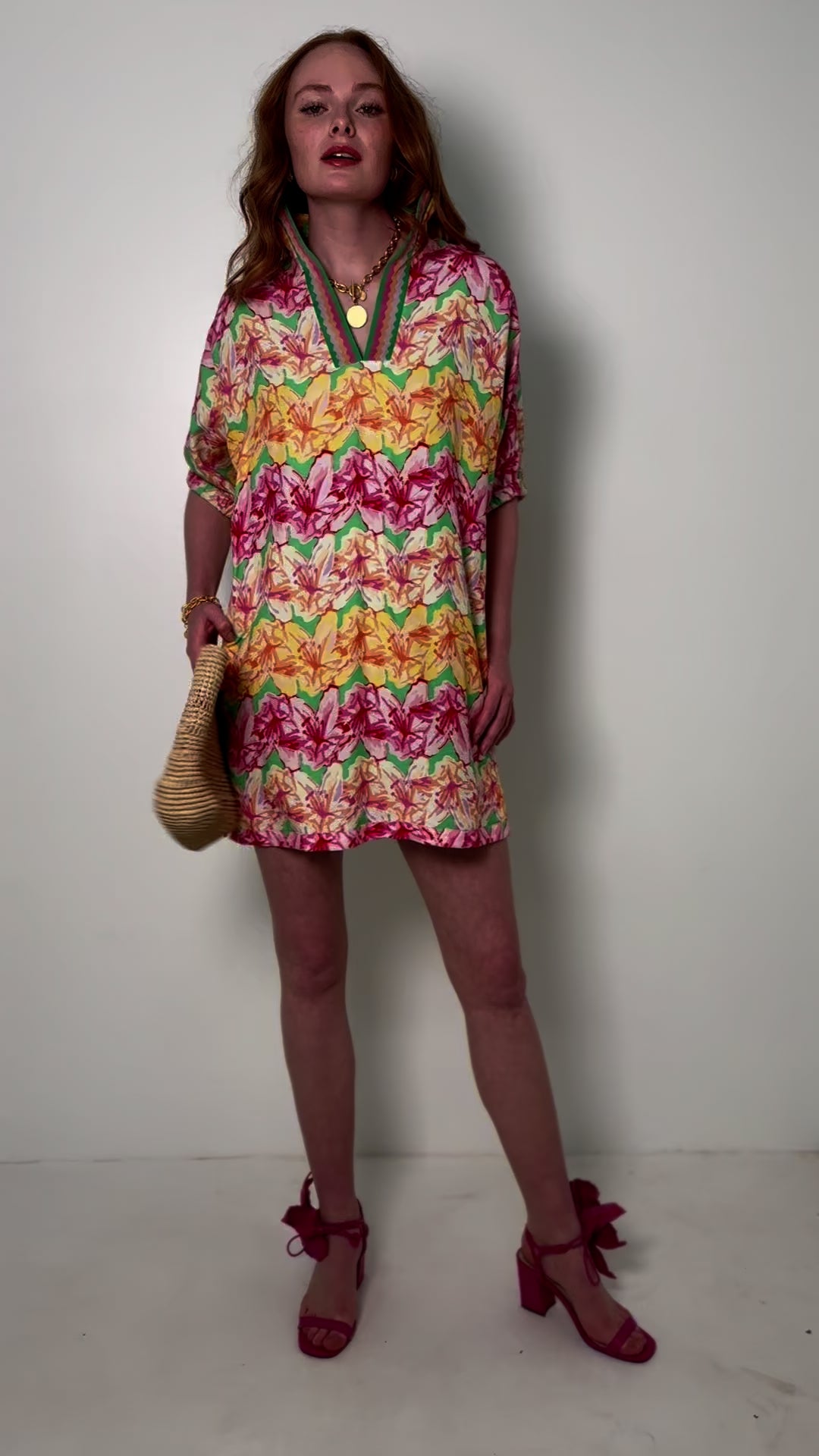Welcome the warmth of spring in the Poppy Dress Azalea! This dress is a celebration of effortless style and vibrant design. The playful print of azaleas in an array of spring hues creates a cheerful and eye-catching look, perfect for brightening your day. Featuring a classic stand collar, this dress adds a touch of refined detail to its relaxed silhouette. The loose elastic dolman sleeves offer comfort and freedom of movement, while the side pockets add a practical touch. The loose fitting silhouette ensures a flattering and comfortable fit for all body types. Elevate your spring style for just about any occasion with this versatile wardrobe essential!