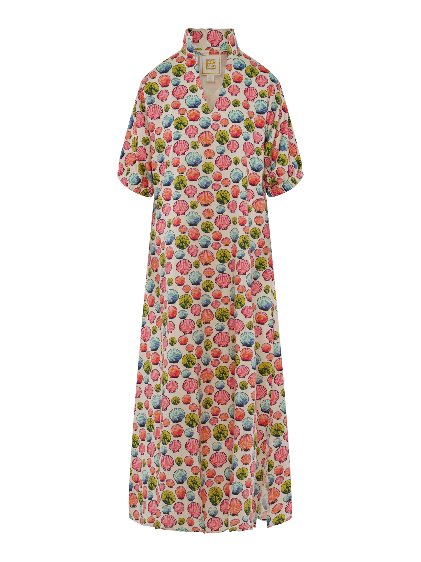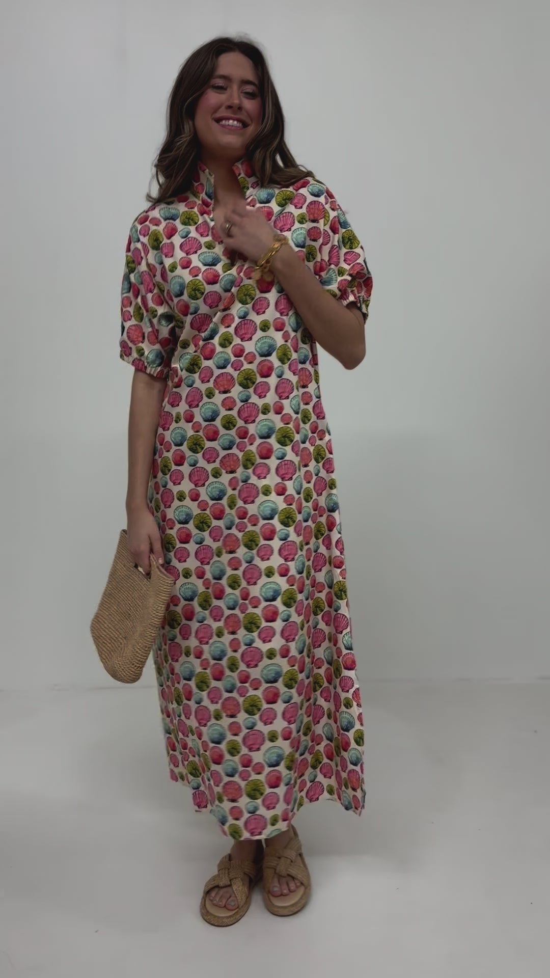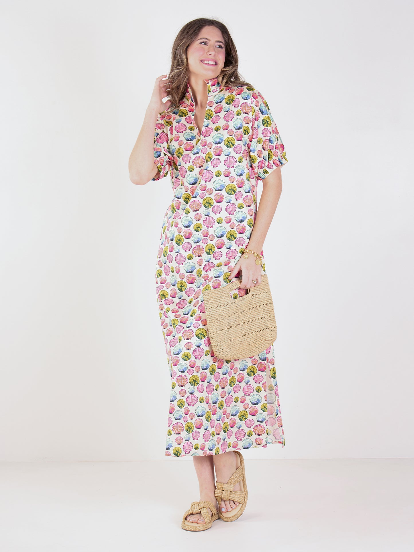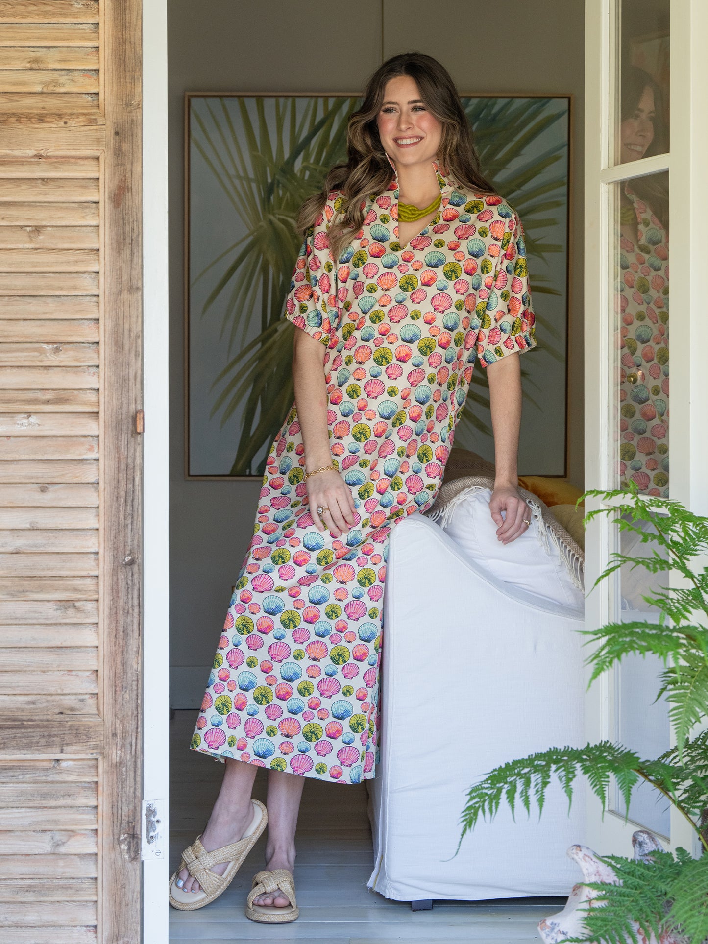 Designed for easy and elevated style, this dress features a classic stand collar, relaxed dolman sleeves with gentle elastic at the cuffs, and a breezy, loose-fitting silhouette. The allover seashell print evokes coastal whimsy, making it a playful and effortless choice for summer escapes and sun-soaked days. Slip on your best summer sandals and enjoy your post beach dinner in style.