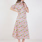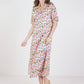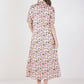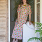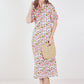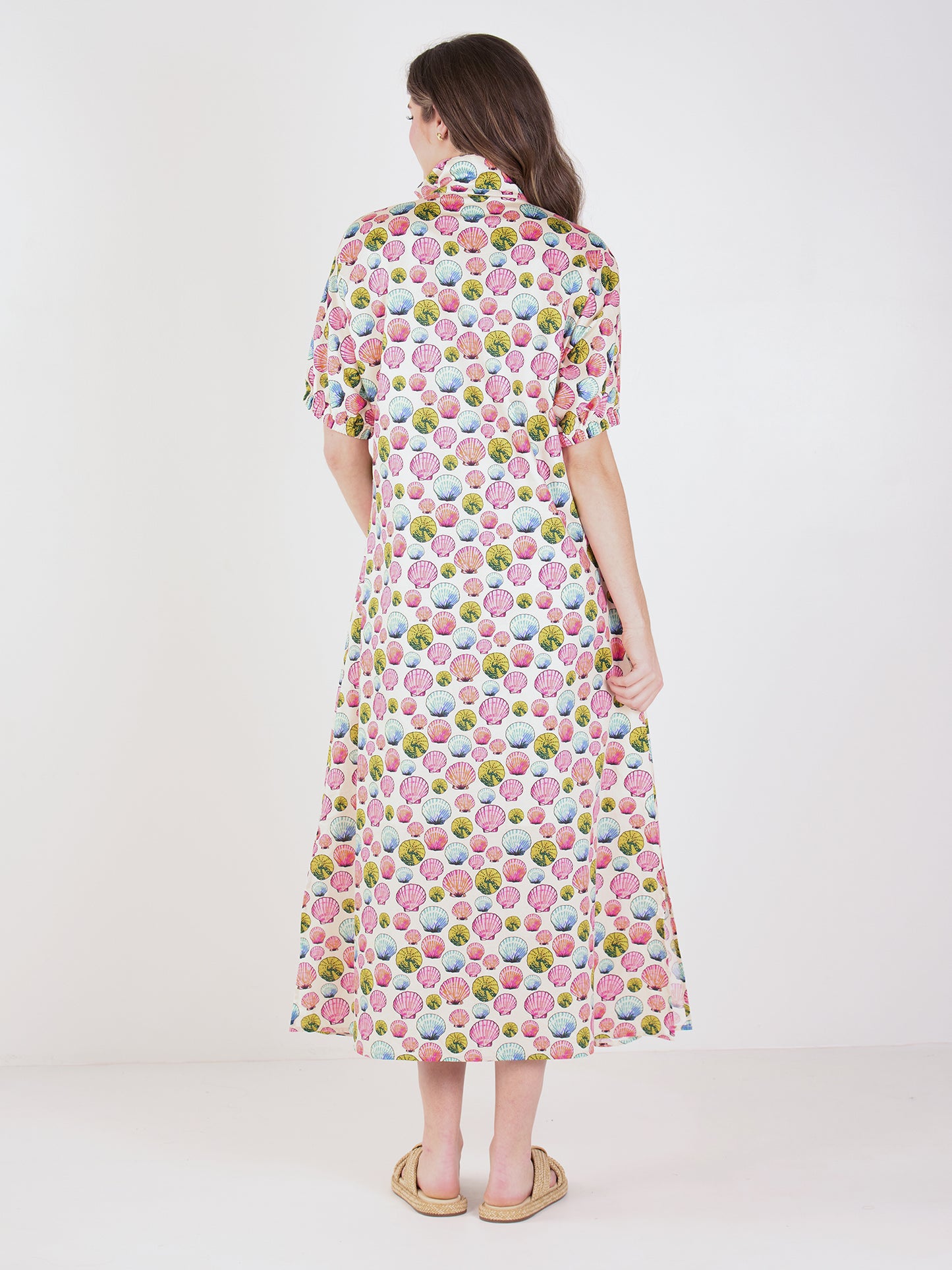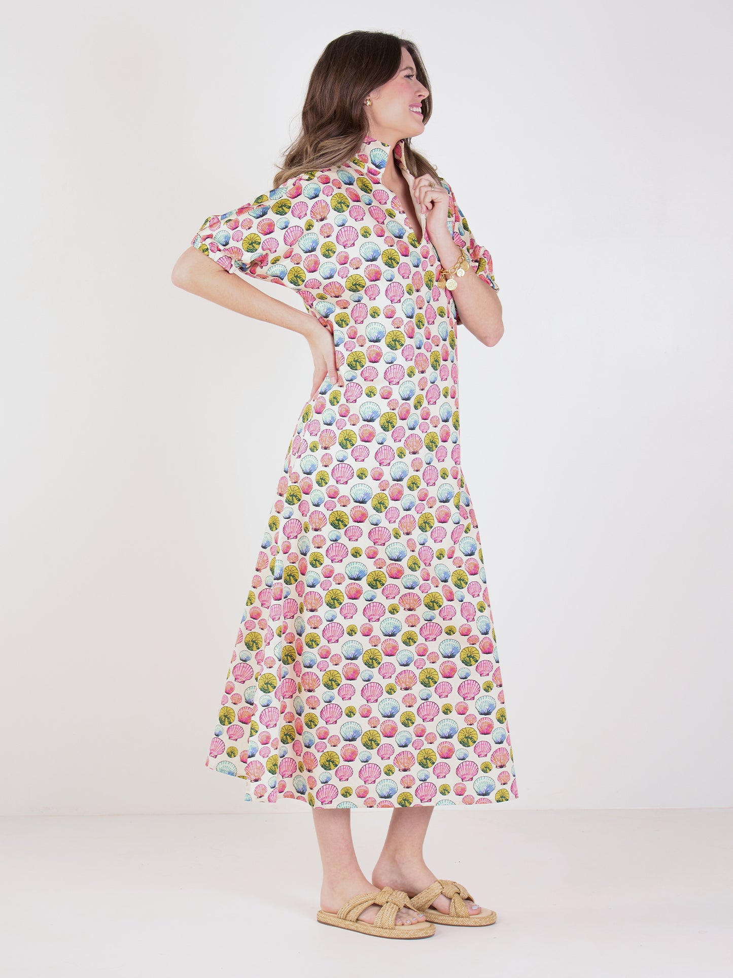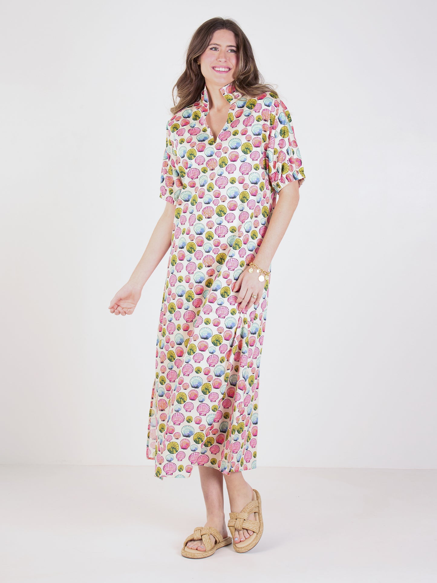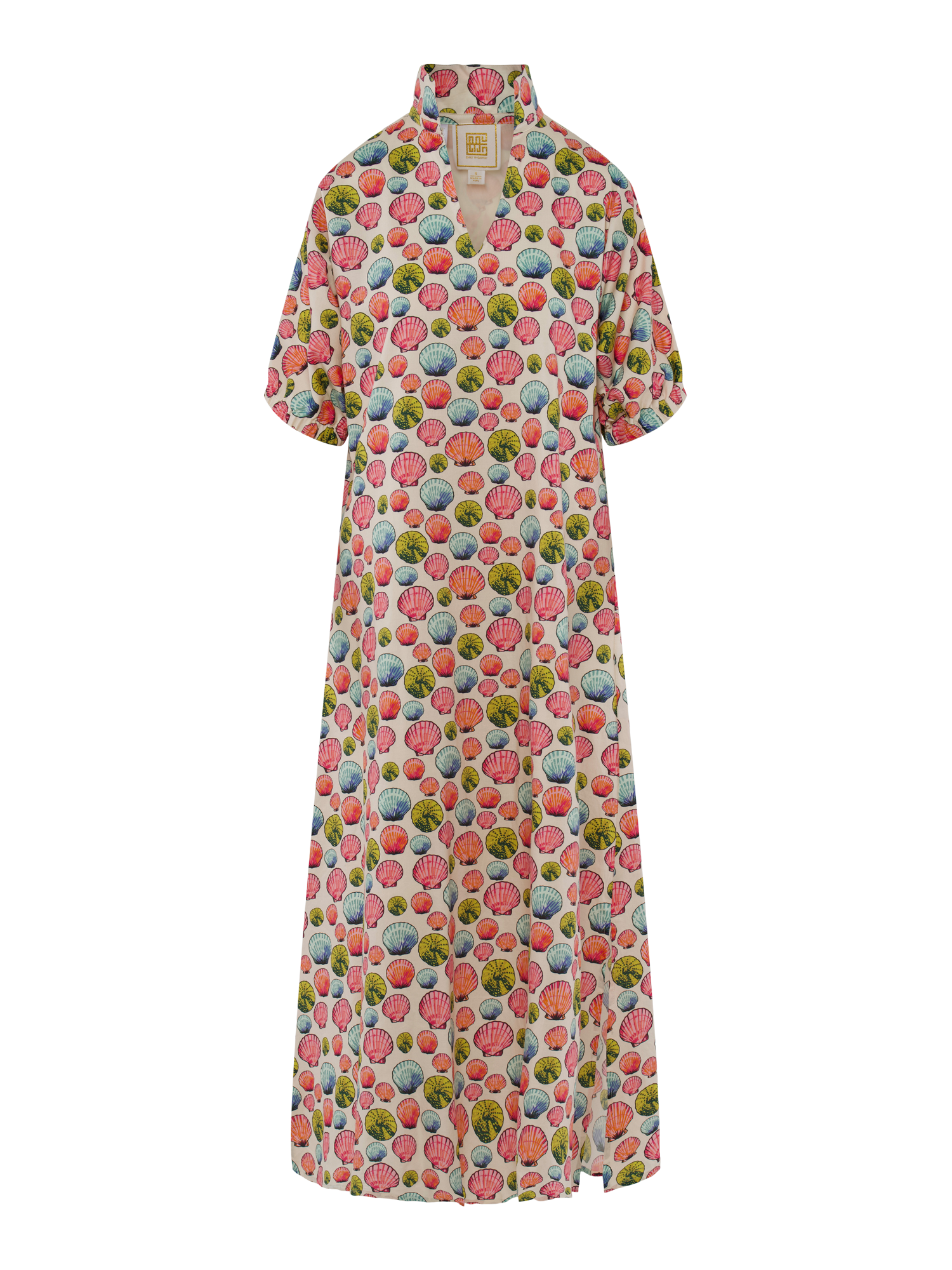 Designed for easy and elevated style, this dress features a classic stand collar, relaxed dolman sleeves with gentle elastic at the cuffs, and a breezy, loose-fitting silhouette. The allover seashell print evokes coastal whimsy, making it a playful and effortless choice for summer escapes and sun-soaked days. Slip on your best summer sandals and enjoy your post beach dinner in style.