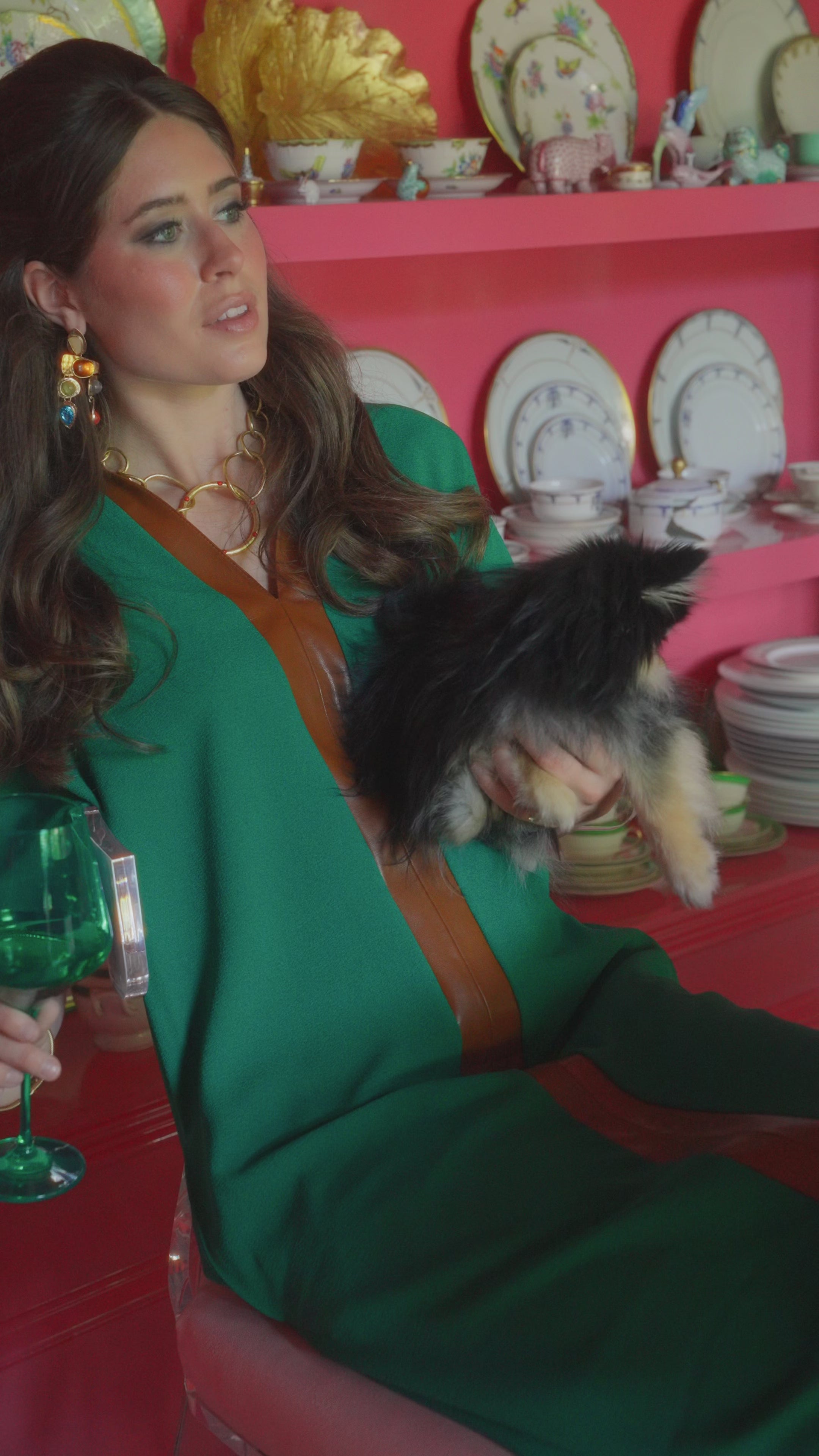 The Poppy Maxi in Green Jacket features a classic stand collar and loose elastic dolman sleeves for a relaxed yet elevated look. Designed with side pockets and a flowing, easy silhouette, this style is accented by a vegan leather stripe that runs along the front, back, and stand collar for a sleek, modern finish.