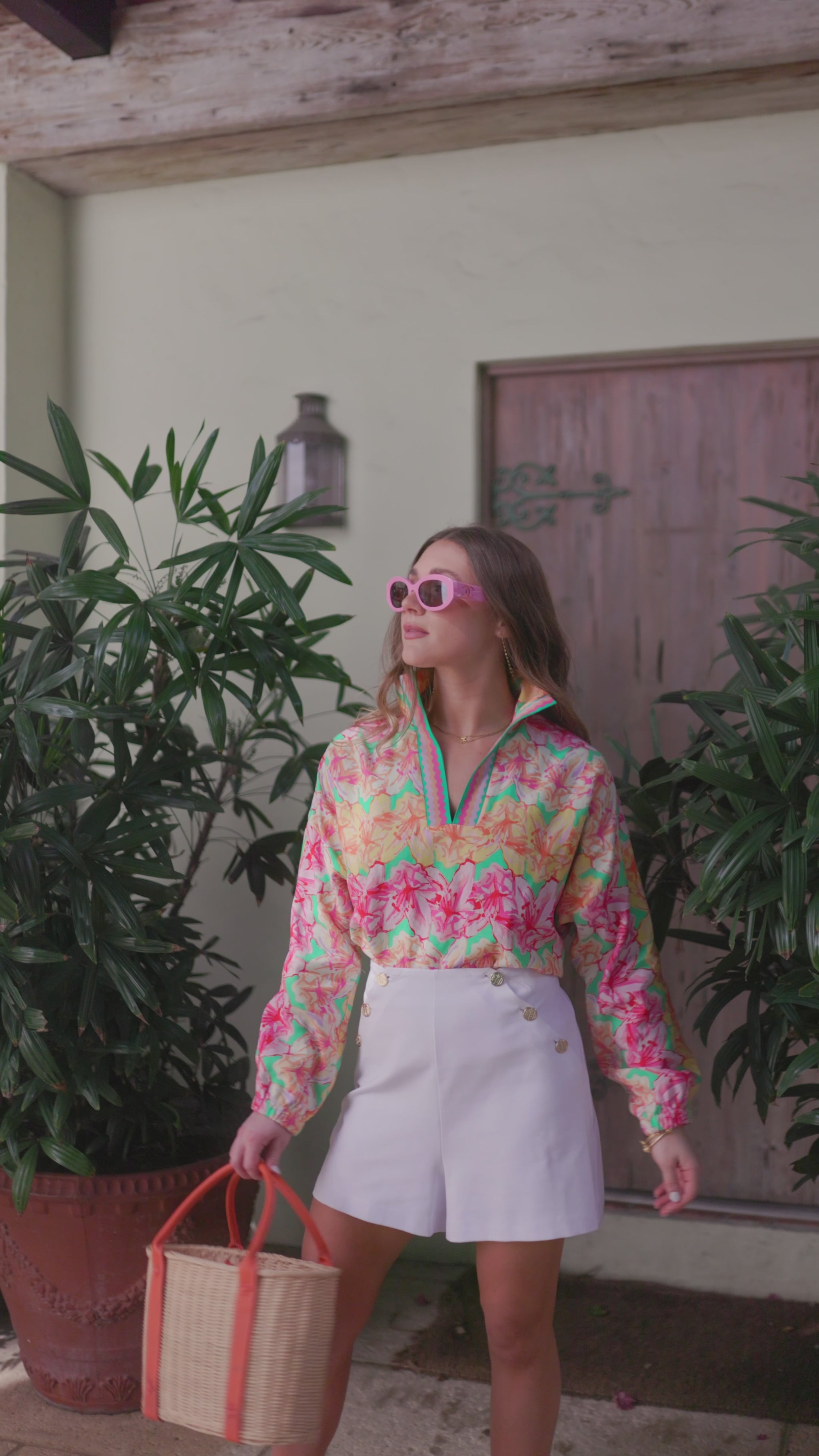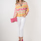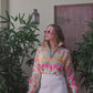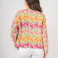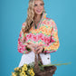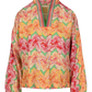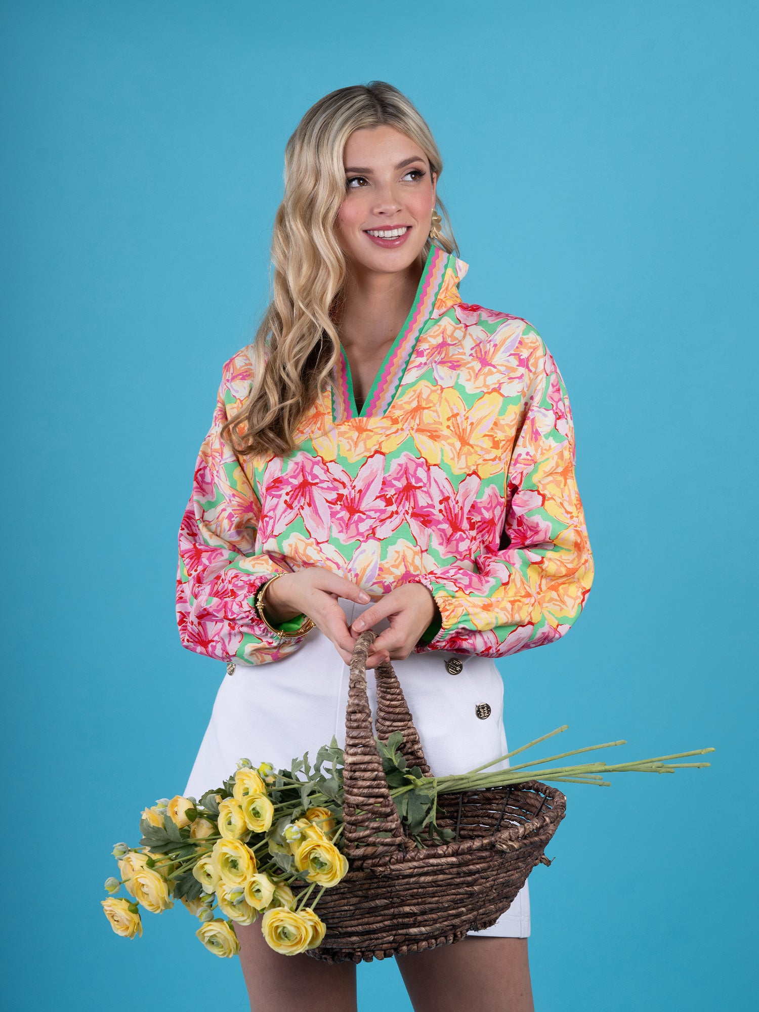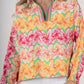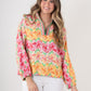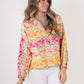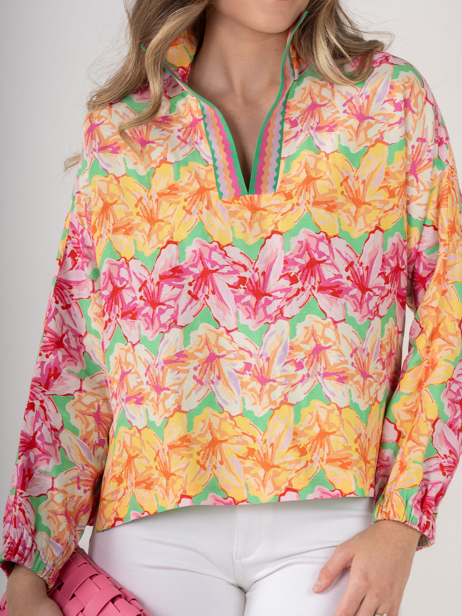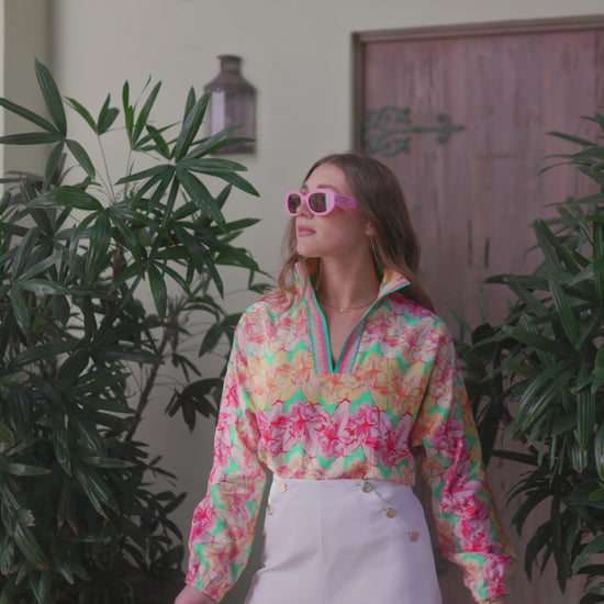 Embrace the vibrant energy of spring with the Poppy Pop-Over Azalea. This top features a captivating pattern of painterly azaleas in a refreshing palette of pinks, oranges, yellows, and soft greens. The lively design brings a burst of botanical beauty to your wardrobe. The classic stand collar, loose-fitting silhouette, and long dolman sleeves create a chic, relaxed look. The elastic cuffs provide a gentle gather, adding subtle volume and a comfortable fit. These bold florals will be your spring wardrobe's best friend!