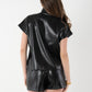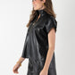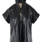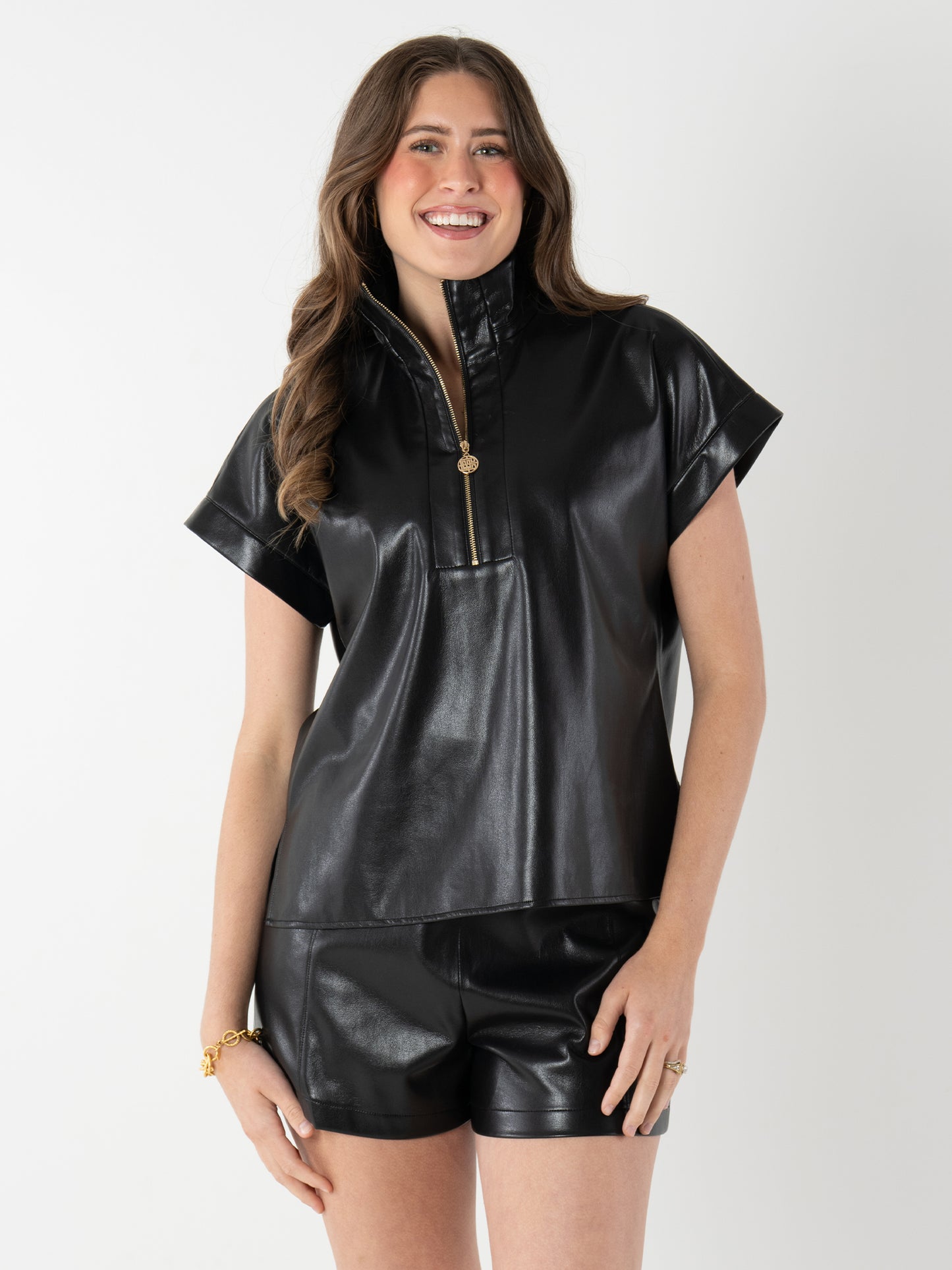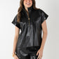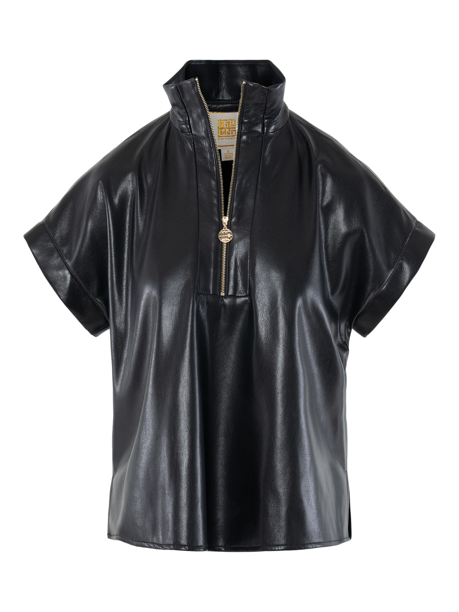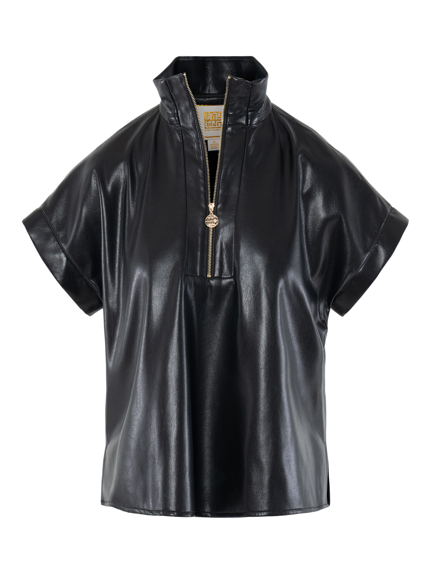Bold and elevated, the Poppy Pullover in Black Vegan Leather offers a modern edge to a classic silhouette. Designed with a structured stand collar, 3/4 zip neckline, and signature gold logo pull, this top features short dolman sleeves for a relaxed yet refined fit. The supple, lightweight vegan leather delivers a sleek look with all-day comfort. Create a sleek matching set with the coordinating Tailored Short!