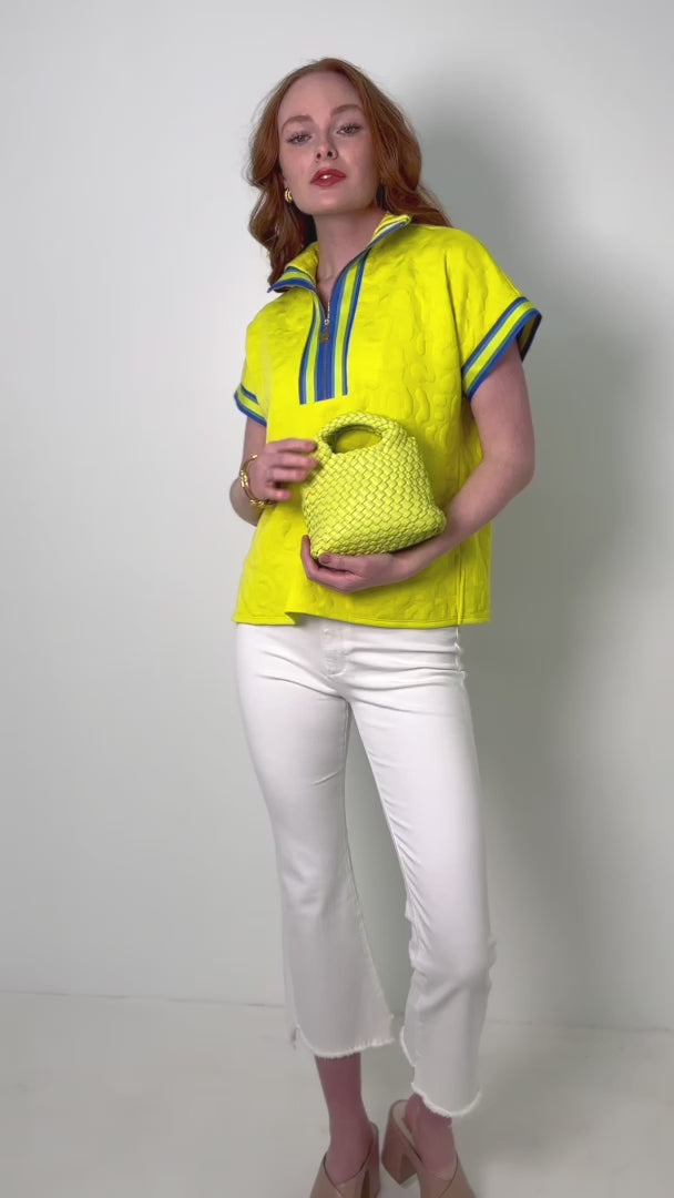 The Poppy Pullover in Key Lime Cheetah features our signature embossed cheetah in a captivating chartreuse with contrasting blue trim. Stay cozy while serving effortless style with it's plush fabrication and sporty silhouette perfect for almost any occasion. Featuring a 3/4 zip neckline complimented with our signature gold pull, short dolman sleeves, and tailored silhouette. Pair with the Ruffle Short in Seaglass to add a pop of coordinating color to your look!