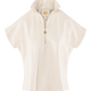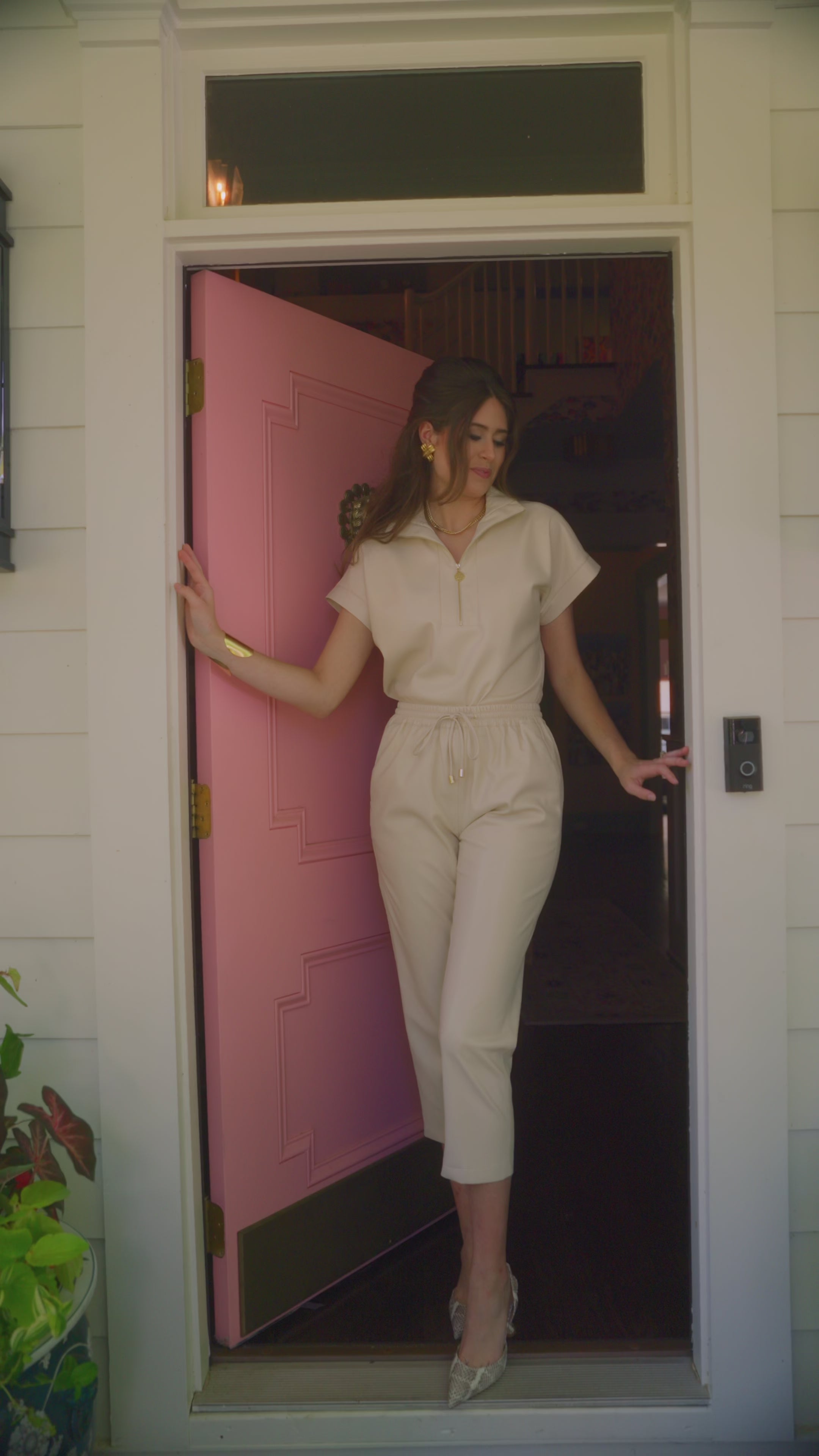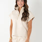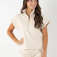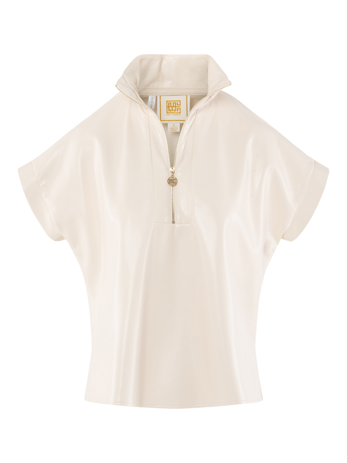 A fresh update to a signature silhouette, the Poppy Pullover in Sandshell Vegan Leather features a stand collar with a 3/4 zip neckline and our signature gold logo pull. Short dolman sleeves add ease, while the buttery soft, lightweight vegan leather offers both structure and comfort. Polished yet practical, this top is the perfect piece for transitioning into fall with effortless style. Pair with the coordinating Tailored Short for an easy and polished matching set.